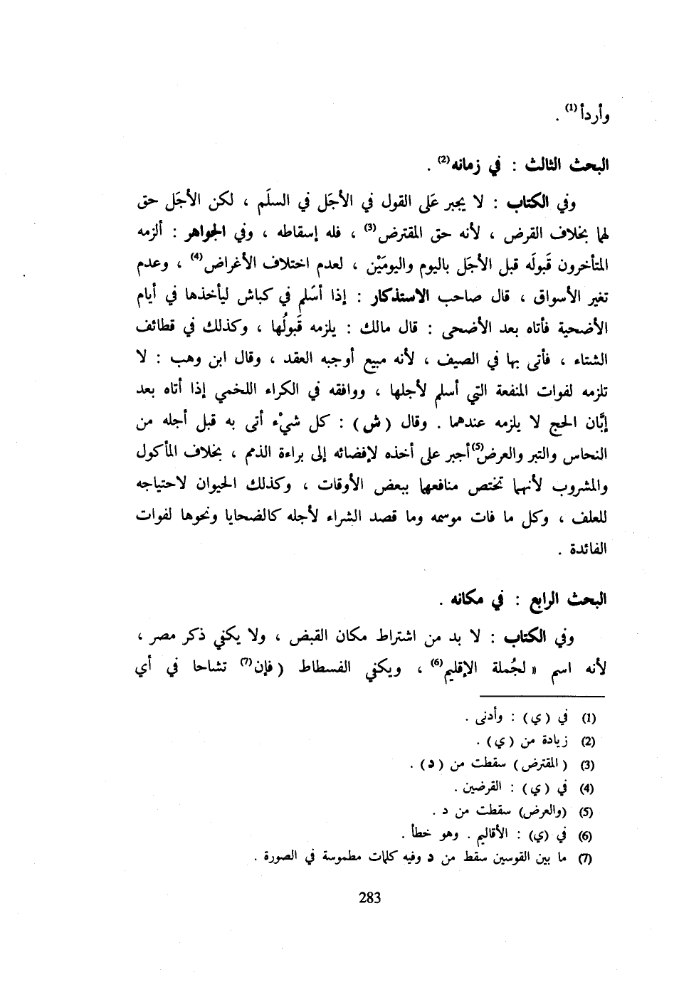 وَأَرْدَأَ الْبَحْثُ الثَّالِثُ: فِي زَمَانِهِ وَفِي الْكِتَابِ: لَا يجْبر على القَوْل فِي الْأَجَلِ فِي السَّلَمِ لَكَنَّ الْأَجَلَ حَقٌّ لَهُمَا بِخِلَافِ الْقَرْضِ لِأَنَّهُ حَقُّ الْمُقْتَرِضِ فَلَهُ إِسْقَاطُهُ وَفِي الْجَوَاهِرِ: أَلْزَمُهُ الْمُتَأَخِّرُونَ قَبُولَهُ قَبْلَ الْأَجَلِ بِالْيَوْمِ وَالْيَوْمَيْنِ لِعَدَمِ اخْتِلَافِ الْأَغْرَاضِ وَعَدَمِ تَغَيُّرِ الْأَسْوَاقِ قَالَ صَاحِبُ الِاسْتِذْكَارِ: إِذَا أَسْلَمَ فِي كِبَاشٍ لِيَأْخُذَهَا فِي أَيَّامِ الْأُضْحِيَّةِ فَأَتَاهُ بَعْدَ الْأَضْحَى: قَالَ مَالِكٌ: يَلْزَمُهُ قَبُولُهَا وَكَذَلِكَ فِي قَطَائِفِ الشِّتَاءِ فَأَتَى بِهَا فِي الصَّيْفِ لِأَنَّهُ مَبِيعٌ أَوْجَبَهُ الْعَقْدُ وَقَالَ ابْنُ وَهْبٍ: لَا تَلْزَمُهُ لِفَوَاتِ الْمَنْفَعَةِ الَّتِي أَسْلَمَ لِأَجْلِهَا وَوَافَقَهُ فِي الْكِرَاءِ اللَّخْمِيُّ إِذَا أَتَاهُ بَعْدَ إِبَّانِ الْحَجِّ لَا يَلْزَمُهُ عِنْدَهُمَا وَقَالَ (ش) : كُلُّ شَيْءٍ أَتَى بِهِ قَبْلَ أَجَلِهِ مِنَ النُّحَاسِ وَالتِّبْرِ وَالْعَرْضِ أُجْبِرَ عَلَى أَخْذِهِ لِإِفْضَائِهِ إِلَى بَرَاءَةِ الذِّمَمِ بِخِلَافِ الْمَأْكُولِ وَالْمَشْرُوبِ لِأَنَّهُمَا تَخْتَصُّ مَنَافِعُهُمَا بِبَعْضِ الْأَوْقَاتِ وَكَذَلِكَ الْحَيَوَانُ لِاحْتِيَاجِهِ لِلْعَلَفِ وَكُلُّ مَا فَاتَ مَوْسِمُهُ وَمَا قُصِدَ الشِّرَاءُ لِأَجْلِهِ كَالضَّحَايَا وَنَحْوِهَا لِفَوَاتِ الْفَائِدَةِ الْبَحْثُ الرَّابِعُ: فِي مَكَانِهِ وَفِي الْكِتَابِ: لَا بُدَّ مِنَ اشْتِرَاطِ مَكَانِ الْقَبْضِ وَلَا يَكْفِي ذِكْرُ مِصْرَ لِأَنَّهُ اسْمٌ " لجُملة الْإِقْلِيمِ وَيَكْفِي الْفُسْطَاطُ (فَإِنْ تَشَاحَّا فِي أَيِّ