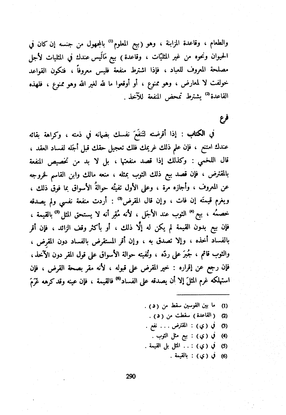 وَالطَّعَامِ وَقَاعِدَةِ الْمُزَابَنَةِ وَهُوَ (بَيْعُ الْمَعْلُومِ بِالْمَجْهُولِ مِنْ جِنْسِهِ إِنْ كَانَ فِي الْحَيَوَانِ وَنَحْوِهِ مِنْ غَيْرِ الْمِثْلِيَّاتِ وَقَاعِدَةِ) بَيْعِ مَا لَيْسَ عِنْدَكَ فِي الْمِثْلِيَّاتِ لِأَجْلِ مُصْلِحَةِ الْمَعْرُوفِ لِلْعِبَادِ فَإِذَا اشْتَرَطَ مَنْفَعَةً فَلَيْسَ مَعْرُوفًا فَتَكُونُ الْقَوَاعِدُ خُولِفَتْ لَا لِمُعَارِضٍ وَهُوَ مَمْنُوعٌ أَوْ أَوْقَعُوا مَا لِلَّهِ لِغَيْرِ اللَّهِ وَهُوَ مَمْنُوعٌ فَلِهَذِهِ الْقَاعِدَةِ يُشْتَرَطُ تَمَحُّضُ الْمَنْفَعَةِ لِلْآخِذِ