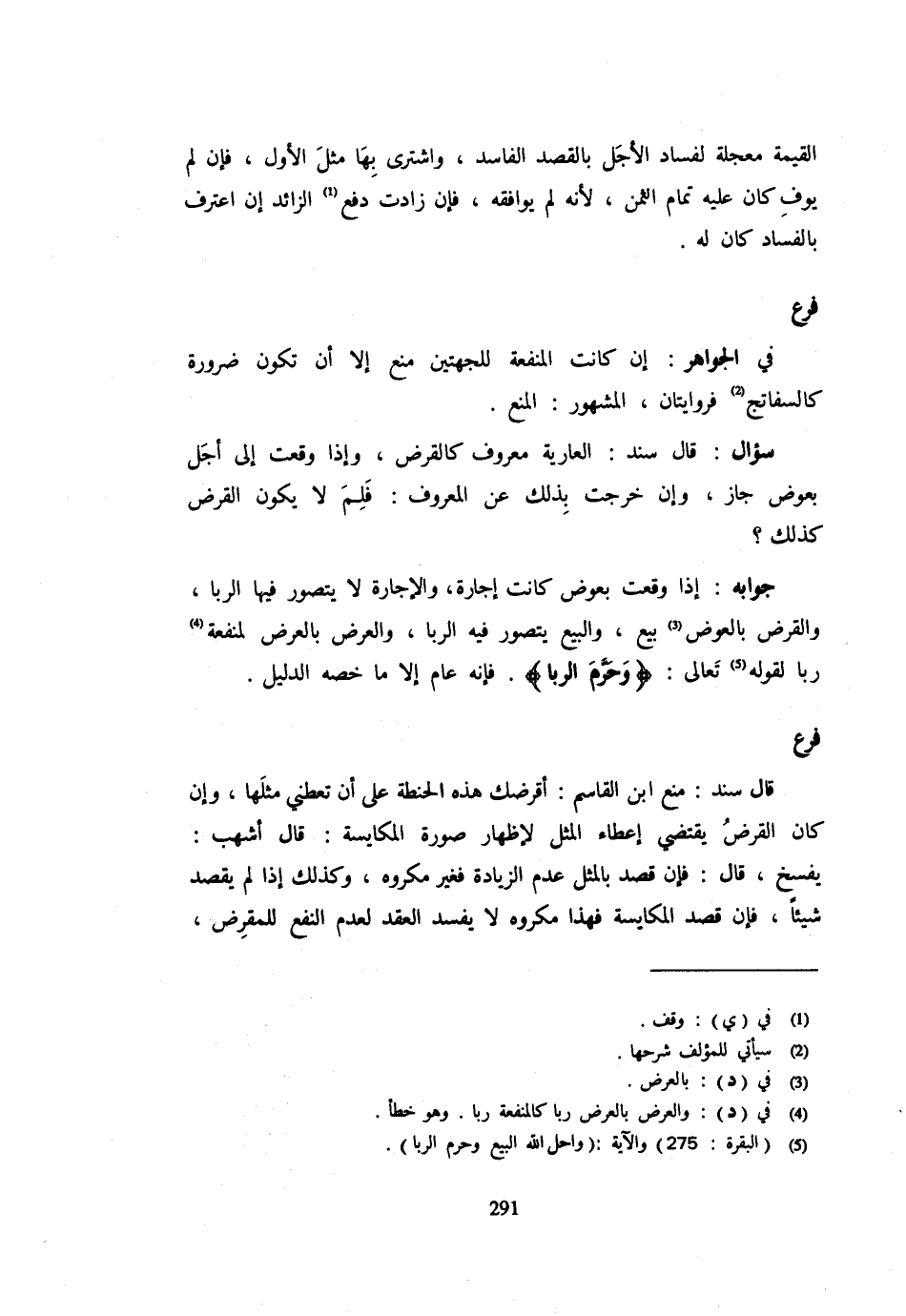 فَرْعٌ فِي الْجَوَاهِرِ: إِنْ كَانَتِ الْمَنْفَعَةُ لِلْجِهَتَيْنِ مَنَعَ إِلَّا أَنْ تَكُونَ ضَرُورَةٌ كَالسَّفَاتِجِ فَرِوَايَتَانِ الْمَشْهُورُ: الْمَنْعُ سُؤَالٌ: قَالَ سَنَدٌ: الْعَارِيَّةُ مَعْرُوفٌ كَالْقَرْضِ وَإِذَا وَقَعَتْ إِلَى أَجَلٍ بِعِوَضٍ جَازَ وَإِنْ خَرَجَتْ بِذَلِكَ عَنِ الْمَعْرُوفِ: فَلِمَ لَا يَكُونُ الْقَرْضُ كَذَلِكَ؟ جَوَابُهُ: إِذَا وَقَعَتْ بِعِوَضٍ كَانَتْ إِجَارَةً وَالْإِجَارَةُ لَا يُتَصَوَّرُ فِيهَا الرِّبَا وَالْقَرْضُ بِالْعِوَضِ بَيْعٌ وَالْبَيْعُ يُتَصَوَّرُ فِيهِ الرِّبَا وَالْعَرْضُ بِالْعَرْضِ لِمَنْفَعَةٍ رِبًا لِقَوْلِهِ تَعَالَى {وَحرم الرِّبَا} فَإِنْهُ عَامٌّ إِلَّا مَا خَصَّهُ الدَّلِيلُ