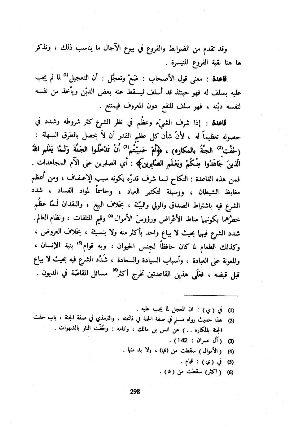 وَقَدْ تَقَدَّمَ مِنَ الضَّوَابِطِ وَالْفُرُوعِ فِي بُيُوعِ الْآجَالِ مَا يُنَاسِبُ ذَلِكَ وَنَذْكُرُ هَاهُنَا بَقِيَّةَ الْفُرُوعِ الْمُتَيَسَّرَةِ قَاعِدَةٌ: مَعْنَى قَوْلِ الْأَصْحَابِ: ضَعْ وَتَعَجَّلْ: أَنَّ التَّعْجِيلَ لَمَّا لَمْ يَجِبْ عَلَيْهِ بِسَلَفٍ لَهُ فَهُوَ حِينَئِذٍ قَدْ أَسْلَفَ لِيَسْقُطَ عَنْهُ بَعْضُ الدَّيْنِ وَيَأْخُذَ مِنْ نَفْسِهِ لِنَفْسِهِ دَيْنَهُ فَهُوَ سَلَفٌ لِلنَّفْعِ دُونَ الْمَعْرُوفِ فَيَمْتَنِعُ قَاعِدَةٌ: إِذَا شَرُفَ الشَّيْءُ وَعَظُمَ فِي نَظَرِ الشَّرْعِ كَثُرَ شُرُوطُهُ وَشُدِّدَ فِي حُصُولِهِ تَعْظِيمًا لَهُ لِأَنَّ شَأْنَ كُلِّ عَظِيمِ الْقَدْرِ أَنْ لَا يحصل بالطرق السهلة: (حُفت الحنةُ بِالْمَكَارِهِ) {أَمْ حَسِبْتُمْ أَنْ تَدْخُلُوا الْجَنَّةَ وَلَمَّا يَعْلَمِ اللَّهُ الَّذِينَ جَاهَدُوا مِنْكُمْ وَيَعْلَمَ الصَّابِرِينَ} : أَيِ الصَّابِرِينَ عَلَى آلَامِ الْمُجَاهَدَاتِ فَمِنْ هَذِهِ الْقَاعِدَةِ: النِّكَاحُ لَمَّا شَرُفَ قَدْرُهُ بِكَوْنِهِ سَبَبَ الْإِعْفَافِ وَمِنْ أَعْظَمِ مَغَايِظِ الشَّيْطَانِ وَوَسِيلَةً لِتَكْثِيرِ الْعِبَادِ وَحَاسِمًا لِمَوَادِّ الْفَسَادِ شَدَّدَ الشَّرْعُ فِيهِ بِاشْتِرَاط الصَدَاق وَالْوَلِيّ وَالْبَيِّنَة بِخِلَاف الْبَيْعُ وَالنَقْدَانِ لَمَّا عَظُمَ خَطَرُهُمَا بِكَوْنِهِمَا مَنَاطَ الْأَعْرَاض ورؤوس الْأَمْوَالِ وَقِيَمَ الْمُتْلَفَاتِ وَنِظَامَ الْعَالَمِ شَدَّدَ الشَّرْعُ فِيهِمَا بِحَيْثُ لَا يُبَاعُ وَاحِدٌ بِأَكْثَرَ مِنْهُ وَلَا بِنَسِيئَةٍ بِخِلَافِ الْعُرُوضِ وَكَذَلِكَ الطَّعَامُ لَمَّا كَانَ حَافِظًا لِجِنْسِ الْحَيَوَانِ وَبِهِ قِوَامُ بِنْيَةِ الْإِنْسَانِ وَالْمَعُونَةُ عَلَى الْعِبَادَةِ وَأَسْبَابُ السِّيَادَةِ وَالسَّعَادَةِ شَدَّدَ الشَّرْعُ فِيهِ بِحَيْثُ لَا يُبَاعُ قَبْلَ قَبْضِهِ فَعَلَى هَذَيْنِ الْقَاعِدَتَيْنِ تَخْرُجُ أَكْثَرُ مَسَائِلِ الْمُقَاصَّةِ فِي الدُّيُونِ