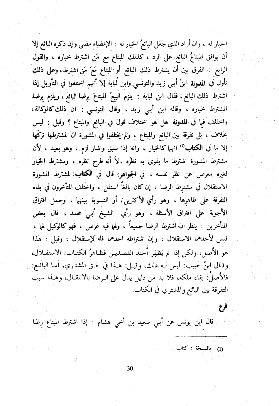 الْخِيَارَ لَهُ وَإِنْ أَرَادَ الَّذِي جَعَلَ الْبَائِعُ الْخِيَارَ لَهُ الْإِمْضَاءَ مَضَى وَإِنْ ذَكَرَهُ الْبَائِعُ إِلَّا أَنْ يُوَافِقَ الْمُبْتَاعُ الْبَائِعَ عَلَى الرَّدِّ كَذَلِكَ الْمُبْتَاعُ مَعَ مَنِ اشْتَرَطَ خِيَارَهُ وَالْقَوْلُ الرَّابِعُ الْفَرْقُ بَيْنَ أَنْ يَشْتَرِطَ ذَلِكَ الْبَائِعُ أَو الْمُبْتَاع مَعَ من اشْترط وَعَلَى ذَلِكَ تَأَوَّلَ فِي الْمُدَوَّنَةِ ابْنُ أَبِي زَيْدٍ وَالتُّونُسِيُّ وَابْنُ لُبَابَةَ إِلَّا أَنَّهُمُ اخْتَلَفُوا فِي التَّأْوِيلِ إِذَا اشْتَرَطَ ذَلِكَ الْبَائِعُ فَقَالَ ابْنُ لُبَابَةَ يَلْزَمُ الْبَيْعُ الْمُبْتَاعَ بِرِضَا الْبَائِعِ وَيَلْزَمُ بِرِضَا الْمُشْتَرِطِ خِيَارَهُ وَقَالَهُ ابْنُ أَبِي زَيْدٍ وَقَالَ التُّونُسِيُّ إِنَّ ذَلِكَ كَالْوَكَالَةِ وَاخْتَلَفَ فِيمَا فِي الْمُدَوَّنَةِ هَلْ هُوَ اخْتِلَافُ قَوْلٍ فِي الْبَائِعِ وَالْمُبْتَاعِ وَقِيلَ لَيْسَ بِخِلَافٍ بَلْ تَفْرِقَةٍ بَيْنَ الْبَائِعِ وَالْمُبْتَاعِ وَلَمْ يَخْتَلِفُوا فِي الْمَشُورَةِ أَنَّ لِمُشْتَرِطِهَا تَرْكَهَا إِلَّا مَا فِي الْكِتَابِ أَنَّهُمَا كَالْخِيَارِ وَأَنَّهُ إِذَا سَبَقَ وَأَشَارَ لَزِمَ وَهُوَ بَعِيدٌ لِأَنَّ مُشْتَرِطَ الْمَشُورَةِ اشْتَرَطَ بقوى بِهِ نَظَرُهُ لَا أَنَّهُ طَرَحَ نَظَرَهُ وَمُشْتَرِطُ الْخِيَارِ لِغَيْرِهِ مُعْرِضٌ عَنْ نَظَرِ نَفْسِهِ فِي الْجَوَاهِرِ قَالَ فِي الْكِتَابِ لِمُشْتَرِطِ الْمَشُورَةِ الِاسْتِقْلَالُ فِي مُشْتَرِطِ الرِّضَا إِنْ كَانَ بَالِغًا اسْتَقَلَّ وَاخْتَلَفَ الْمُتَأَخِّرُونَ فِي بَقَاءِ التَّفْرِقَةِ عَلَى ظَاهِرِهَا وَهُوَ رَأْيُ الْأَكْثَرِينَ أَوِ التَّسْوِيَةُ بَيْنَهُمَا وَحَمَلَ افْتِرَاقَ الْأَجْوِبَةِ عَلَى افْتِرَاقِ الْأَسْئِلَةِ وَهُوَ رَأْيُ الشَّيْخِ أَبِيِ مُحَمَّدٍ قَالَ بَعْضُ الْمُتَأَخِّرِينَ يَنْظُرُ إِنِ اشْتَرَطَا الرِّضَا جَمِيعًا وَلَهُمَا فِيهِ غَرَضٌ فَهُوَ كَالْوَكِيلِ لَهُمَا لَيْسَ لِأَحَدِهِمَا الِاسْتِقْلَالُ وَإِنِ اشْتِرَاطه أَحدهمَا فَلهُ لإستقلال وَقِيلَ هَذَا هُوَ الْأَصْلُ وَلَكِنْ إِذَا لَمْ يَظْهَرْ أَحَدُ الْقَصْدَيْنِ فَظَاهِرُ الْكِتَابِ الِاسْتِقْلَالُ وَقَالَ ابْنُ حَبِيبٍ لَيْسَ لَهُ ذَلِكَ وَقِيلَ هَذَا فِي حَقِّ الْمُشْتَرِي أَمَّا الْبَائِعُ فَالْأَصْلُ بَقَاءُ مِلْكِهِ فَلَا بُدَّ مِنْ دَلِيلٍ يَدُلُّ عَلَى الرِّضَا بِالِانْتِقَالِ وَهَذَا سَبَبُ التَّفْرِقَةِ بَيْنَ الْبَائِعِ وَالْمُشْتَرِي فِي الْكِتَابِ