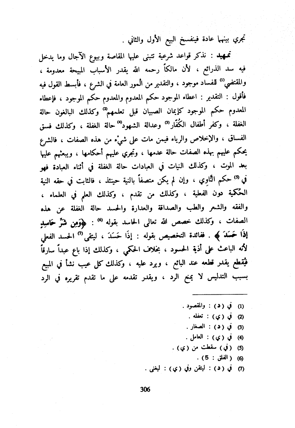 تَجْرِيَ بَيْنَهُمَا عَادَةٌ فَيَنْفَسِخَ الْبَيْعُ الْأَوَّلُ وَالثَّانِي تمهيد: نذْكر قَوَاعِد شَرْعِيَّة تتبنى عَلَيْهَا الْمُقَاصَّةُ وَبُيُوعُ الْآجَالِ وَمَا يَدْخُلُ فِيهِ سَدُّ الذَّرَائِعِ لِأَنَّ مَالِكًا رَحِمَهُ اللَّهُ يُقَدِّرُ الْأَسْبَابَ الْمُبِيحَةَ مَعْدُومَةً وَالْمُقْتَضِي لِلْفَسَادِ مَوْجُودٌ وَالتَّقْدِيرُ مِنَ الْأُمُورِ الْعَامَّةِ فِي الشَّرْعِ فَأَبْسُطُ الْقَوْلَ فِيهِ فَأَقُولُ: التَّقْدِيرُ إِعْطَاءُ الْمَوْجُودِ حُكْمَ الْمَعْدُومِ حُكْمَ الْمَوْجُودِ فَإِعْطَاءُ الْمَعْدُومِ حُكْمَ الْمَوْجُودِ كَإِيمَانِ الصِّبْيَانِ قَبْلَ تَعَلُّمِهِمْ وَكَذَلِكَ الْبَالِغُونَ حَالَةَ الْغَفْلَةِ وَكَفْرِ أَطْفَالِ الْكُفَّارِ وَعَدَالَةِ الشُّهُودِ حَالَةَ الْغَفْلَةِ وَكَذَلِكَ فِسْقُ الْفُسَّاقِ وَالْإِخْلَاصُ وَالرِّيَاءُ فِيمَنْ مَاتَ عَلَى شَيْءٍ مِنْ هَذِهِ الصِّفَاتِ فَالشَّرْعُ يَحْكُمُ عَلَيْهِمْ بِهَذِهِ الصِّفَاتِ حَالَةَ عَدَمِهَا وَتَجْرِي عَلَيْهِمْ أَحْكَامُهَا وَيَبْعَثُهُمْ عَلَيْهَا بَعْدَ الْمَوْتِ وَكَذَلِكَ النِّيَّاتُ فِي الْعِبَادَاتِ حَالَةَ الْغَفْلَةِ فِي أَثْنَاءِ الْعِبَادَةِ فَهُوَ فِي حُكْمِ النَّاوِي وَإِنْ لَمْ يَكُنْ مُتَّصِفًا بِالنِّيَّةِ حِينَئِذٍ فَالثَّابِتُ فِي حَقِّهِ النِّيَّةُ الحُكمية دُونَ الْفِعْلِيَّةِ وَكَذَلِكَ مَنْ تَقَدَّمَ وَكَذَلِكَ الْعِلْمُ فِي الْعُلَمَاءِ وَالْفِقْهُ وَالشِّعْرُ وَالطِّبُّ وَالصَّدَاقَةُ والعدارة وَالْحَسَدُ حَالَةَ الْغَفْلَةِ عَنْ هَذِهِ الصِّفَاتِ وَكَذَلِكَ خَصَّصَ اللَّهُ تَعَالَى الْحَاسِدَ بِقَوْلِهِ: {وَمِنْ شَرِّ حَاسِد إِذا حسد} فَفَائِدَةُ التَّخْصِيصِ بِقَوْلِهِ: إِذَا حَسَدَ لِيَتَّقِيَ الْحَسَدَ الْفعْلِيّ لِأَنَّهُ الْبَاعِث على أذية الحسود بِخِلَافِ الْحُكْمِيِّ وَكَذَلِكَ إِذَا بَاعَ عَبْدًا سَارِقًا فَيُقْطَعُ يُقَدَّرُ قَطْعُهُ عِنْدَ الْبَائِعِ وَيُرَدُّ عَلَيْهِ وَكَذَلِكَ كُلُّ عَيْبٍ نَشَأَ فِي الْمَبِيعِ بِسَبَبِ التَّدْلِيسِ لَا يَمْنَعُ الرَّدَّ وَيُقَدَّرُ تَقَدُّمُهُ عَلَى مَا تَقَدَّمَ تَقْرِيرُهُ فِي الرَّدِّ