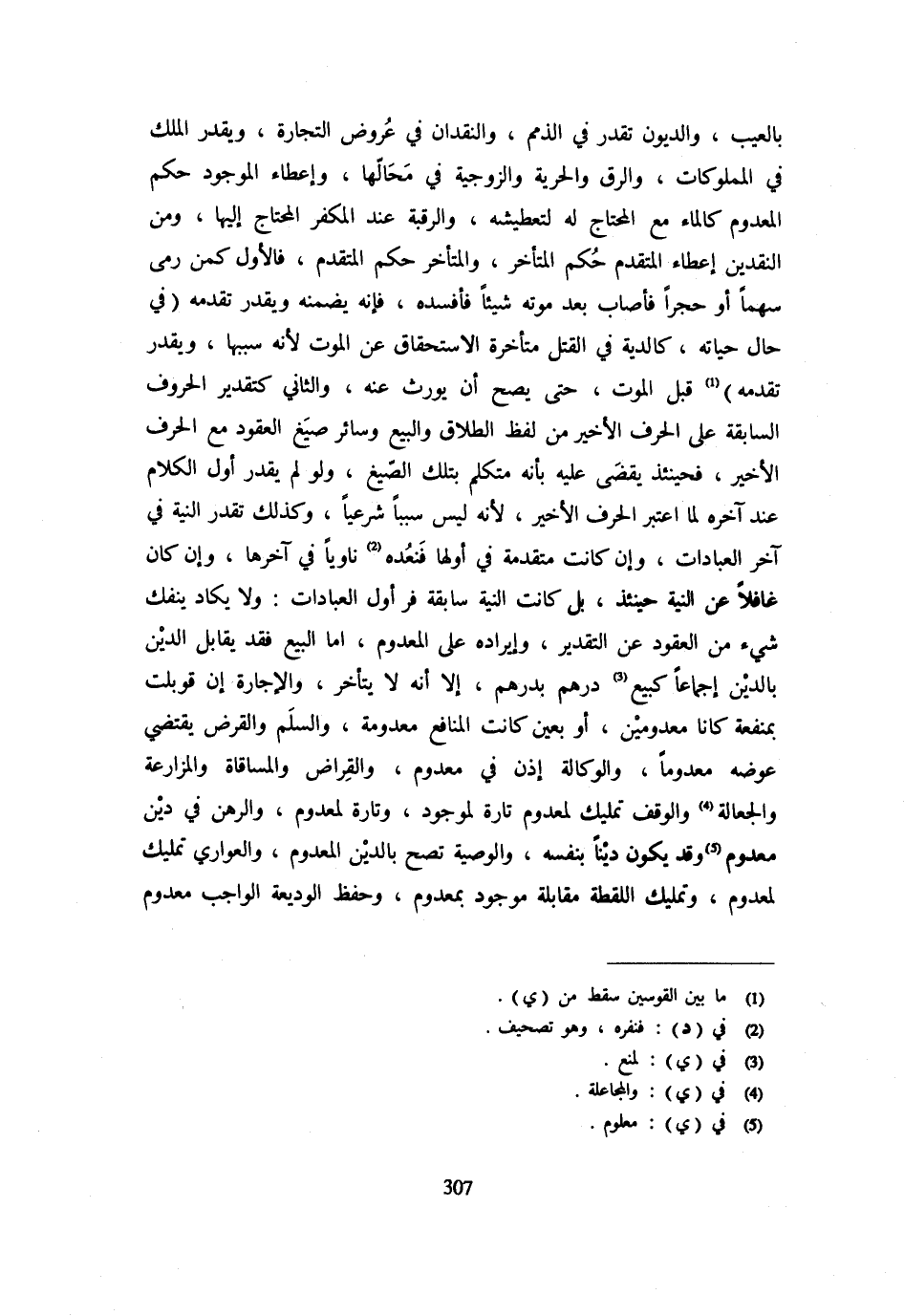 بِالْعَيْبِ وَالدُّيُونُ تُقَدَّرُ فِي الذِّمَمِ وَالنَّقْدَانِ فِي عُرُوضِ التِّجَارَةِ وَيُقَدَّرُ الْمِلْكُ فِي الْمَمْلُوكَاتِ وَالرِّقُّ وَالْحُرِّيَّةُ وَالزَّوْجِيَّةُ فِي مَحَالِّهَا وَإِعْطَاءُ الْمَوْجُودِ حُكْمَ الْمَعْدُومِ كَالْمَاءِ مَعَ الْمُحْتَاجِ لَهُ لِتَعْطِيشِهِ وَالرَّقَبَةُ عِنْد الْمُكَفّر الْمُحْتَاج إِلَيْهِ وَمِنَ النَّقْدَيْنِ إِعْطَاءُ الْمُتَقَدِّمِ حُكم الْمُتَأَخِّرِ وَالْمُتَأَخِّرِ حُكْمَ الْمُتَقَدِّمِ فَالْأَوَّلُ كَمَنْ رَمَى سَهْمًا أَوْ حَجَرًا فَأَصَابَ بَعْدَ مَوْتِهِ شَيْئًا فَأَفْسَدَهُ فَإِنْهُ يَضْمَنُهُ وَيُقَدِّرُ تَقَدُّمَهُ (فِي حَالِ حَيَاتِهِ كَالدِّيَةِ فِي الْقَتْلِ مُتَأَخِّرَةِ الِاسْتِحْقَاقِ عَنِ الْمَوْتِ لِأَنَّهُ سَبَبُهَا وَيُقَدَّرُ تَقَدُّمُهُ) قَبْلَ الْمَوْتِ حَتَّى يَصِحَّ أَنْ يُورَثَ عَنْهُ وَالثَّانِي كَتَقْدِيرِ الْحُرُوفِ السَّابِقَةِ عَلَى الْحَرْفِ الْأَخِيرِ مِنْ لَفْظِ الطَّلَاقِ وَالْبَيْعِ وَسَائِرِ صِيَغِ الْعُقُودِ مَعَ الْحَرْفِ الْأَخِيرِ فَحِينَئِذٍ يُقْضَى عَلَيْهِ بِأَنَّهُ مُتَكَلِّمٌ بِتِلْكَ الصِّيَغِ وَلَوْ لَمْ يُقَدَّرْ أَوَّلُ الْكَلَامِ عِنْدَ آخِرِهِ لَمَا اعْتُبِرَ الْحَرْفُ الْأَخِيرُ لِأَنَّهُ لَيْسَ سَبَبًا شَرْعِيًّا وَكَذَلِكَ تُقَدَّرُ النِّيَّةُ فِي آخِرِ الْعِبَادَاتِ وَإِنْ كَانَتْ مُتَقَدِّمَةً فِي أَوَّلِهَا فَنُعِدُّهُ نَاوِيًا فِي آخِرِهَا وَإِنْ كَانَ غَافِلًا عَنِ النِّيَّةِ حِينَئِذٍ بل كَانَت النِّيَّة سَابِقَة فر أول الْعِبَادَات: وَلَا يَكَادُ يَنْفَكُّ شَيْءٌ مِنَ الْعُقُودِ عَنِ التَّقْدِيرِ وَإِيرَادُهُ عَلَى الْمَعْدُومِ أَمَّا الْبَيْعُ فَقَدْ يُقَابِلُ الدَّيْنَ بِالدَّيْنِ إِجْمَاعًا كَبَيْعِ دِرْهَمٍ بِدِرْهَمٍ إِلَّا أَنَّهُ لَا يَتَأَخَّرُ وَالْإِجَارَةُ إِنْ قُوبِلَتْ بِمَنْفَعَةٍ كَانَا مَعْدُومَيْنِ أَوْ بِعَيْنٍ كَانَتِ الْمَنَافِعُ مَعْدُومَةً وَالسَّلَمُ وَالْقَرْضُ يَقْتَضِي عِوَضُهُ مَعْدُومًا وَالْوِكَالَةُ إِذَنْ فِي مَعْدُومٍ وَالْقِرَاضُ وَالْمُسَاقَاةُ وَالْمُزَارَعَةُ وَالْجُعَالَةُ وَالْوَقْفُ تَمْلِيكٌ لِمَعْدُومٍ تَارَةً لِمَوْجُودٍ وَتَارَةً لِمَعْدُومٍ وَالرَّهْنُ فِي دَيْنٍ مَعْدُومٍ وَقَدْ يَكُونُ دَيْنًا بِنَفْسِهِ وَالْوَصِيَّةُ تَصِحُّ بِالدَّيْنِ الْمَعْدُومِ وَالْعَوَارِيُّ تَمْلِيكٌ لِمَعْدُومٍ وَتَمْلِيكُ اللُّقَطَةِ مُقَابِلَةُ مَوْجُودٍ بِمَعْدُومٍ وَحِفْظُ الْوَدِيعَةِ الْوَاجِبُ مَعْدُومٌ