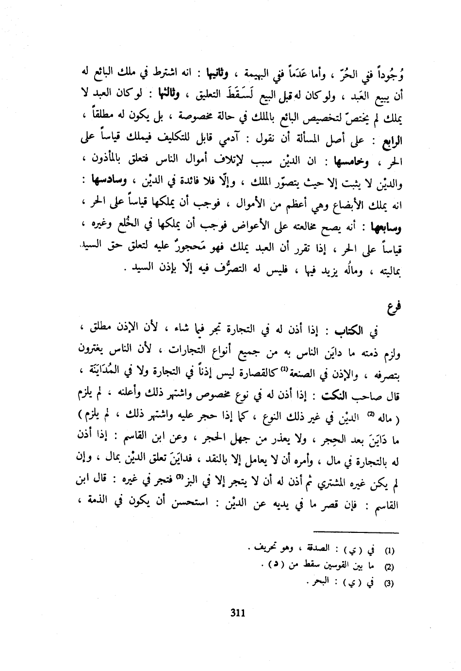 وُجُودًا فَفِي الْحُرِّ وَأَمَّا عَدَمًا فَفِي الْبَهِيمَةِ وَثَانِيهَا: أَنَّهُ اشْتَرَطَ فِي مِلْكِ الْبَائِعِ لَهُ أَنْ يَبِيعَ الْعَبْدَ وَلَوْ كَانَ لَهُ قَبْلَ الْبَيْعِ لَسَقَطَ التَّعْلِيقُ وَثَالِثُهَا: لَوْ كَانَ الْعَبْدُ لَا يَمْلِكُ لَمْ يَخْتَصَّ لِتَخْصِيصِ الْبَائِعِ بِالْمِلْكِ فِي حَالَةٍ مَخْصُوصَةٍ بَلْ يَكُونُ لَهُ مُطْلَقًا الرَّابِعُ: عَلَى أَصْلِ الْمَسْأَلَةِ أَنْ نَقُولَ: آدَمِيٌّ قَابِلٌ لِلتَّكْلِيفِ فَيَمْلِكُ قِيَاسًا عَلَى الْحُرِّ وَخَامِسُهَا: أَنَّ الدَّيْنَ سَبَبٌ لِإِتْلَافِ أَمْوَالِ النَّاسِ فَتَعَلَّقَ بِالْمَأْذُونِ وَالدَّيْنُ لَا يَثْبُتُ إِلَّا حَيْثُ يُتَصَوَّرُ الْمِلْكُ وَإِلَّا فَلَا فَائِدَةَ فِي الدَّيْنِ وَسَادِسُهَا: أَنَّهُ يَمْلِكُ الْأَبْضَاعَ وَهِيَ أَعْظَمُ مِنَ الْأَمْوَالِ فَوَجَبَ أَنْ يَمْلِكَهَا قِيَاسًا عَلَى الْحُرِّ وَسَابِعُهَا: أَنَّهُ يَصِحُّ مُخَالَعَتُهُ عَلَى الْأَعْوَاضِ فَوَجَبَ أَنْ يَمْلِكَهَا فِي الخُلع وَغَيْرِهِ قِيَاسًا عَلَى الْحُرِّ إِذَا تَقَرَّرَ أَنَّ الْعَبْدَ يَمْلِكُ فَهُوَ مَحْجُورٌ عَلَيْهِ لِتَعَلُّقِ حَقِّ السَّيِّدِ بِمَالِيَّتِهِ وَمَالُهُ يَزِيدُ فِيهَا فَلَيْسَ لَهُ التَّصَرُّفُ فِيهِ إِلَّا بِإِذْنِ السَّيِّدِ