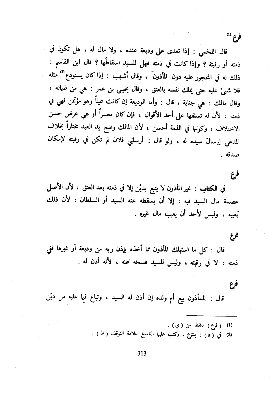 فَرْعٌ قَالَ اللَّخْمِيُّ: إِذَا تَعَدَّى عَلَى وَدِيعَةٍ عِنْدَهُ وَلَا مَالَ لَهُ هَلْ تَكُونُ فِي ذِمَّتِهِ أَوْ رَقَبَتِهِ؟ وَإِذَا كَانَتْ فِي ذِمَّتِهِ فَهَلْ لِلسَّيِّدِ إِسْقَاطُهَا؟ قَالَ ابْنُ الْقَاسِمِ: ذَلِكَ لَهُ فِي الْمَحْجُورِ عَلَيْهِ دُونَ الْمَأْذُونِ وَقَالَ أَشهب: إِذا كَانَ يستودع مِثْلُهُ فَلَا شَيْءَ عَلَيْهِ حَتَّى يَمْلِكَ نَفْسَهُ بِالْعِتْقِ وَقَالَ يَحْيَى بْنُ عُمَرَ: هِيَ مِنْ ضَمَانِهِ وَقَالَ مَالِكٌ: هِيَ جِنَايَةٌ قَالَ: وَأَمَّا الْوَدِيعَةُ إِنْ كَانَتْ عَيْنًا وَهُوَ مُؤْتَمَنٌ فَهِيَ فِي ذِمَّتِهِ لِأَنَّ لَهُ تَسَلُّفَهَا عَلَى أَحَدِ الْأَقْوَالِ فَإِنْ كَانَ مُعْسِرًا أَوْ هِيَ عَرْضٌ حَسُنَ الِاخْتِلَافُ وَكَوْنُهَا فِي الذِّمَّةِ أَحْسَنُ لِأَنَّ الْمَالِكَ وَضَعَ يَدَ الْعَبْدِ مُخْتَارًا بِخِلَافِ الْمُدَّعِي إِرْسَالَ سَيِّدِهِ لَهُ وَلَوْ قَالَ: أَرْسَلَنِي فُلَانٌ لَمْ تَكُنْ فِي رَقَبَتِهِ لِإِمْكَانِ صِدْقِهِ
