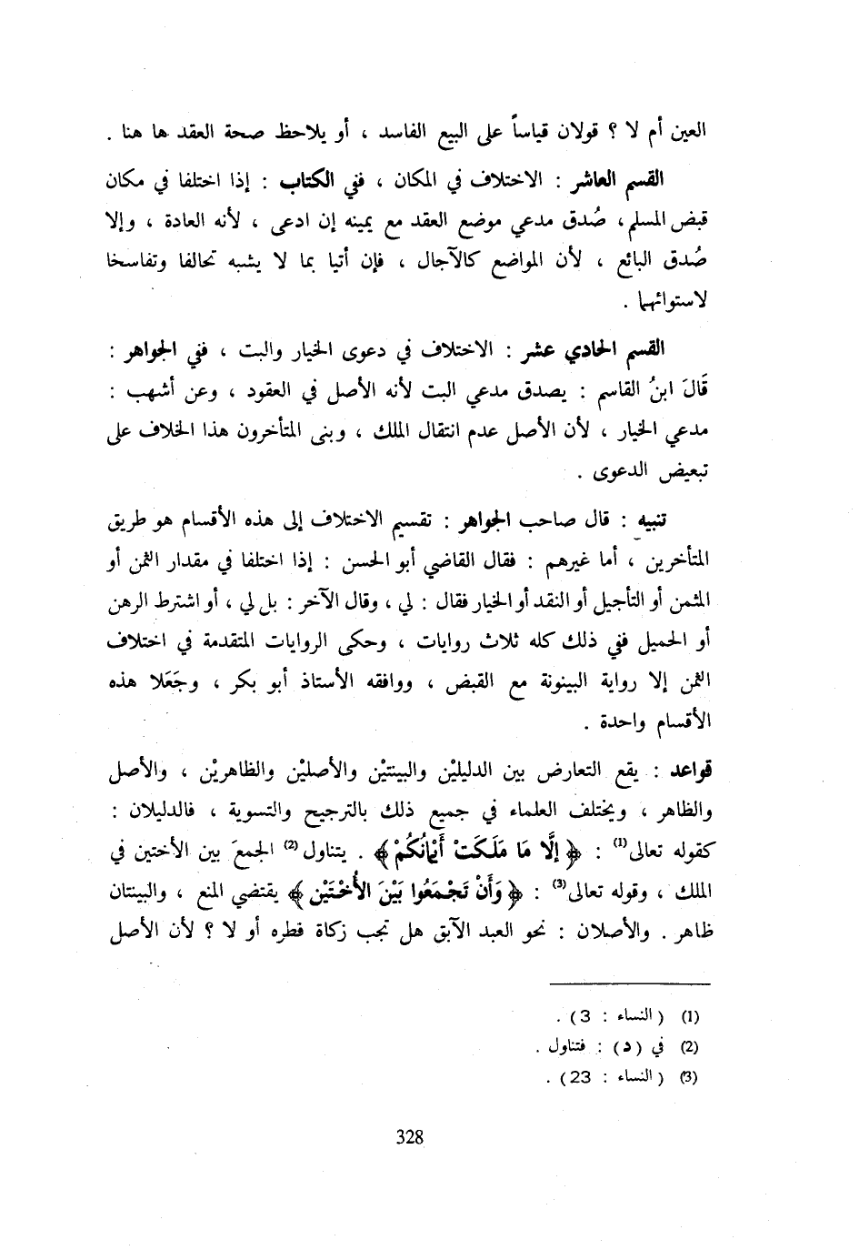 الْقِسْمُ الْعَاشِرُ: الِاخْتِلَافُ فِي الْمَكَانِ فَفِي الْكِتَابِ: إِذَا اخْتلفَا فِي مَكَان قبض الْمُسلم صُدق مُدَّعِي مَوْضِعِ الْعَقْدِ مَعَ يَمِينِهِ إِنِ ادَّعَى لِأَنَّهُ الْعَادَةُ وَإِلَّا صُدق الْبَائِعُ لِأَنَّ الْمَوَاضِعَ كَالْآجَالِ فَإِنْ أَتَيَا بِمَا لَا يُشْبِهُ تَحَالَفَا وَتَفَاسَخَا لِاسْتِوَائِهِمَا الْقِسْمُ الْحَادِي عَشَرَ: الِاخْتِلَافُ فِي دَعْوَى الْخِيَارِ وَالْبَتِّ فَفِي الْجَوَاهِرِ: قَالَ ابْنُ الْقَاسِمِ: يُصَدَّقُ مُدَّعِي الْبَتِّ لِأَنَّهُ الْأَصْلُ فِي الْعُقُودِ وَعَنْ أَشْهَبَ: مُدَّعِي الْخِيَارِ لِأَنَّ الْأَصْلَ عَدَمُ انْتِقَالِ الْمِلْكِ وَبَنَى الْمُتَأَخِّرُونَ هَذَا الْخِلَافَ عَلَى تَبْعِيضِ الدَّعْوَى تَنْبِيهٌ: قَالَ صَاحِبُ الْجَوَاهِرِ: تَقْسِيمُ الِاخْتِلَافِ إِلَى هَذِهِ الْأَقْسَامِ هُوَ طَرِيقُ الْمُتَأَخِّرِينَ أَمَّا غَيْرُهُمْ: فَقَالَ الْقَاضِي أَبُو الْحَسَنِ: إِذَا اخْتَلَفَا فِي مِقْدَارِ الثَّمَنِ أَوِ الْمُثْمَنِ أَوِ التَّأْجِيلِ أَوِ النَّقْدِ أَوِ الْخِيَارِ فَقَالَ: لِيَ وَقَالَ الْآخَرُ: بَلْ لِيَ أَوِ اشْترط الرَّهْنَ أَوِ الْحَمِيلَ فَفِي ذَلِكَ كُلِّهِ ثَلَاثُ رِوَايَاتٍ وَحَكَى الرِّوَايَاتِ الْمُتَقَدِّمَةَ فِي اخْتِلَافِ الثَّمَنِ إِلَّا رِوَايَةَ الْبَيْنُونَةِ مَعَ الْقَبْضِ وَوَافَقَهُ الْأُسْتَاذُ أَبُو بكر وَجعلا لِأَن هَذِهِ الْأَقْسَامَ وَاحِدَةً قَوَاعِدُ: يَقَعُ التَّعَارُضُ بَيْنَ الدَّلِيلَيْنِ وَالْبَيِّنَتَيْنِ وَالْأَصْلَيْنِ وَالظَّاهِرَيْنِ وَالْأَصْلِ وَالظَّاهِرِ وَيَخْتَلِفُ الْعُلَمَاءُ فِي جَمِيعِ ذَلِكَ بِالتَّرْجِيحِ وَالتَّسْوِيَةِ فَالدَّلِيلَانِ: كَقَوْلِه تَعَالَى: {إِلَّا مَا ملكت أَيْمَانكُم} يَتَنَاوَلُ الْجَمْعَ بَيْنَ الْأُخْتَيْنِ فِي الْمِلْكِ وَقَوْلِهِ تَعَالَى {وَأَن تجمعُوا بَين الْأُخْتَيْنِ} يَقْتَضِي الْمَنْع والبنتان ظَاهِرٌ وَالْأَصْلَانِ: نَحْوَ الْعَبْدُ الْآبِقُ هَلْ تَجِبُ زَكَاة فطره أَولا؟ لِأَن الأَصْل
