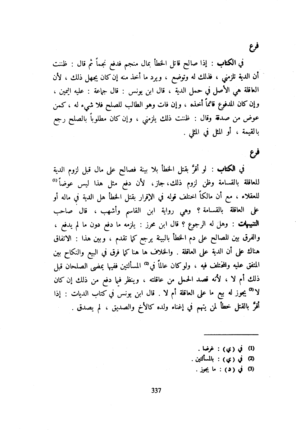 فَرْعٌ فِي الْكِتَابِ: إِذَا صَالَحَ قَاتِلُ الْخَطَأِ بِمَالٍ مُنَجَّمٍ فَدَفَعَ نَجْمًا ثُمَّ قَالَ: ظَنَنْتُ أَنَّ الدِّيَةَ تَلْزَمُنِي فَذَلِكَ لَهُ وَتُوضَعُ وَيُرَدُّ مَا أُخِذَ مِنْهُ إِنْ كَانَ يَجْهَلُ ذَلِكَ ك لِأَنَّ الْعَاقِلَةَ هِيَ الْأَصْلُ فِي حَمْلِ الدِّيَةِ قَالَ ابْنُ يُونُسَ قَالَ جَمَاعَةٌ: عَلَيْهِ الْيَمِينُ وَإِن كَانَ الْمَدْفُوع قَائِما أَخذه , إِن فَاتَ وَهُوَ الطّلب لِلصُّلْحِ فَلَا شَيْءَ لَهُ كَمَنْ عَوَّضَ مِنْ صَدَقَةٍ وَقَالَ: ظَنَنْتُ ذَلِكَ يَلْزَمُنِي وَإِنْ كَانَ مَطْلُوبًا بِالصُّلْحِ رَجَعَ بِالْقِيمَةِ أَوِ الْمِثْلِ فِي الْمِثْلِيِّ