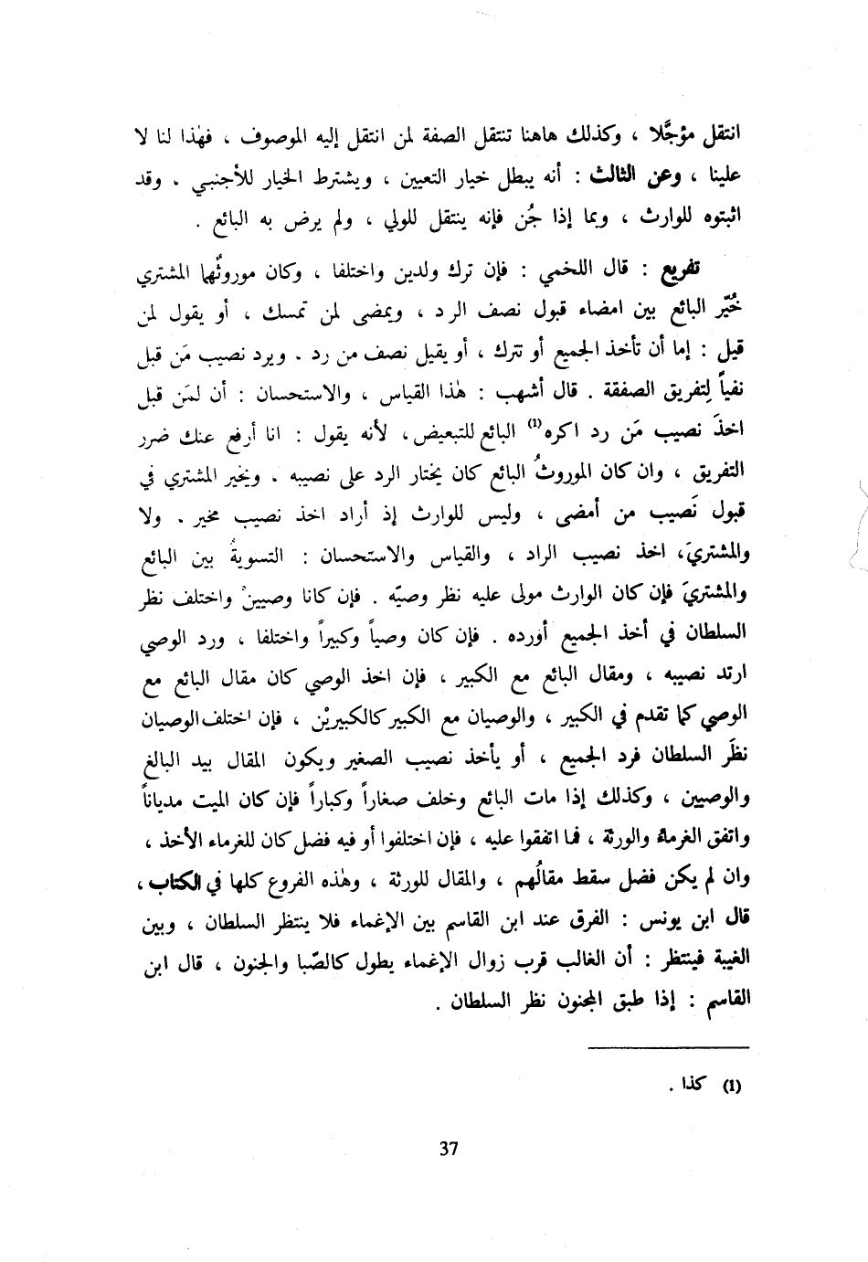انْتقل مُؤَجّلا وَكَذَلِكَ هَا هُنَا تَنْتَقِلُ الصِّفَةُ لِمَنِ انْتَقَلَ إِلَيْهِ الْمَوْصُوفُ فَهَذَا لَنَا لَا عَلَيْنَا وَعَنِ الثَّالِثِ أَنَّهُ يَبْطُلُ خِيَارُ التَّعْيِينِ وَيُشْتَرَطُ الْخِيَارُ لِلْأَجْنَبِيِّ وَقَدْ أَثْبَتُوهُ لِلْوَارِثِ وَبِمَا إِذَا جُنَّ فَإِنَّهُ يَنْتَقِلُ لِلْوَلِيِّ وَلَمْ يَرْضَ بِهِ الْبَائِعُ تَفْرِيعٌ قَالَ اللَّخْمِيُّ فَإِنْ تَرَكَ وَلَدَيْنِ وَاخْتَلَفَا وَكَانَ مَوْرُوثُهُمَا الْمُشْتَرِي خُيِّرَ الْبَائِعُ بَيْنَ إِمْضَاءِ قَبُولِ نِصْفِ الرَّدِّ وَيَمْضِي لِمَنْ تَمَسَّكَ أَوْ يَقُولُ لِمَنْ قِيلَ إِمَّا أَنْ تَأْخُذَ الْجَمِيعَ أَوْ تَتْرُكَ أَوْ يُقِيلُ نِصْفَ مَنْ رَدَّ وَيَرُدُّ نَصِيبَ مَنْ قَبِلَ نَفْيًا لِتَفْرِيقِ الصَّفْقَةِ قَالَ أَشْهَبُ هَذَا الْقِيَاسُ وَالِاسْتِحْسَانُ أَنَّ لِمَنْ قَبِلَ أَخْذَ نَصِيبَ من رد أكره البَائِع للتبغيض لِأَنَّهُ يَقُولُ أَنَا أَرْفَعُ عَنْكَ ضَرَرَ التَّفْرِيقِ وَإِنْ كَانَ الْمَوْرُوثُ الْبَائِعَ كَانَ يَخْتَارُ الرَّدَّ عَلَى نَصِيبِهِ وَيُخَيَّرُ الْمُشْتَرِي فِي قَبُولِ نَصِيبِ من أمضى وَلَيْسَ الْوَارِث إِذا أَرَادَ أَخذ نصيب مُخَيّر وَلَا الْمُشْتَرى أَخْذُ نَصِيبِ الرَّادِّ وَالْقِيَاسُ وَالِاسْتِحْسَانُ التَّسْوِيَةُ بَيْنَ الْبَائِعِ وَالْمُشْتَرِي فَإِنْ كَانَ الْوَارِثُ مَوْلًى عَلَيْهِ نَظَرَ وَصِيَّهُ فَإِنْ كَانَا وَصِيَّيْنِ وَاخْتَلَفَ نَظَرُ السُّلْطَان فِي أَخذ الْجَمِيع أوردهُ فَإِنْ كَانَ وَصِيًّا وَكَبِيرًا وَاخْتَلَفَا وَرَدَّ الْوَصِيُّ ارْتَدَّ نَصِيبُهُ وَمَقَالُ الْبَائِعِ مَعَ الْكَبِيرِ فَإِنْ أَخَذَ الْوَصِيُّ كَانَ مَقَالُ الْبَائِعِ مَعَ الْوَصِيِّ كَمَا تَقَدَّمَ فِي الْكَبِيرِ وَالْوَصِيَّانِ مَعَ الْكَبِيرِ كالكبيرين فَإِن اخْتلف الوصيان نظر السُّلْطَان فَرد الْجَمِيع أَو يَأْخُذ نصيب الصَّغِير وَيكون الْمقَال بيد الْبَالِغ وَالْوَصِيَّيْنِ وَكَذَلِكَ إِذَا مَاتَ الْبَائِعُ وَخَلَّفَ صِغَارًا وَكِبَارًا فَإِنْ كَانَ الْمَيِّتُ مِدْيَانًا وَاتَّفَقَ الْغُرَمَاءُ وَالْوَرَثَةُ فَمَا اتَّفَقُوا عَلَيْهِ فَإِنِ اخْتَلَفُوا أَوْ فِيهِ فَضْلٌ كَانَ لِلْغُرَمَاءِ الْأَخْذُ وَإِنْ لَمْ يَكُنْ فَضْلٌ سَقَطَ مَقَالُهُمْ وَالْمَقَالُ لِلْوَرَثَةِ وَهَذِهِ الْفُرُوعُ كُلُّهَا فِي الْكِتَابِ قَالَ ابْنُ يُونُسَ الْفَرْقُ عِنْدَ ابْنِ الْقَاسِمِ بَيْنَ الْإِغْمَاءِ فَلَا يَنْتَظِرُ السُّلْطَانُ وَبَيْنَ الْغَيْبَةِ فَيَنْتَظِرُ أَنَّ الْغَالِبَ قُرْبُ زَوَالِ الْإِغْمَاءِ يَطُولُ كَالصِّبَا وَالْجُنُونِ قَالَ ابْن الْقَاسِم إِذا طبق الْمَجْنُونُ نَظَرَ السُّلْطَانُ