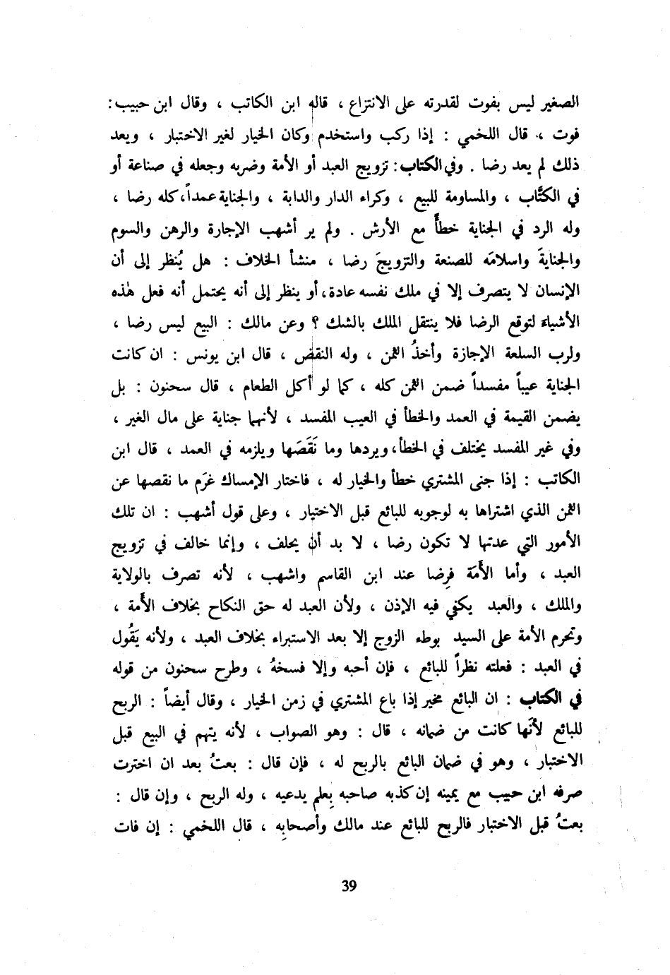 الصَّغِيرِ لَيْسَ بِفَوْتٍ لِقُدْرَتِهِ عَلَى الِانْتِزَاعِ قَالَهُ ابْنُ الْكَاتِبِ وَقَالَ ابْنُ حَبِيبٍ فَوْتٌ قَالَ اللَّخْمِيُّ إِذَا رَكِبَ وَاسْتَخْدَمَ وَكَانَ الْخِيَارُ لِغَيْرِ الاختبار ويعد ذَلِكَ لَمْ يُعَدَّ رِضًا وَفِي الْكِتَابِ تَزْوِيجُ الْعَبْدِ أَوِ الْأَمَةِ وَضَرْبُهُ وَجَعْلُهُ فِي صِنَاعَةٍ أَوْ فِي الْكِتَابِ وَالْمُسَاوَمَةُ لِلْبَيْعِ وَكِرَاءُ الدَّارِ وَالدَّابَّةِ وَالْجِنَايَةُ عَمْدًا كُلُّهُ رِضًا وَلَهُ الرَّدُّ فِي الْجِنَايَة خطأ مَعَ الْأَرْش وَلم يرا شهب الْإِجَارَةَ وَالرَّهْنَ وَالسَّوْمَ وَالْجِنَايَةَ وَإِسْلَامَهُ لِلصَّنْعَةِ وَالتَّزْوِيجَ رِضًا مَنْشَأُ الْخِلَافِ هَلْ يُنْظَرُ إِلَى أَنَّ الْإِنْسَانَ لَا يَتَصَرَّفُ إِلَّا فِي مِلْكِ نَفْسِهِ عَادَةً أَوْ يُنْظَرُ إِلَى أَنَّهُ يُحْتَمَلُ أَنَّهُ فَعَلَ هَذِهِ الْأَشْيَاءَ لِتَوَقُّعِ الرِّضَا فَلَا يَنْتَقِلُ الْمِلْكُ بِالشَّكِّ وَعَنْ مَالِكٍ الْبَيْعُ لَيْسَ رِضًا ولرب السّلْعَة الْإِجَازَة وَأخذ الثّمن وَله النَّقْص قَالَ ابْنُ يُونُسَ إِنْ كَانَتِ الْجِنَايَةُ عَيْبًا مُفْسِدًا ضَمِنَ الثَّمَنَ كُلَّهُ كَمَا لَوْ أَكَلَ الطَّعَامَ قَالَ سَحْنُونٌ بَلْ يَضْمَنُ الْقِيمَةَ فِي الْعَمْدِ وَالْخَطَأِ فِي الْعَيْبِ الْمُفْسِدِ لِأَنَّهُمَا جِنَايَةٌ عَلَى مَالِ الْغَيْرِ وَفِي غَيْرِ الْمُفْسِدِ يَخْتَلِفُ فِي الْخَطَأِ وَيَرُدُّهَا وَمَا نَقَصَهَا وَيَلْزَمُهُ فِي الْعَمْدِ قَالَ ابْنُ الْكَاتِبِ إِذَا جَنَى الْمُشْتَرِي خَطَأً وَالْخِيَارُ لَهُ فَاخْتَارَ الْإِمْسَاكَ غَرِمَ مَا نَقَصَهَا عَنِ الثَّمَنِ الَّذِي اشْتَرَاهَا بِهِ لِوُجُوبِهِ لِلْبَائِعِ قَبْلَ الِاخْتِيَارِ وَعَلَى قَوْلِ أَشْهَبَ إِنَّ تِلْكَ الْأُمُورَ الَّتِي عِدْتُهَا لَا تَكُونُ رِضًا لَا بُدَّ أَنْ يَحْلِفَ وَإِنَّمَا خَالَفَ فِي تَزْوِيجِ الْعَبْدِ وَأَمَّا الْأَمَةُ فَرِضًا عِنْدَ ابْنِ الْقَاسِمِ وَأَشْهَبَ لِأَنَّهُ تَصَرَّفَ بِالْوِلَايَةِ وَالْمِلْكِ وَالْعَبْدُ يَكْفِي فِيهِ الْإِذْنُ وَلِأَنَّ الْعَبْدَ لَهُ حَقُّ النِّكَاح بِخِلَاف لامه وَتحرم الأمه على السَّيِّد بوطئ الزَّوْج إِلَّا بعد الِاسْتِبْرَاء بِالْحلف الْعَبْدِ وَلِأَنَّهُ يَقُولُ فِي الْعَبْدِ فَعَلْتُهُ نَظَرًا لِلْبَائِعِ فَإِنْ أَحَبَّهُ وَإِلَّا فَسَخَهُ وَطَرَحَ سَحْنُونٌ مِنْ قَوْلِهِ فِي الْكِتَابِ إِنَّ الْبَائِعَ مُخَيَّرٌ إِذَا بَاعَ الْمُشْتَرِيَ فِي زَمَنِ الْخِيَارِ وَقَالَ أَيْضًا الرِّبْحُ لِلْبَائِعِ لِأَنَّهَا كَانَتْ مِنْ ضَمَانِهِ قَالَ وَهُوَ الصَّوَابُ لِأَنَّهُ يُتَّهَمُ فِي الْبَيْعِ قبل الاختبار وَهُوَ فِي ضَمَانِ الْبَائِعِ بِالرِّبْحِ لَهُ فَإِنْ قَالَ بِعْت أَن اخْتَرْتَ صَرَفَهُ ابْنُ حَبِيبٍ مَعَ يَمِينِهِ إِنْ كَذَّبَهُ صَاحِبُهُ بِعِلْمٍ يَدَّعِيهِ وَلَهُ الرِّبْحُ وَإِن قَالَ بِعْت قبل الاختبار فَالرِّبْحُ لِلْبَائِعِ عِنْدَ مَالِكٍ وَأَصْحَابِهِ قَالَ اللَّخْمِيُّ إِن فَاتَ