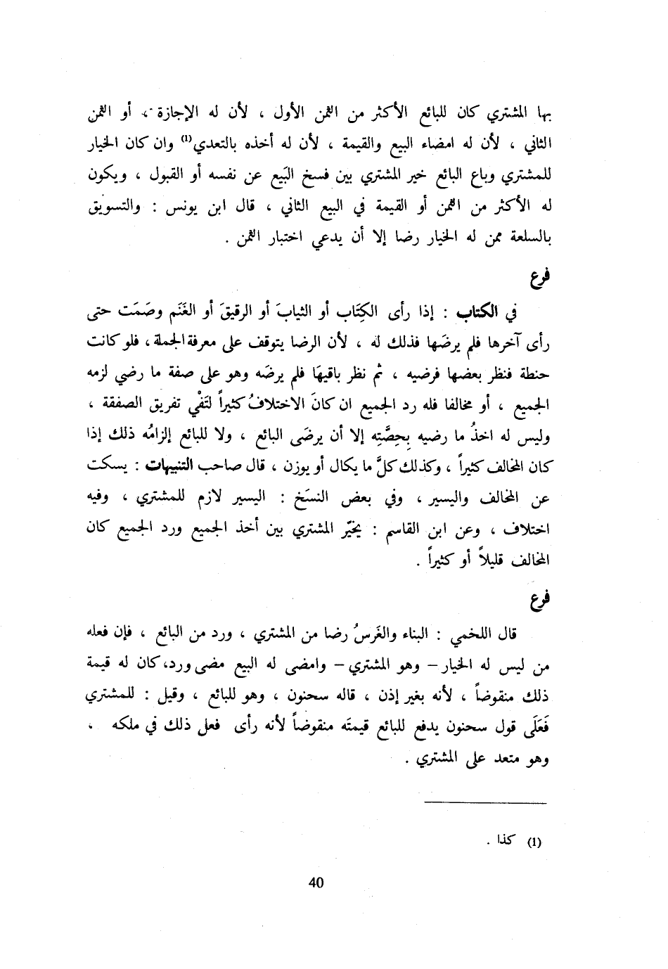 فِي الْكِتَابِ إِذَا رَأَى الْكِتَابَ أَوِ الثِّيَابَ أَوِ الرَّقِيقَ أَوِ الْغَنَمَ وَصَمَتَ حَتَّى رَأَى آخِرَهَا فَلَمْ يَرْضَهَا فَذَلِكَ لَهُ لِأَنَّ الرِّضَا يَتَوَقَّفُ عَلَى مَعْرِفَةِ الْجُمْلَةِ فَلَوْ كَانَتْ حِنْطَةً فَنَظَرَ بَعْضَهَا فَرَضِيَهُ ثُمَّ نَظَرَ بَاقِيَهَا فَلَمْ يَرْضَهُ وَهُوَ عَلَى صِفَةِ مَا رَضِيَ لَزِمَهُ الْجَمِيعُ أَوْ مُخَالِفًا فَلَهُ رَدُّ الْجَمِيع إِن كَانَ الِاخْتِلَاف كثيرا لتفي تَفْرِيقِ الصَّفْقَةِ وَلَيْسَ لَهُ أَخْذُ مَا رَضِيَهُ بِحِصَّتِهِ إِلَّا أَنْ يَرْضَى الْبَائِعُ وَلَا لِلْبَائِعِ إِلْزَامُهُ ذَلِكَ إِذَا كَانَ الْمُخَالِفُ كَثِيرًا وَكَذَلِكَ كَلُّ مَا يُكَالُ أَوْ يُوزَنُ قَالَ صَاحِبُ التَّنْبِيهَاتِ يَسْكُتُ عَنِ الْمُخَالِفِ وَالْيَسِيرِ وَفِي بَعْضِ النُّسَخِ الْيَسِيرُ لَازِمٌ لِلْمُشْتَرِي وَفِيهِ اخْتِلَافٌ وَعَنِ ابْنِ الْقَاسِمِ يُخَيَّرُ الْمُشْتَرِي بَيْنَ أَخْذِ الْجَمِيعِ وَرَدِّ الْجَمِيعِ كَانَ الْمُخَالِفُ قَلِيلًا أَوْ كَثِيرًا