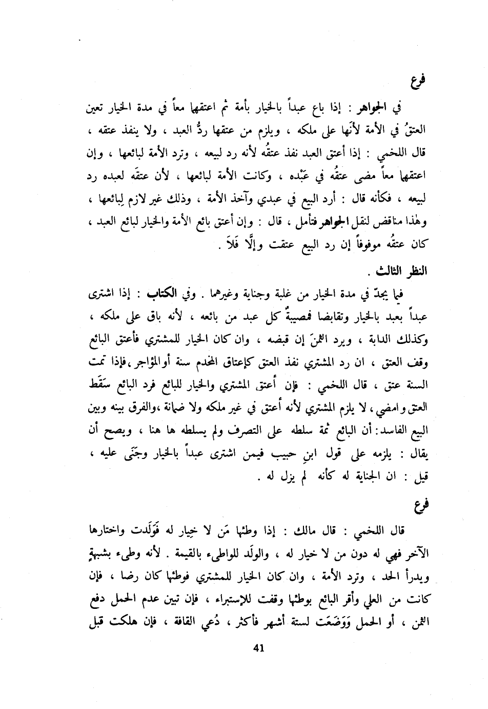 فِي الْجَوَاهِرِ إِذَا بَاعَ عَبْدًا بِالْخِيَارِ بِأمة ثمَّ اعتقها مَعًا فِي مُدَّةِ الْخِيَارِ تَعَيَّنَ الْعِتْقُ فِي الْأَمَةِ لِأَنَّهَا عَلَى مِلْكِهِ وَيَلْزَمُ مِنْ عِتْقِهَا رَدُّ الْعَبْدِ وَلَا يَنْفُذُ عِتْقُهُ قَالَ اللَّخْمِيُّ إِذَا أَعْتَقَ الْعَبْدَ نَفَذَ عِتْقُهُ لِأَنَّهُ رَدٌّ لِبَيْعِهِ وَتَرُدُّ الْأَمَةُ لِبَائِعِهَا وَإِنْ أَعْتَقَهُمَا مَعًا مَضَى عِتْقُهُ فِي عَبْدِهِ وَكَانَتِ الْأَمَةُ لِبَائِعِهَا لِأَنَّ عِتْقَهُ لِعَبْدِهِ رَدٌّ لِبَيْعِهِ فَكَأَنَّهُ قَالَ أَرُدُّ الْبَيْعَ فِي عَبْدِي وَآخُذُ الْأَمَةَ وَذَلِكَ غَيْرُ لَازِمٍ لِبَائِعِهَا وَهَذَا مُنَاقِضٌ لِنَقْلِ الْجَوَاهِرِ فَتَأمل قَالَ وَإِنْ أَعْتَقَ بَائِعُ الْأَمَةِ وَالْخِيَارُ لِبَائِعِ العَبْد كَانَ العَبْد كَانَ عتقه موفوفاً إِنْ رَدَّ الْبَيْعَ عَتَقَتْ وَإِلَّا فَلَا