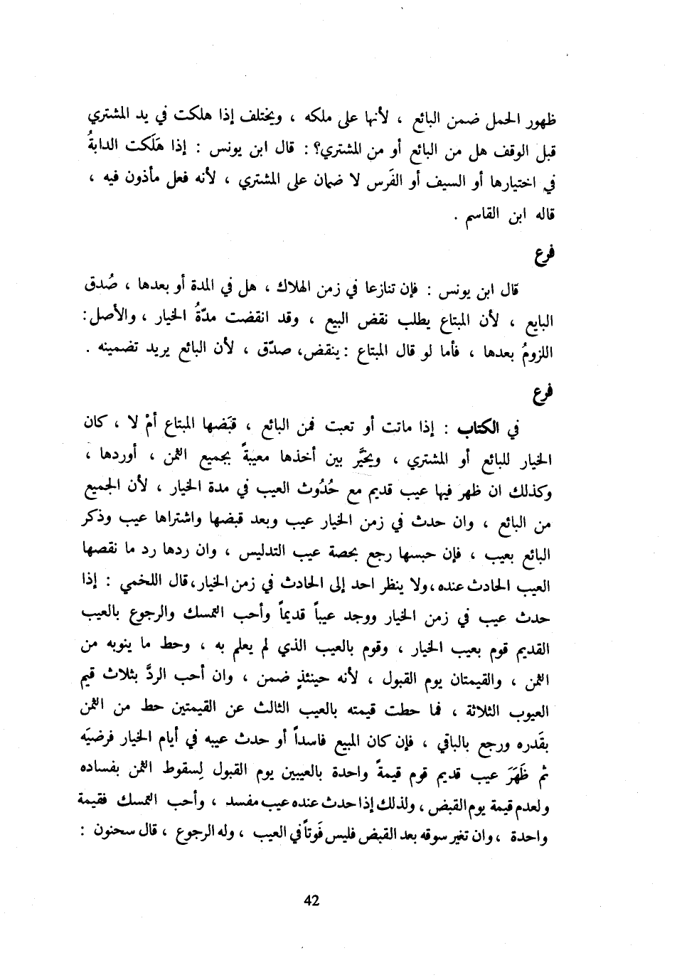 فِي الْكِتَابِ إِذَا مَاتَتْ أَوْ تَعِبَتْ فَمِنَ الْبَائِعِ قَبَضَهَا الْمُبْتَاعُ أَمْ لَا كَانَ الْخِيَارُ لِلْبَائِعِ أَوِ الْمُشْتَرِي وَيُخَيَّرُ بَيْنَ أَخْذِهَا مَعِيبَةً بِجَمِيعِ الثَّمَنِ أوردهَا وَكَذَلِكَ إِنْ ظَهَرَ فِيهَا عَيْبٌ قَدِيمٌ مَعَ حُدُوثِ الْعَيْبِ فِي مُدَّةِ الْخِيَارِ لِأَنَّ الْجَمِيعَ مِنَ الْبَائِعِ وَإِنْ حَدَثَ فِي زَمَنِ الْخِيَارِ عيب وَبعد قبضهَا واشتراها عَيْبٌ وَذَكَرَ الْبَائِعُ بِعَيْبٍ فَإِنْ حَبَسَهَا رَجَعَ بِحِصَّةِ عَيْبِ التَّدْلِيسِ وَإِنْ رَدَّهَا رَدَّ مَا نَقَصَهَا الْعَيْبُ الْحَادِثُ عِنْدَهُ وَلَا يَنْظُرُ أَحَدٌ إِلَى الْحَادِثِ فِي زَمَنِ الْخِيَارِ قَالَ اللَّخْمِيُّ إِذا حدث عيب فِي زمن الْخِيَارِ وَوَجَدَ عَيْبًا قَدِيمًا وَأَحَبَّ التَّمَسُّكَ وَالرُّجُوعَ بِالْعَيْبِ الْقَدِيمِ قَوَّمَ بِعَيْبِ الْخِيَارِ وَقَوَّمَ بِالْعَيْبِ الَّذِي لَمْ يَعْلَمْ بِهِ وَحَطَّ مَا يَنُوبُهُ مِنَ الثَّمَنِ وَالْقِيمَتَانِ يَوْمَ الْقَبُولِ لِأَنَّهُ حِينَئِذٍ ضَمِنَ وَإِنْ أَحَبَّ الرَّدَّ بِثَلَاثٍ قَيَّمَ الْعُيُوبَ الثَّلَاثَةَ فَمَا حَطَّتْ قِيمَتُهُ بِالْعَيْبِ الثَّالِثِ عَنِ الْقِيمَتَيْنِ حَطَّ مِنَ الثَّمَنِ بِقَدْرِهِ وَرَجَعَ بِالْبَاقِي فَإِنْ كَانَ الْمَبِيعُ فَاسِدًا أَوْ حَدَثَ عَيْبُهُ فِي أَيَّامِ الْخِيَارِ فَرَضِيَهُ ثُمَّ ظَهَرَ عَيْبٌ قَدِيمٌ قَوَّمَ قِيمَةً وَاحِدَةً بِالْعَيْبَيْنِ يَوْمَ الْقَبُولِ لسُقُوط الثّمن بفساده وَلعدم قيمَة يَوْمِ الْقَبْضِ وَلِذَلِكَ إِذَا حَدَثَ عِنْدَهُ عَيْبٌ مُفسد وَأحب التَّمَسُّك فقيمة وَاحِدَةٌ وَإِنْ تَغَيَّرَ سُوقُهُ بَعْدَ الْقَبْضِ فَلَيْسَ فَوْتًا فِي الْعَيْبِ وَلَهُ الرُّجُوعُ قَالَ سَحْنُونٌ