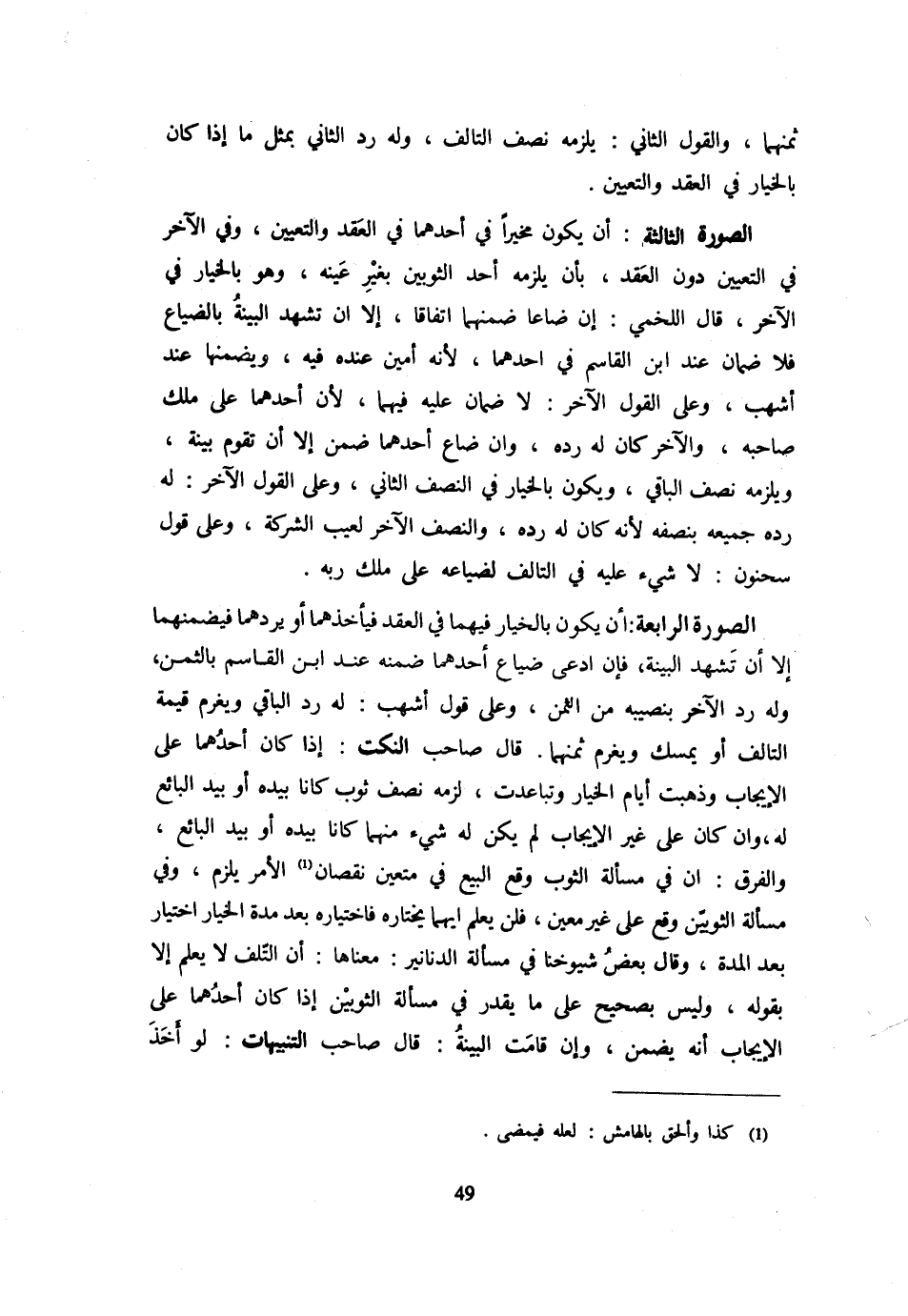 ثَمَنِهِمَا وَالْقَوْلُ الثَّانِي يَلْزَمُهُ نِصْفُ التَّالِفِ وَلَهُ رَدُّ الثَّانِي بِمِثْلِ مَا إِذَا كَانَ بِالْخِيَارِ فِي الْعَقْدِ وَالتَّعْيِينِ الصُّورَةُ الثَّالِثَةُ أَنْ يَكُونَ مُخَيَّرًا فِي أَحَدِهِمَا فِي الْعَقْدِ وَالتَّعْيِينِ وَفِي الْآخَرِ فِي التَّعْيِينِ دُونَ الْعَقْدِ بِأَنْ يَلْزَمَهُ أَحَدُ الثَّوْبَيْنِ بِغَيْرِ عَيْنِهِ وَهُوَ بِالْخِيَارِ فِي الْآخَرِ قَالَ اللَّخْمِيُّ إِنْ ضَاعَا ضَمِنَهُمَا اتِّفَاقًا إِلَّا أَنْ تَشْهَدَ الْبَيِّنَةُ بِالضَّيَاعِ فَلَا ضَمَانَ عِنْدَ ابْنِ الْقَاسِمِ فِي أَحَدِهِمَا لِأَنَّهُ أَمِينٌ عِنْده فِيهِ ويضمنها عِنْدَ أَشْهَبَ وَعَلَى الْقَوْلِ الْآخَرِ لَا ضَمَانَ عَلَيْهِ فِيهِمَا لِأَنَّ أَحَدَهُمَا عَلَى مِلْكِ صَاحِبِهِ وَالْآخَرُ كَانَ لَهُ رَدُّهُ وَإِنْ ضَاعَ أَحَدُهُمَا ضَمِنَ إِلَّا أَنْ تَقُومَ بَيِّنَةٌ وَيَلْزَمُهُ نِصْفُ الْبَاقِي وَيَكُونُ بِالْخِيَارِ فِي النِّصْفِ الثَّانِي وَعَلَى الْقَوْلِ الْآخَرِ لَهُ رَدُّهُ جَمِيعُهُ بِنِصْفِهِ لِأَنَّهُ كَانَ لَهُ رَدُّهُ وَالنِّصْفُ الْآخَرُ لِعَيْبِ الشَّرِكَةِ وَعَلَى قَوْلِ سَحْنُونٍ لَا شَيْءَ عَلَيْهِ فِي التَّالِفِ لِضَيَاعِهِ عَلَى مِلْكِ رَبِّهِ الصُّورَةُ الرَّابِعَةُ أَنْ يَكُونَ بِالْخِيَارِ فِيهِمَا فِي الْعَقْدِ فَيَأْخُذُهُمَا أَوْ يَرُدُّهُمَا فَيَضْمَنُهُمَا إِلَّا أَنْ تَشْهَدَ الْبَيِّنَةُ فَإِنِ ادَّعَى ضَيَاعَ أَحَدِهِمَا ضَمِنَهُ عِنْدَ ابْنِ الْقَاسِمِ بِالثَّمَنِ وَلَهُ رَدُّ الْآخَرِ بِنَصِيبِهِ مِنَ الثَّمَنِ وَعَلَى قَوْلِ أَشْهَبَ لَهُ رَدُّ الْبَاقِي وَيُغَرَّمُ قِيمَةَ التَّالِفِ أَوْ يُمْسِكُ وَيُغَرَّمُ ثَمَنَهُمَا قَالَ صَاحِبُ النُّكَتِ إِذَا كَانَ أَحَدُهُمَا عَلَى الْإِيجَابِ وَذَهَبَتْ أَيَّامُ الْخِيَارِ وَتَبَاعَدَتْ لَزِمَهُ نِصْفُ ثَوْبٍ كَانَا بِيَدِهِ أَوْ بِيَدِ الْبَائِعِ لَهُ وَإِنْ كَانَ عَلَى غَيْرِ الْإِيجَابِ لَمْ يَكُنْ لَهُ شَيْء مِنْهُمَا كَانَا بِيَدِهِ أَوْ بِيَدِ الْبَائِعِ لَهُ وَإِنْ كَانَ عَلَى غَيْرِ الْإِيجَابِ لَمْ يَكُنْ لَهُ شَيْء مِنْهُمَا كَانَا بِيَدِهِ أَو بيد البَائِع وَالْفَرْقُ أَنَّ فِي مَسْأَلَةِ الثَّوْبِ وَقَعَ الْبَيْعُ فِي مُتَعَيّن نُقْصَان الْأَمر يلْزم وَفِي مَسْأَلَةِ الثَّوْبَيْنِ وَقَعَ عَلَى غَيْرِ مُعَيَّنٍ فَلَنْ يعلم أَيهمَا يختاره فَاخْتِيَارُهُ بَعْدَ مُدَّةِ الْخِيَارِ اخْتِيَارٌ بَعْدَ الْمُدَّةِ وَقَالَ بَعْضُ شُيُوخِنَا فِي مَسْأَلَةِ الدَّنَانِيرِ مَعْنَاهَا أَنَّ التَّلَفَ لَا يُعْلَمُ إِلَّا بِقَوْلِهِ وَلَيْسَ بِصَحِيح على مَا يقدر فِي مَسْأَلَةِ الثَّوْبَيْنِ إِذَا كَانَ أَحَدُهُمَا عَلَى الْإِيجَابِ أَنَّهُ يَضْمَنُ وَإِنْ قَامَتِ الْبَيِّنَةُ قَالَ صَاحب التَّنْبِيهَات لَو أَخذ