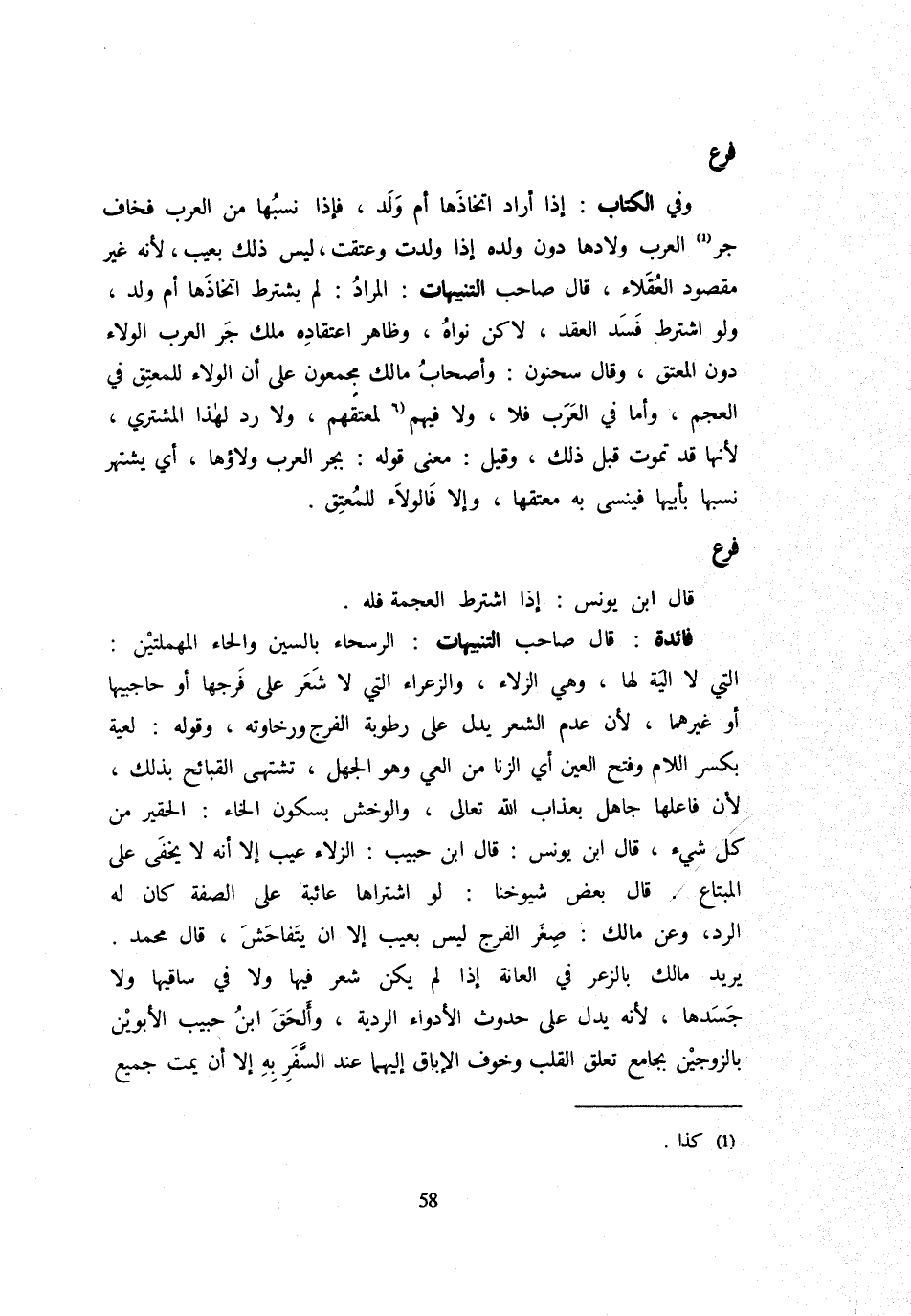 وَفِي الْكِتَابِ إِذَا أَرَادَ اتِّخَاذَهَا أَمَّ وَلَدٍ فَإِذَا نَسَبَهَا مِنَ الْعَرَبِ فَخَافَ جَرَّ الْعَرَب ولادها دُونَ وَلَدِهِ إِذَا وَلَدَتْ وَعَتَقَتْ لَيْسَ ذَلِكَ بِعَيْبٍ لِأَنَّهُ غَيْرُ مَقْصُودِ الْعُقَلَاءِ قَالَ صَاحِبُ التَّنْبِيهَاتِ الْمُرَادُ لَمْ يُشْتَرَطِ اتِّخَاذُهَا أَمَّ وَلَدٍ وَلَو اشْترط فسد العقد لاكن نَوَاهُ وَظَاهِرُ اعْتِقَادِهِ مِلْكٌ جَرَّ الْعَرَبُ الْوَلَاءَ دُونَ الْمُعْتِقِ وَقَالَ سَحْنُونٌ وَأَصْحَابُ مَالِكٍ مُجْمِعُونَ عَلَى أَنَّ الْوَلَاءَ لِلْمُعْتِقِ فِي الْعَجَمِ وَأَمَّا فِي الْعَرَبِ فَلَا وَلَا فِيهِمْ لِمُعْتِقِهِمْ وَلَا رَدَّ لِهَذَا الْمُشْتَرِي لِأَنَّهَا قَدْ تَمُوتُ قَبْلَ ذَلِك وَقيل معنى قَوْله بجر الْعَرَب ولاؤها أَيْ يَشْتَهِرُ نَسَبُهَا بِأَبِيهَا فَيُنْسَى بِهِ مُعْتِقُهَا وَإِلَّا فَالْوَلَاءُ لِلْمُعْتِقِ