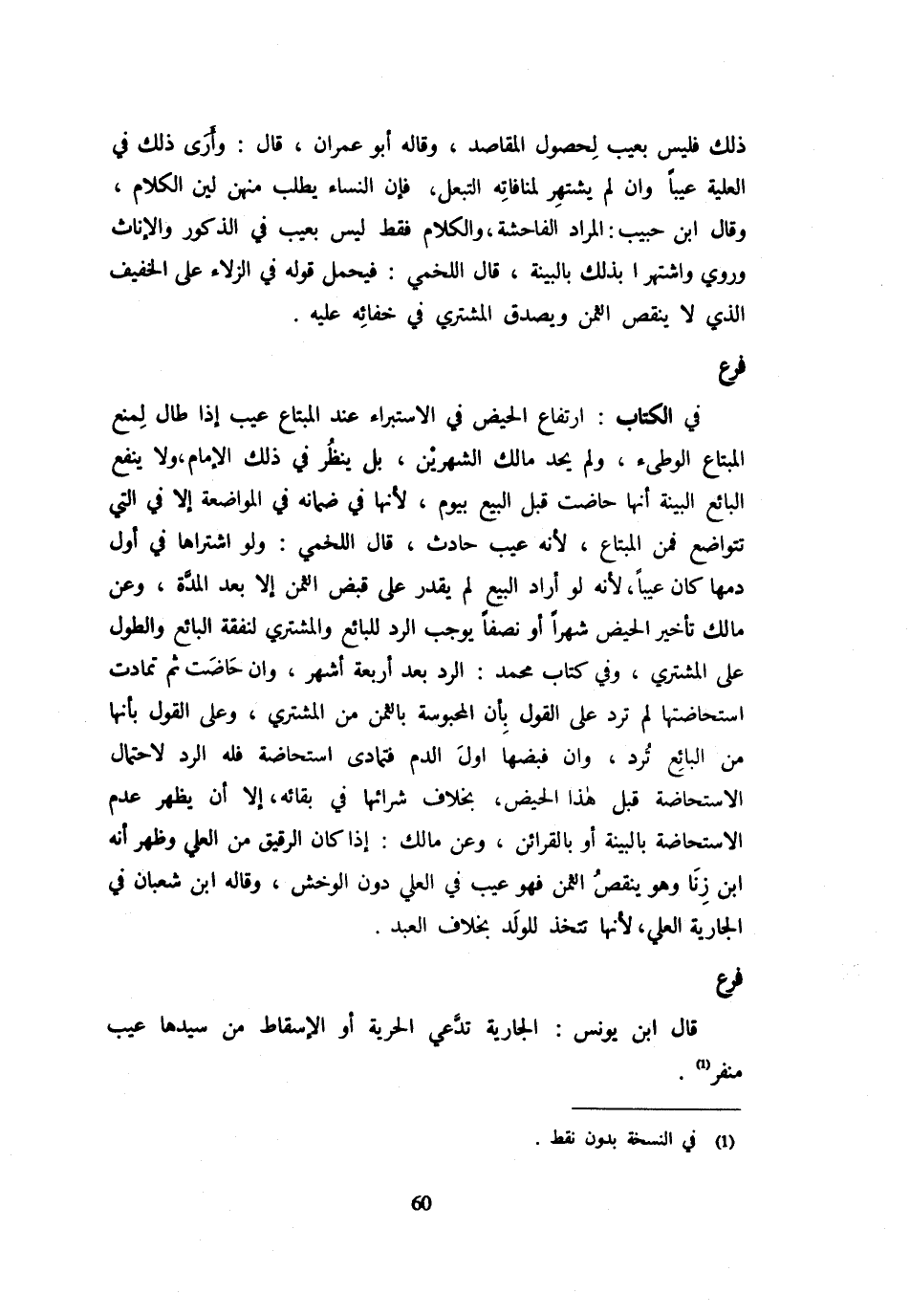 ذَلِكَ فَلَيْسَ بِعَيْبٍ لِحُصُولِ الْمَقَاصِدِ وَقَالَهُ أَبُو عمرَان قَالَ وَرَأى ذَلِكَ فِي الْعَلِيَّةِ عَيْبًا وَإِنْ لَمْ يَشْتَهِرْ لِمُنَافَاتِهِ التَّبَعُّلَ فَإِنَّ النِّسَاءَ يُطْلَبُ مِنْهُنَّ لِيِنُ الْكَلَامِ وَقَالَ ابْنُ حَبِيبٍ الْمُرَادُ الْفَاحِشَةُ وَالْكَلَامُ فَقَطْ لَيْسَ بِعَيْبٍ فِي الذُّكُورِ وَالْإِنَاثِ وَرُوِيَ وَاشْتَهَرَا بِذَلِكَ بِالْبَيِّنَةِ قَالَ اللَّخْمِيُّ فَيُحْمَلُ قَوْلُهُ فِي الزَّلَّاءِ عَلَى الْخَفِيفِ الَّذِي لَا يُنْقِصُ الثَّمَنَ وَيُصَدَّقُ الْمُشْتَرِي فِي خَفَائِهِ عَلَيْهِ