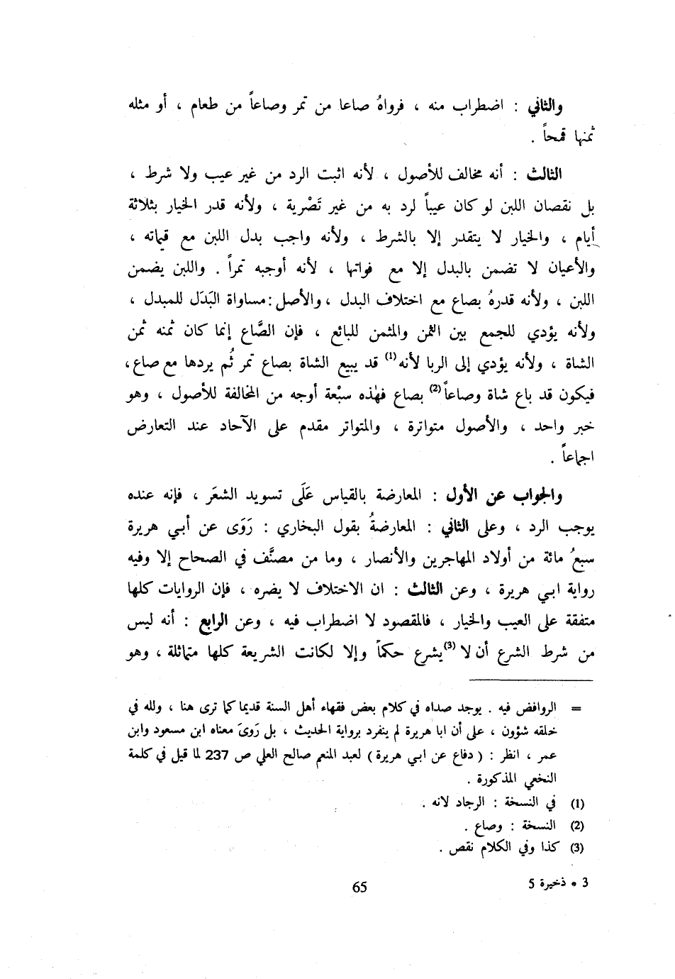 وَالثَّانِي اضْطِرَاب مِنْهُ فَرَوَاهُ صَاعا من تمر وصاعا من طَعَام أَو مثله ثمنهَا قَمْحًا الثَّالِثُ أَنَّهُ مُخَالِفٌ لِلْأُصُولِ لِأَنَّهُ أَثْبَتَ الرَّدَّ مِنْ غَيْرِ عَيْبٍ وَلَا شَرْطٍ بَلْ نُقْصَانُ اللَّبَنِ لَوْ كَانَ عَيْبًا لَرَدَّ بِهِ مِنْ غَيْرِ تَصْرِيَةٍ وَلِأَنَّهُ قَدَّرَ الْخِيَارَ بِثَلَاثَةِ أَيَّامٍ وَالْخِيَارُ لَا يَتَقَدَّرُ إِلَّا بِالشَّرْطِ وَلِأَنَّهُ وَاجِب بدل اللَّبن مَعَ قيماته وَالْأَعْيَانُ لَا تُضْمَنُ بِالْبَدَلِ إِلَّا مَعَ فَوَاتِهَا لِأَنَّهُ أَوْجَبَهُ تَمْرًا وَاللَّبَنُ يَضْمَنُ اللَّبَنَ وَلِأَنَّهُ قَدَّرَهُ بِصَاعٍ مَعَ اخْتِلَافِ الْبَدَلِ وَالْأَصْلُ مُسَاوَاةُ الْبَدَلِ لِلْمُبْدَلِ وَلِأَنَّهُ يُؤَدِّي لِلْجَمْعِ بَيْنَ الثَّمَنِ وَالْمُثَمَّنِ لِلْبَائِعِ فَإِنَّ الصَّاعَ إِنَّمَا كَانَ ثَمَنُهُ ثَمَنَ الشَّاةِ وَلِأَنَّهُ يُؤَدِّي إِلَى الرِّبَا لِأَنَّهُ قَدْ يَبِيعُ الشَّاةَ بِصَاعِ تَمْرٍ ثُمَّ يَرُدُّهَا مَعَ صَاعٍ فَيَكُونُ قَدْ بَاعَ شَاةً وَصَاعًا بِصَاعٍ فَهَذِهِ سَبْعَةُ أَوْجُهٍ مِنَ الْمُخَالَفَةِ لِلْأُصُولِ وَهُوَ خَبَرٌ وَاحِدٌ وَالْأُصُولُ مُتَوَاتِرَةٌ وَالْمُتَوَاتِرُ مُقَدَّمٌ عَلَى الْآحَادِ عِنْدَ التَّعَارُضِ إِجْمَاعًا وَالْجَوَابُ عَنِ الْأَوَّلِ الْمُعَارَضَةُ بِالْقِيَاسِ عَلَى تَسْوِيدِ الشَّعْرِ فَإِنَّهُ عِنْده يُوجب الرَّد وعَلى الثَّانِي الْمُعَارَضَةُ بِقَوْلِ الْبُخَارِيِّ رَوَى عَنْ أَبِي هُرَيْرَة سبع مائَة مِنْ أَوْلَادِ الْمُهَاجِرِينَ وَالْأَنْصَارِ وَمَا مِنْ مُصَنَّفٍ فِي الصِّحَاحِ إِلَّا وَفِيهِ رِوَايَةُ أَبِي هُرَيْرَةَ وَعَنِ الثَّالِثِ أَنَّ الِاخْتِلَافَ لَا يَضُرُّهُ فَإِنَّ الرِّوَايَاتِ كُلَّهَا مُتَّفِقَةٌ عَلَى الْعَيْبِ وَالْخِيَارِ فَالْمَقْصُودُ لَا اضْطِرَابَ فِيهِ وَعَنِ الرَّابِعِ أَنَّهُ لَيْسَ من شَرط الشَّرْع أَن لَا يُشَرِّعَ حُكْمًا وَإِلَّا لَكَانَتِ الشَّرِيعَةُ كُلُّهَا مُتَمَاثِلَةً وَهُوَ