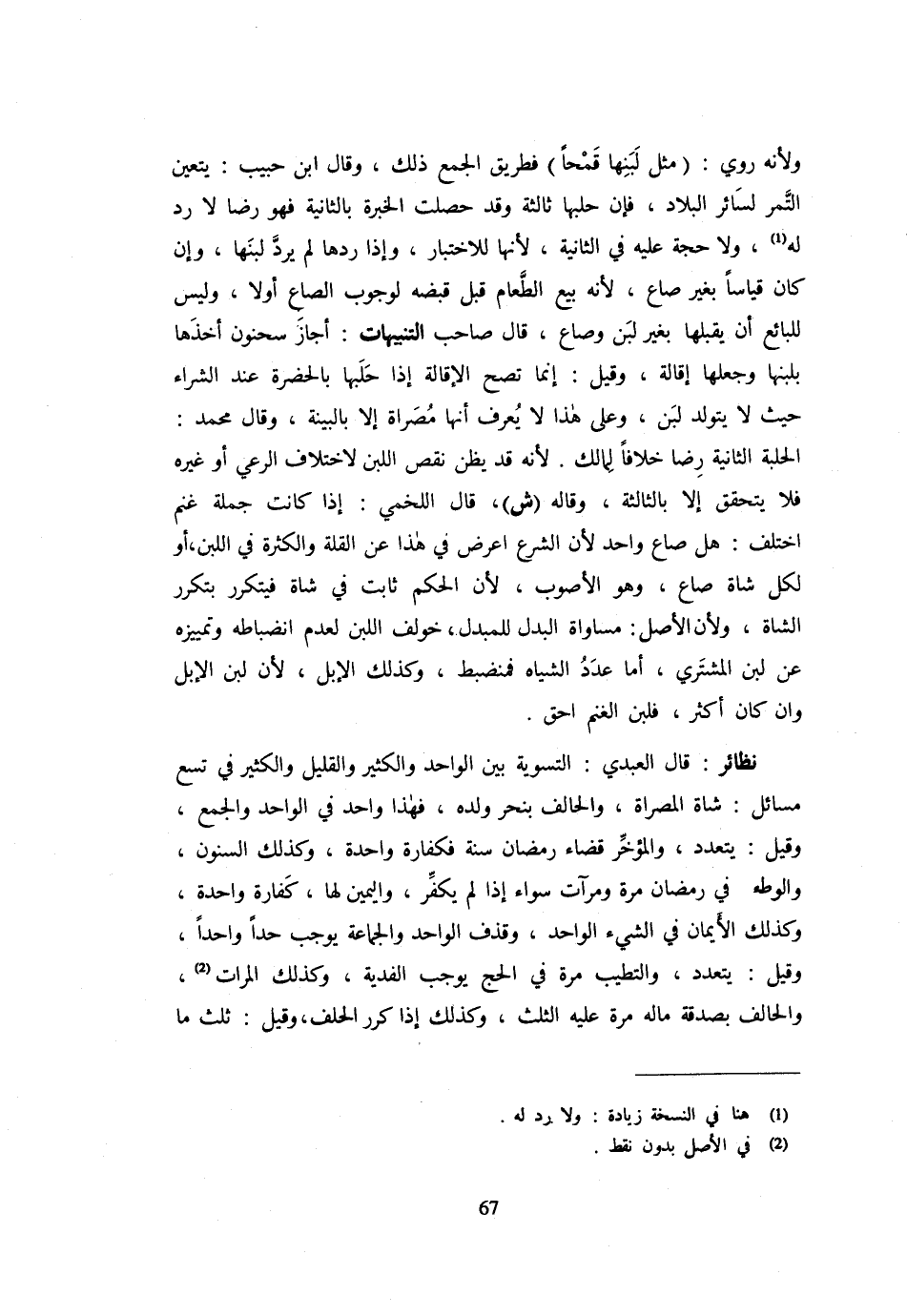 وَلِأَنَّهُ رُوِيَ مِثْلَ لَبَنِهَا قَمْحًا فَطَرِيقُ الْجَمْعِ ذَلِكَ وَقَالَ ابْنُ حَبِيبٍ يَتَعَيَّنُ التَّمْرُ لِسَائِرِ الْبِلَادِ فَإِنْ حَلَبَهَا ثَالِثَةً وَقَدْ حَصَلَتِ الْخِبْرَةُ بِالثَّانِيَةِ فَهُوَ رِضًا لَا رَدَّ لَهُ وَلَا حُجَّةَ عَلَيْهِ فِي الثَّانِيَةِ لِأَنَّهَا لِلِاخْتِبَارِ وَإِذَا رَدَّهَا لَمْ يَرُدَّ لَبَنَهَا وَإِنْ كَانَ قِيَاسًا بِغَيْرِ صَاعٍ لِأَنَّهُ بَيْعُ الطَّعَامِ قَبْلَ قَبْضِهِ لوُجُوب الصَّاع أَولا وَلَيْسَ للْبَائِع أَن يقلبها بِغَيْرِ لَبَنٍ وَصَاعٍ قَالَ صَاحِبُ التَّنْبِيهَاتِ أَجَازَ سَحْنُونٌ أَخْذَهَا بِلَبَنِهَا وَجَعَلَهَا إِقَالَةً وَقِيلَ إِنَّمَا تَصِحُّ الْإِقَالَةُ إِذَا حَلَبَهَا بِالْحَضْرَةِ عِنْدَ الشِّرَاءِ حَيْثُ لَا يَتَوَلَّدُ لَبَنٌ وَعَلَى هَذَا لَا يُعْرَفُ أَنَّهَا مُصَرَّاةٌ إِلَّا بِالْبَيِّنَةِ وَقَالَ مُحَمَّدٌ الْحَلْبَةُ الثَّانِيَةُ رِضًا خِلَافًا لِمَالِكٍ لِأَنَّهُ قَدْ يطن نَقْصَ اللَّبَنِ لِاخْتِلَافِ الرَّعْيِ أَوْ غَيْرِهِ فَلَا يَتَحَقَّقُ إِلَّا بِالثَّالِثَةِ وَقَالَهُ ش قَالَ اللَّخْمِيُّ إِذا كَانَت جملَة غنم احتلف هَلْ صَاعٌ وَاحِدٌ لِأَنَّ الشَّرْعَ أَعْرَضَ فِي هَذَا عَنِ الْقِلَّةِ وَالْكَثْرَةِ فِي اللَّبَنِ أَوْ لِكُلِّ شَاةٍ صَاعٌ وَهُوَ الْأَصْوَبُ لِأَنَّ الْحُكْمَ ثَابِتٌ فِي شَاةٍ فَيَتَكَرَّرُ بِتَكَرُّرِ الشَّاةِ وَلِأَنَّ الْأَصْلَ مُسَاوَاةُ الْبَدَلِ لِلْمُبْدَلِ خُولِفَ اللَّبَنُ لِعَدَمِ انْضِبَاطِهِ وَتَمْيِيزِهِ عَنْ لَبَنِ الْمُشْتَرِي أَمَّا عَدَدُ الشِّيَاهِ فَمُنْضَبِطٌ وَكَذَلِكَ الْإِبِلُ لِأَنَّ لَبَنَ الْإِبِلِ وَإِنْ كَانَ أَكْثَرُ فَلَبَنُ الْغَنَمِ أَحَقُّ نَظَائِرُ قَالَ الْعَبْدِيُّ التَّسْوِيَةُ بَيْنَ الْوَاحِدِ وَالْكَثِيرِ وَالْقَلِيلِ وَالْكَثِيرِ فِي تِسْعِ مَسَائِلَ شَاةُ الْمُصَرَّاةِ وَالْحَالِفُ بِنَحْرِ وَلَدِهِ فَهَذَا وَاحِدٌ فِي الْوَاحِدِ وَالْجَمْعِ وَقِيلَ يَتَعَدَّدُ وَالْمُؤَخِّرُ قَضَاءَ رَمَضَانَ سَنَةً فَكَفَّارَةٌ وَاحِدَة وَكَذَلِكَ السنون وَالْوَطْء فِي رَمَضَانَ مَرَّةً وَمَرَّاتٍ سَوَاءٌ إِذَا لَمْ يُكَفِّرْ وَالْيَمِينُ لَهَا كَفَارَّةٌ وَاحِدَةٌ وَكَذَلِكَ الْأَيْمَانُ فِي الشَّيْءِ الْوَاحِدِ وَقَذْفُ الْوَاحِدِ وَالْجَمَاعَةِ يُوجِبُ حَدًّا وَاحِدًا وَقِيلَ يَتَعَدَّدُ وَالتَّطَيُّبُ مَرَّةً فِي الْحَجِّ يُوجِبُ الْفِدْيَةَ وَكَذَلِكَ الْمَرَّاتُ وَالْحَالِفُ بِصَدَقَةِ مَالِهِ مَرَّةً عَلَيْهِ الثُّلُثُ وَكَذَلِكَ إِذَا كَرَّرَ الْحَلِفَ وَقِيلَ ثُلُثُ مَا