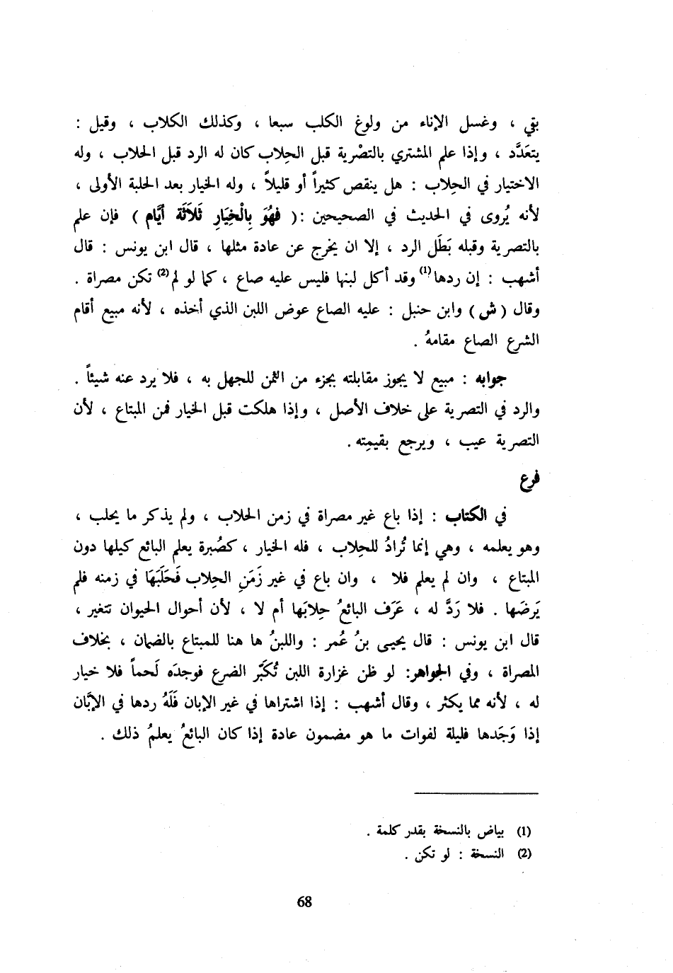 بَقِيَ وَغَسْلُ الْإِنَاءِ مِنْ وُلُوغِ الْكَلْبِ سَبْعًا وَكَذَلِكَ الْكِلَابُ وَقِيلَ يَتَعَدَّدُ وَإِذَا عَلِمَ الْمُشْتَرِي بِالتَّصْرِيَةِ قَبْلَ الْحِلَابِ كَانَ لَهُ الرَّدُّ قَبْلَ الْحِلَابِ وَلَهُ الِاخْتِيَارُ فِي الْحِلَابِ هَلْ يَنْقُصُ كَثِيرًا أَوْ قَلِيلًا وَلَهُ الْخِيَارُ بَعْدَ الْحَلْبَةِ الْأُولَى لِأَنَّهُ يُرْوَى فِي الْحَدِيثِ فِي الصَّحِيحَيْنِ فَهُوَ بِالْخِيَارِ ثَلَاثَةَ أَيَّامٍ فَإِنْ عَلِمَ بِالتَّصْرِيَةِ وَقَبِلَهُ بَطَلَ الرَّدُّ إِلَّا أَنْ يَخْرُجَ عَنْ عَادَةِ مِثْلِهَا قَالَ ابْنُ يُونُسَ قَالَ أَشْهَبُ إِنْ رَدَّهَا وَقَدْ أَكَلَ لَبَنَهَا فَلَيْسَ عَلَيْهِ صَاعٌ كَمَا لَوْ لَمْ تَكُنْ مُصَرَّاةً وَقَالَ ش وَابْنُ حَنْبَلٍ عَلَيْهِ الصَّاعُ عِوَضَ اللَّبَنِ الَّذِي أَخَذَهُ لِأَنَّهُ مَبِيعٌ أَقَامَ الشَّرْعُ الصَّاعَ مَقَامَهُ جَوَابُهُ مَبِيعٌ لَا يَجُوزُ مُقَابَلَتُهُ بِجُزْءٍ مِنَ الثَّمَنِ لِلْجَهْلِ بِهِ فَلَا يَرُدُّ عَنْهُ شَيْئًا وَالرَّدُّ فِي التَّصْرِيَةِ عَلَى خِلَافِ الْأَصْلِ وَإِذَا هَلَكَتْ قَبْلَ الْخِيَارِ فَمِنَ الْمُبْتَاعِ لِأَنَّ التَّصْرِيَةَ عَيْبٌ وَيَرْجِعُ بِقِيمَتِهِ