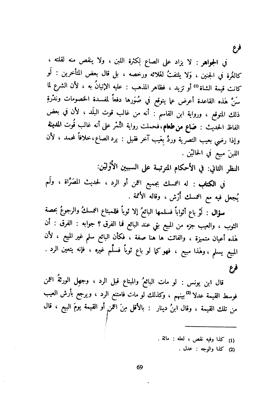 فِي الْجَوَاهِرِ لَا يُزَادُ عَلَى الصَّاعِ لِكَثْرَةِ اللَّبَنِ وَلَا يُنْقَصُ مِنْهُ لِقِلَّتِهِ كَالْغُرَّةِ فِي الْجَنِينِ وَلَا يَلْتَفِتُ لِغَلَائِهِ وَرُخْصِهِ بَلْ قَالَ بَعْضُ الْمُتَأَخِّرِينَ لَوْ كَانَتْ قِيمَةُ الشَّاةِ أَوْ تَزِيدُ فَظَاهِرُ الْمَذْهَبِ عَلَيْهِ الْإِتْيَانُ بِهِ لِأَنَّ الشَّرْعَ لَمَا سَنَّ هَذِهِ الْقَاعِدَةَ أَعْرَضَ عَمَّا يتَوَقَّع فِي صورها دفعا لمفدسة الْخُصُومَاتِ وَنُدْرَةِ ذَلِكَ الْمُتَوَقَّعِ وَرِوَايَةُ ابْنِ الْقَاسِمِ أَنَّهُ مِنْ غَالَبِ قُوتِ الْبَلَدِ لِأَنَّ فِي بَعْضِ أَلْفَاظِ الْحَدِيثِ صَاعٌ مِنْ طَعَامٍ فَحُمِلَتْ رِوَايَةُ التَّمْرِ عَلَى أَنَّهُ غَالِبُ قُوتِ الْمَدِينَةِ وَإِذَا رَضِيَ بِعَيْبِ التَّصْرِيَةِ وَرَدَّ بِعَيْبٍ آخَرَ فَقِيلَ يَرُدُّ الصَّاعَ خِلَافًا لِمُحَمَّدٍ لِأَنَّ اللَّبَنَ مَبِيعٌ فِي الْحَالَيْنِ
