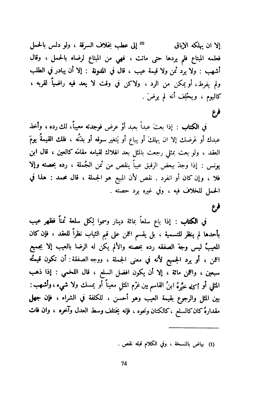 فِي الْكِتَابِ إِذَا بِعْتَ عَبْدًا بِعَبْدٍ أَوْ عَرْضٍ فَوَجَدْتَهُ مَعِيبًا لَكَ رَدُّهُ وَأَخْذُ عَبْدِكَ أَوْ عَرْضِكَ إِلَّا أَنْ يَهْلِكَ أَوْ يُبَاعَ أَوْ يَتَغَيَّرَ سُوقُةُ أَوْ بَدَنُهُ فَلَكَ الْقِيمَةُ يَوْمَ العقد وَلَو بِعْت بمثلي رجعت بِالْمثلِ بهد الْهَلَاكِ لِقِيَامِهِ مَقَامَهُ كَالْعَيْنِ قَالَ ابْنُ يُونُسَ إِذَا وُجِدَ بِبَعْضِ الرَّقِيقِ عَيْبًا يَنْقُصُ مِنْ ثَمَنِ الْجُمْلَةِ رَدَّهُ بِحِصَّتِهِ وَإِلَّا فَلَا وَإِنْ كَانَ أَو انْفَرَدَ نَقَصَ لِأَنَّ الْمَبِيعَ هُوَ الْجُمْلَةُ قَالَ مُحَمَّدٌ هَذَا فِي الْحَمْلِ لِلْخِلَافِ فِيهِ وَفِي غَيْرِهِ يَرُدُّ حِصَّتَهُ