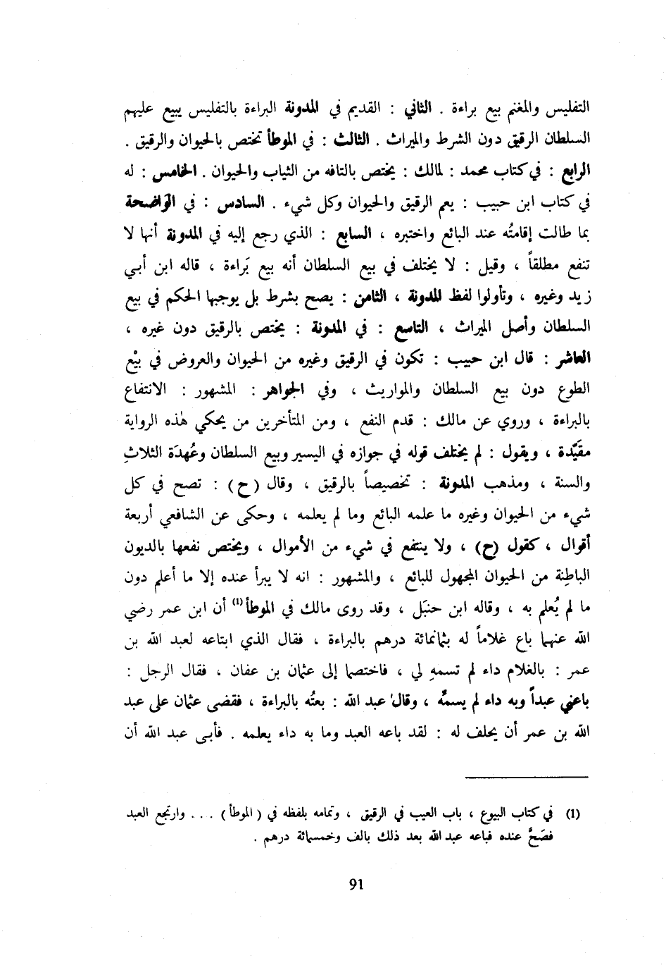 التَّفْلِيسِ وَالْمَغْنَمِ بَيْعُ بَرَاءَةٍ الثَّانِي الْقَدِيمُ فِي الْمُدَوَّنَةِ الْبَرَاءَةُ بِالتَّفْلِيسِ يَبِيعُ عَلَيْهِمُ السُّلْطَانُ الرَّقِيقَ دُونَ الشَّرْطِ وَالْمِيرَاثِ الثَّالِثُ فِي الْمُوَطَّأِ تَخْتَصُّ بِالْحَيَوَانِ وَالرَّقِيقِ الرَّابِعُ فِي كِتَابِ مُحَمَّدٍ لِمَالِكٍ يخْتَص بِالتَّافِهِ مِنَ الثِّيَابِ وَالْحَيَوَانِ الْخَامِسُ لَهُ فِي كِتَابِ ابْنِ حَبِيبٍ يَعُمُّ الرَّقِيقَ وَالْحَيَوَانَ وَكُلَّ شَيْءٍ السَّادِسُ فِي الْوَاضِحَةِ بِمَا طَالَتْ إِقَامَتُهُ عِنْدَ الْبَائِعِ وَاخْتَبَرَهُ السَّابِعُ الَّذِي رَجَعَ إِلَيْهِ فِي الْمُدَوَّنَةِ أَنَّهَا لَا تَنْفَعُ مُطْلَقًا وَقِيلَ لَا يَخْتَلِفُ فِي بَيْعِ السُّلْطَانِ أَنَّهُ بَيْعُ بَرَاءَةٍ قَالَهُ ابْنُ أَبِي زَيْدٍ وَغَيْرُهُ وَتَأَوَّلُوا لَفْظَ الْمُدَوَّنَةِ الثَّامِنُ يَصِحُّ بِشَرْطٍ بَلْ يُوجِبُهَا الْحَكَمُ فِي بَيْعِ السُّلْطَانِ وَأَصْلِ الْمِيرَاثِ التَّاسِعُ فِي الْمُدَوَّنَةِ يَخْتَصُّ بِالرَّقِيقِ دُونَ غَيْرِهِ الْعَاشِرُ قَالَ ابْنُ حَبِيبٍ تَكُونُ فِي الرَّقِيقِ وَغَيْرِهِ مِنَ الْحَيَوَانِ وَالْعُرُوضِ فِي بَيْعِ الطَّوْعِ دُونَ بَيْعِ السُّلْطَانِ وَالْمَوَارِيثِ وَفِي الْجَوَاهِرِ الْمَشْهُورُ الِانْتِفَاعُ بِالْبَرَاءَةِ وَرُوِيَ عَن مَالك قدم النَّفْعِ وَمِنَ الْمُتَأَخِّرِينَ مَنْ يَحْكِي هَذِهِ الرِّوَايَةَ مُقَيّدَة وَيَقُول لم يخْتَلف قَوْله فِي جَوَازه فِي الْيَسِيرِ وَبَيْعِ السُّلْطَانِ وَعُهْدَةُ الثَّلَاثِ وَالسَّنَةِ وَمذهب الْمُدَوَّنَة تَخْصِيصًا بِالرَّقِيقِ وَقَالَ ح تَصِحُّ فِي كُلِّ شَيْءٍ مِنَ الْحَيَوَانِ وَغَيْرِهِ مَا عَلِمَهُ الْبَائِعُ وَمَا لم يُعلمهُ وَحكى عَن الشَّافِعِي أَرْبَعَة أَقْوَال كَقَوْل ح وَلَا ينْتَفع فِي شَيْء من الْأَمْوَال وَيخْتَص نَفعهَا بالديون الْبَاطِنَةِ مِنَ الْحَيَوَانِ الْمَجْهُولِ لِلْبَائِعِ وَالْمَشْهُورُ أَنَّهُ لَا يَبْرَأُ عِنْدَهُ إِلَّا مَا أُعْلِمَ دُونَ مَا لَمْ يُعْلَمْ بِهِ وَقَالَهُ ابْنُ حَنْبَلٍ وَقَدْ رَوَى مَالِكٌ فِي الْمُوَطَّأِ أَنَّ ابْنَ عُمَرَ رَضِيَ اللَّهُ عَنْهُمَا بَاعَ غُلَامًا لَهُ بِثَمَانِمِائَةِ دِرْهَمٍ بِالْبَرَاءَةِ فَقَالَ الَّذِي ابْتَاعَهُ لِعَبْدِ اللَّهِ بْنِ عُمَرَ بِالْغُلَامِ دَاءٌ لَمْ تُسَمِّهِ لِي فَاخْتَصَمَا إِلَى عُثْمَانَ بْنِ عَفَّانَ فَقَالَ الرَّجُلُ بَاعَنِي عَبْدًا وَبِهِ دَاءٌ لَمْ يُسَمِّهِ وَقَالَ عَبْدُ اللَّهِ بِعْتُهُ بِالْبَرَاءَةِ فَقَضَى عُثْمَانُ عَلَى عَبْدِ اللَّهِ بْنِ عُمَرَ أَنْ يَحْلِفَ لَهُ لَقَدْ بَاعَهُ الْعَبْدُ وَمَا بِهِ دَاءٌ يَعْلَمُهُ فَأَبَى عَبْدُ اللَّهِ أَنْ