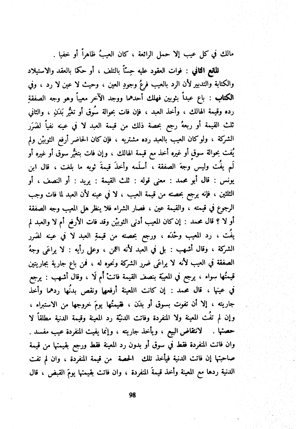 مَالِكٍ فِي كُلِّ عَيْبٍ إِلَّا حَمْلَ الرَّائِعَةِ كَانَ الْعَيْبُ ظَاهِرًا أَوْ خَفِيًّا الْمَانِعُ الثَّانِي: فَوَاتُ الْعُقُودِ عَلَيْهِ حِسًّا بِالتَّلَفِ أَوْ حُكْمًا بِالْعَقْدِ وَالِاسْتِيلَادِ وَالْكِتَابَةِ وَالتَّدْبِيرِ لِأَنَّ الرَّدَّ بِالْعَيْبِ فَرْعُ وُجُودِ الْعَيْنِ وَحَيْثُ لَا عَيْنَ لَا رَدَّ وَفِي الْكِتَابِ: بَاعَ عَبْدًا بِثَوْبَيْنِ فَهَلَكَ أَحَدُهُمَا وَوَجَدَ الْآخَرَ مَعِيبًا وَهُوَ وَجْهُ الصَّفْقَةِ رَدَّهُ وَقِيمَةَ الْهَالِكِ وَأَخَذَ الْعَبْدَ فَإِنْ فَاتَ بحوالة سوق أَو تغير بدن وَالثَّانِي ثُلُثُ الْقِيمَةِ أَوْ رُبُعُهُ رَجَعَ بِحِصَّةِ ذَلِكَ مِنْ قِيمَةِ الْعَبْدِ لَا فِي عَيْنِهِ نَفْيًا لِضَرَرِ الشَّرِكَةِ وَلَوْ كَانَ الْعَيْبُ بِالْعَبْدِ رَدَّهُ مُشْتَرِيهِ فَإِنْ كَانَ الْحَاضِرُ أَرْفَعَ الثَّوْبَيْنِ وَلَمْ يُفَتْ بِحَوَالَةِ سُوقٍ أَوْ غَيْرِهِ أُخِذَ مَعَ قِيمَةِ الْهَالِكِ وَإِنْ فَاتَ بِتَغَيُّرِ سُوقٍ أَوْ غَيْرِهِ أَوْ لَمْ يَفُتْ وَلَيْسَ وَجْهَ الصَّفْقَةِ أَسْلَمَهُ وَأَخَذَ قِيمَةَ ثَوْبِهِ مَا بَلَغَتْ قَالَ ابْنُ يُونُسَ: قَالَ أَبُو مُحَمَّدٍ: مَعْنَى قَوْلِهِ: ثُلْثُ الْقِيمَةِ: يُرِيدُ: أَوِ النِّصْفَ أَوِ الثُّلُثَيْنِ فَإِنَّهُ يَرْجِعُ بِحِصَّتِهِ مِنْ قِيمَةِ الْعَيْبِ لَا فِي عَيْنِهِ لِأَنَّ الْعَبْدَ لَمَّا فَاتَ وَجَبَ الرُّجُوعُ فِي قِيمَتِهِ وَالْقِيمَةُ عَيْنٌ فَصَارَ الشِّرَاءُ فَلَا ينظر هَل الْمَعِيب وَجه الصَّفْقَة أَولا؟ قَالَ مُحَمَّدٌ: إِنْ كَانَ الْمَعِيبُ أَدْنَى الثَّوْبَيْنِ وَقَدْ فَاتَ الْأَرْفَعُ أَمْ لَا وَالْعَبْدُ لَمْ يَفُتْ رَدَّ الْمَعِيبَ وَحْدَهُ وَرَجَعَ بِحِصَّتِهِ مِنْ قِيمَةِ الْعَبْدِ لَا فِي عَيْنِهِ لِضَرَرِ الشَّرِكَةِ وَقَالَ أَشْهَبُ: بَلْ فِي الْعَبْدِ لِأَنَّهُ الثَّمَنُ وَعَلَى رَأْيِهِ: لَا يُرَاعَى وَجْهُ الصَّفْقَةِ فِي الْعَيْبِ لِأَنَّهُ لَا يُرَاعَى ضَرَرُ الشَّرِكَةِ وَنَحْوَهُ لَهُ فَمن بَاعَ جَارِيَة بجاريتين قيمتهَا سَوَاءٌ يَرْجِعُ فِي الْمَعِيبَةِ بِنِصْفِ الْقِيمَةِ فَاتَتْ أَمْ لَا وَقَالَ أَشْهَبُ: يَرْجِعُ فِي عَيْنِهَا قَالَ مُحَمَّد: إِن كَانَت الْمعينَة أَرْفَعَهَا وَنَقَصَ بَدَنُهَا رَدَّهُمَا وَأَخَذَ جَارِيَتَهُ إِلَّا أَنْ تَفُوتَ بِسُوقٍ أَوْ بَدَنٍ فَقِيمَتُهَا يَوْمَ خُرُوجهَا من الإستبراء وَإِن لم تفت الْمعينَة لَا المنفردة وفاتت الدنية رد الْمعينَة وَقِيمَة الدنية مُطلقًا لَا حصَّتهَا لِانَتَقَاضِ الْبَيْعِ وَيَأْخُذُ جَارِيَتَهُ وَإِنَّمَا يُفِيتُ الْمُنْفَرِدَةَ عَيْبٌ مُفْسِدٌ وَإِنْ فَاتَتِ الْمُنْفَرِدَةُ فَقَطْ فِي سوق أَو بِدُونِ رد الْمعينَة فَقَطْ وَرَجَعَ بِقِيمَتِهَا مِنْ قِيمَةِ صَاحِبَتِهَا إِنْ فَاتَتِ الدَّنِيَّةُ فَيَأْخُذُ تِلْكَ الْحِصَّةَ مِنْ قِيمَةِ الْمُنْفَرِدَةِ وَإِنْ لَمْ تَفُتِ الدَّنِيَّةُ رَدَّهَا مَعَ الْمعينَة وَأَخَذَ قِيمَةَ الْمُنْفَرِدَةِ وَإِنْ فَاتَتْ بِقِيمَتِهَا يَوْمَ الْقَبْض قَالَ
