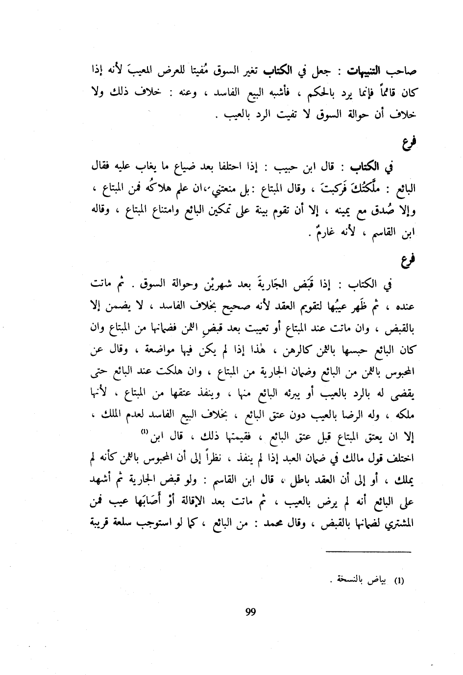 فَرْعٌ فِي الْكِتَابِ: إِذَا قَبَضَ الْجَارِيَةَ بَعْدَ شَهْرَيْنِ وَحَوَالَةَ السُّوقِ ثُمَّ مَاتَتْ عِنْدَهُ ثُمَّ ظَهَرَ عيبها لتقويم الْعَقْدُ لِأَنَّهُ صَحِيحٌ بِخِلَافِ الْفَاسِدِ لَا يُضْمَنُ إِلَّا بِالْقَبْضِ وَإِنْ مَاتَتْ عِنْدَ الْمُبْتَاعِ أَوْ تَعَيَّبَتْ بَعْدَ قَبْضِ الثَّمَنِ فَضَمَانُهَا مِنَ الْمُبْتَاعِ وَإِنْ كَانَ الْبَائِعُ حَبَسَهَا بِالثَّمَنِ كَالرَّهْنِ هَذَا إِذَا لَمْ يَكُنْ فِيهَا مُوَاضَعَةٌ وَقَالَ عَنِ الْمَحْبُوسِ بِالثَّمَنِ مِنَ الْبَائِعِ وَضَمَانِ الْجَارِيَةِ مِنَ الْمُبْتَاعِ وَإِنْ هَلَكَتْ عِنْدَ الْبَائِعِ حَتَّى يُقْضَى لَهُ بِالرَّدِّ بِالْعَيْبِ أَوْ يُبَرِّئُهُ الْبَائِعُ مِنْهَا وَيَنْفُذُ عِتْقُهَا مِنَ الْمُبْتَاعِ لِأَنَّهَا مِلْكُهُ وَلَهُ الرِّضَا بِالْعَيْبِ دُونَ عِتْقِ الْبَائِعِ بِخِلَافِ الْبَيْعِ الْفَاسِد لعدم الْملك إِلَّا أَنْ يُعْتِقَ الْمُبْتَاعُ قَبْلَ عِتْقِ الْبَائِعِ فَقِيمَتُهَا ذَلِكَ قَالَ ابْنُ اخْتَلَفَ قَوْلُ مَالِكٍ فِي ضَمَانِ الْعَبْدِ إِذَا لَمْ يَنْفُذْ نَظَرًا إِلَى أَنَّ الْمَحْبُوسَ بِالثَّمَنِ كَأَنَّهُ لَمْ يَمْلِكْ أَوْ إِلَى أَنَّ الْعَقْدَ بَاطِلٌ قَالَ ابْنُ الْقَاسِمِ: وَلَوْ قَبَضَ الْجَارِيَةَ ثُمَّ أَشْهَدَ عَلَى الْبَائِعِ أَنَّهُ لَمْ يَرْضَ بِالْعَيْبِ ثُمَّ مَاتَتْ بَعْدَ الْإِقَالَةِ أَوْ أَصَابَهَا عَيْبٌ فَمِنَ الْمُشْتَرِي لِضَمَانِهَا بِالْقَبْضِ وَقَالَ مُحَمَّدٌ: مِنَ الْبَائِعِ كَمَا لَو اسْتوْجبَ سلْعَة قريبَة
