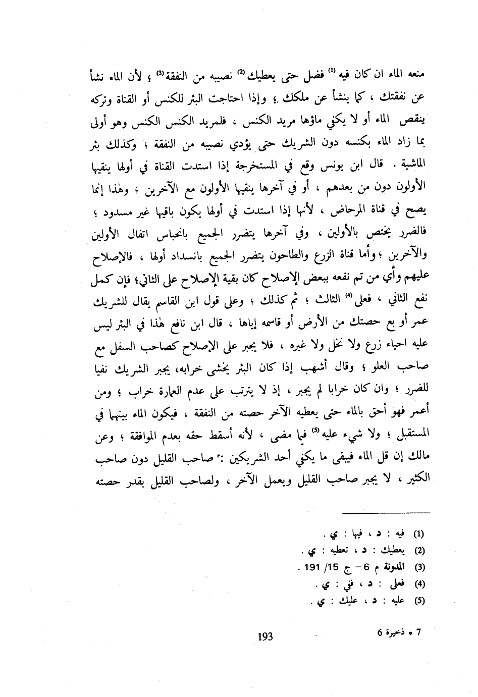 مَنعه المَاء ان كَانَ فِيهِ فَضْلٌ حَتَّى يُعْطِيَكَ نَصِيبَهُ مِنَ النَّفَقَةِ لِأَنَّ الْمَاءَ نَشَأَ عَنْ نَفَقَتِكَ كَمَا يَنْشَأُ عَنْ مِلْكِكَ وَإِذَا احْتَاجَتِ الْبِئْرُ لِلْكَنْسِ أَوِ الْقَنَاةُ وَتَرْكُهُ يَنْقُصُ الْمَاءَ أَوْ لَا يَكْفِي مَاؤُهَا مُرِيدَ الْكَنْسِ فَلِمُرِيدِ الْكَنْسِ الْكَنْسُ وَهُوَ أَوْلَى بِمَا زَادَ الْمَاءُ بِكَنْسِهِ دُونَ الشَّرِيكِ حَتَّى يُؤَدِّيَ نَصِيبَهُ مِنَ النَّفَقَةِ وَكَذَلِكَ بِئْرُ الْمَاشِيَةِ قَالَ ابْنُ يُونُسَ وَقَعَ فِي الْمُسْتَخْرَجَةِ إِذَا اسْتَدَّتِ الْقَنَاةُ فِي أَوَّلِهَا يُنَقِّيهَا الْأَوَّلُونَ دُونَ مَنْ بَعْدَهُمْ أَوْ فِي آخِرِهَا ينقيها الْأَولونَ مَعَ الآخرين وَهَذَا إِنَّمَا يَصح فِي قَنَاةِ الْمِرْحَاضِ لِأَنَّهَا إِذَا اسْتَدَّتْ فِي أَوَّلِهَا يَكُونُ بَاقِيهَا غَيْرَ مَسْدُودٍ فَالضَّرَرُ يَخْتَصُّ بالأولين وَفِي آخرهَا يتَضَرَّر الْجَمِيع بانحباس اتفال الْأَوَّلِينَ وَالْآخَرِينَ وَأَمَّا قَنَاةُ الزَّرْعِ وَالطَّاحُونِ يَتَضَرَّرُ الْجَمِيعُ بِانْسِدَادِ أَوَّلِهَا فَالْإِصْلَاحُ عَلَيْهِمْ وَأَيٌّ مَنْ تَمَّ نَفْعُهُ بِبَعْضِ الْإِصْلَاحِ كَانَ بَقِيَّةُ الْإِصْلَاحِ عَلَى الثَّانِي فَإِنْ كَمُلَ نَفْعُ الثَّانِي فَعَلَى الثَّالِثِ ثُمَّ كَذَلِكَ وَعَلَى قَوْلِ ابْنِ الْقَاسِمِ يُقَالُ لِلشَّرِيكِ عَمِّرْ أَوْ بِعْ حِصَّتَكَ مِنَ الْأَرْضِ أَوْ قَاسِمْهُ إِيَّاهَا قَالَ ابْنُ نَافِعٍ هَذَا فِي الْبِئْرِ لَيْسَ عَلَيْهِ إِحْيَاءُ زَرْعٍ وَلَا نَخْلٍ وَلَا غَيْرُهُ فَلَا يُجْبَرُ عَلَى الْإِصْلَاحِ كَصَاحِبِ السُّفْلِ مَعَ صَاحِبِ الْعُلُوِّ وَقَالَ أَشْهَبُ إِذَا كَانَ الْبِئْرُ يُخْشَى خَرَابُهُ يُجْبَرُ الشَّرِيكُ نَفْيًا لِلضَّرَرِ وَإِنْ كَانَ خَرَابًا لَمْ يُجْبَرْ إِذْ لَا يَتَرَتَّبُ عَلَى عَدَمِ الْعِمَارَةِ خراب وَمن أعمر فَهُوَ أَحَقُّ بِالْمَاءِ حَتَّى يُعْطِيَهُ الْآخَرُ حِصَّتَهُ مِنَ النَّفَقَةِ فَيَكُونُ الْمَاءُ بَيْنَهُمَا فِي الْمُسْتَقْبَلِ وَلَا شَيْءَ عَلَيْهِ فِيمَا مَضَى لِأَنَّهُ أَسْقَطَ حَقَّهُ بِعَدَمِ الْمُوَافَقَةِ وَعَنْ مَالِكٍ إِنْ قَلَّ المَاء فَيبقى مَا يَكْفِي أحد الشَّرِيكَيْنِ وَصَاحب الْقَلِيلِ دُونَ صَاحِبِ الْكَثِيرِ لَا يُجْبَرُ صَاحِبُ الْقَلِيلِ وَيَعْمَلُ الْآخَرُ وَلِصَاحِبِ الْقَلِيلِ بِقَدْرِ حِصَّتِهِ