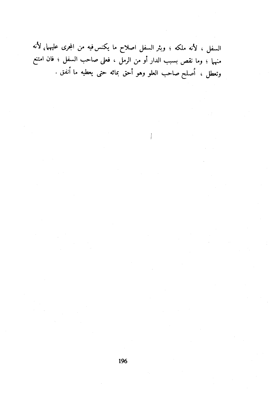السُّفْلِ لِأَنَّهُ مِلْكُهُ وَبِئْرُ السُّفْلِ إِصْلَاحُ مَا يُكْنَسُ فِيهِ مِنَ الْمَجْرَى عَلَيْهِمَا لِأَنَّهُ مِنْهُمَا وَمَا نَقَصَ بِسَبَبِ الدَّارِ أَوْ مِنَ الرَّمْلِ فعلى صَاحب السّفل فان امْتنع وتعطل أصلح صَاحِبُ الْعُلُوِّ وَهُوَ أَحَقُّ بِمَائِهِ حَتَّى يُعْطِيَهُ مَا أنْفق