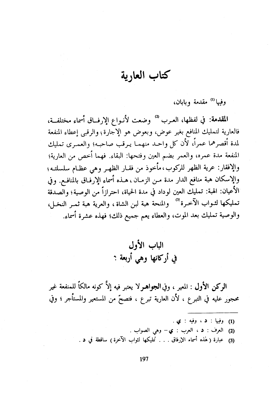 وَفِيهَا مُقَدِّمَةُ وَبَابَانِ الْمُقَدِّمَةُ فِي لَفظهَا الْعَرَب وضعَتْ لِأَنْوَاعِ الْإِرْفَاقِ أَسْمَاءً مُخْتَلِفَةً فَالْعَارِيَةُ لِتَمْلِيكِ الْمَنَافِعِ بِغَيْرِ عِوَضٍ وَبِعِوَضٍ هُوَ الْإِجَارَةُ وَالرُّقْبَى إِعْطَاءُ الْمَنْفَعَةِ لِمُدَّةٍ أَقْصَرُهُمَا عُمْرًا لِأَنَّ كُلَّ وَاحِدٍ مِنْهُمَا يَرْقُبُ صَاحِبَهُ وَالْعُمْرَى تَمْلِيكُ الْمَنْفَعَةِ مُدَّةَ عُمْرِهِ وَالْعُمْرُ بِضَمِّ الْعَيْنِ وَفَتْحِهَا الْبَقَاءُ فهما أخص من الْعَارِية والإفقار عرية الظَّهْرِ لِلرُّكُوبِ مَأْخُوذٌ مِنْ فَقَارِ الظَّهْرِ وَهِيَ عِظَامُ سِلْسِلَتِهِ وَالْإِسْكَانُ هِبَةُ مَنَافِعِ الدَّارِ مُدَّةً مِنَ الزَّمَانِ هَذِهِ أَسْمَاءُ الْإِرْفَاقِ بِالْمَنَافِعِ وَفِي الْأَعْيَانِ الْهِبَةُ تَمْلِيكُ الْعَيْنِ لِوِدَادٍ فِي مُدَّةِ الْحَيَاةِ احْتِرَازًا مِنَ الْوَصِيَّةِ وَالصَّدَقَةُ تَمْلِيكُهَا لِثَوَابِ الْآخِرَةِ وَالْمِنْحَةُ هِبَةُ لَبَنِ الشَّاةِ وَالْعَرِيَّةُ هِبَةُ ثَمَر النّخل وَالْوَصِيَّة تمْلِيك بعد الْمَوْت وَالْعَطَاءُ يَعُمُّ جَمِيعَ ذَلِكَ فَهَذِهِ عَشَرَةُ أَسْمَاءٍ