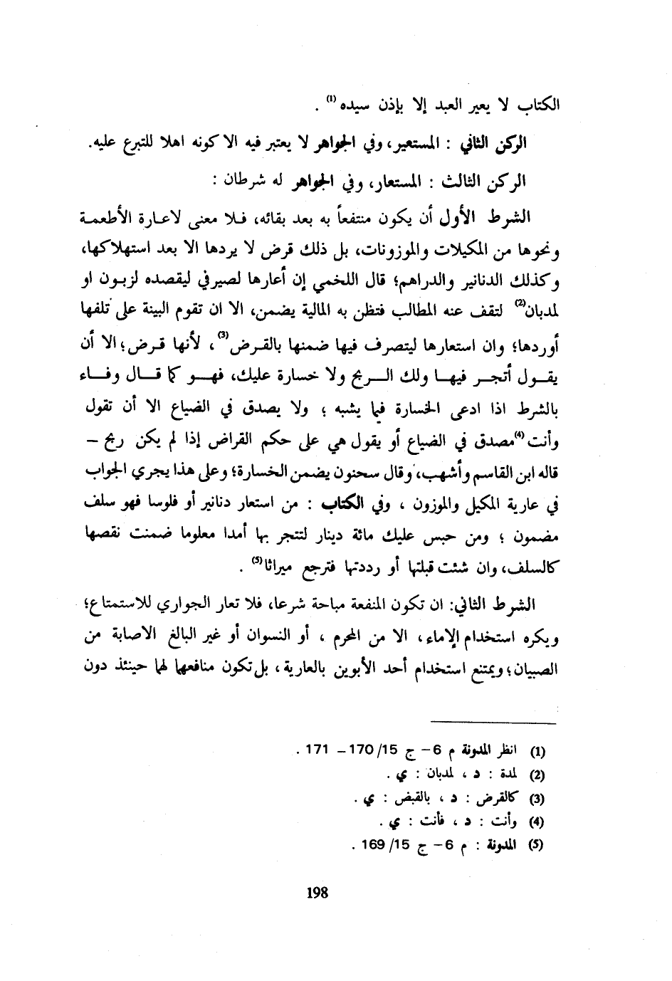 الْكِتَابِ لَا يُعِيرُ الْعَبْدُ إِلَّا بِإِذْنِ سَيِّدِهِ الرُّكْنُ الثَّانِي الْمُسْتَعِيرُ وَفِي الْجَوَاهِرِ لَا يُعْتَبَرُ فِيهِ إِلَّا كَوْنُهُ أَهْلًا لِلتَّبَرُّعِ عَلَيْهِ الرُّكْنُ الثَّالِثُ الْمُسْتَعَارُ وَفِي الْجَوَاهِرِ لَهُ شَرْطَانِ الشَّرْطُ الْأَوَّلُ أَنْ يَكُونَ مُنْتَفَعًا بِهِ بَعْدَ بَقَائِهِ فَلَا مَعْنَى لِإِعَارَةِ الْأَطْعِمَةِ وَنَحْوِهَا مِنَ الْمَكِيلَاتِ وَالْمَوْزُونَاتِ بَلْ ذَلِكَ قَرْضٌ لَا يَرُدُّهَا إِلَّا بَعْدَ اسْتِهْلَاكِهَا وَكَذَلِكَ الدَّنَانِيرُ وَالدَّرَاهِمُ قَالَ اللَّخْمِيُّ إِن أعارها لصيرفي ليقصده لزبون أَو لمدبان لتقف عَنْهُ الْمَطَالِبُ فَتُظَنَّ بِهِ الْمَالِيَّةُ يَضْمَنُ إِلَّا أَنْ تَقُومَ الْبَيِّنَةُ عَلَى تَلَفِهَا أَوْ رَدِّهَا وان استعارها ليتصرف فِيهَا ضمنهَا بالقرض لِأَنَّهَا قرض الا أَن يَقُول أتجر فِيهَا وَلَكَ الرِّبْحُ وَلَا خَسَارَةَ عَلَيْكَ فَهُوَ كَمَا قَالَ وَفَاءً بِالشَّرْطِ إِذَا ادَّعَى الْخَسَارَةَ فِيمَا يُشْبِهُ وَلَا يُصَدَّقُ فِي الضَّيَاعِ إِلَّا أَنْ تَقُولَ وَأَنْتَ مُصَدَّقٌ فِي الضَّيَاعِ أَوْ يَقُولَ هِيَ عَلَى حُكْمِ الْقِرَاضِ إِذَا لَمْ يَكُنْ رِبْحٌ - قَالَهُ ابْنُ الْقَاسِمِ وَأَشْهَبُ وَقَالَ سَحْنُونٌ يَضْمَنُ الْخَسَارَةَ وَعَلَى هَذَا يَجْرِي الْجَوَابُ فِي عَارِيَةِ الْمَكِيلِ وَالْمَوْزُونِ وَفِي الْكِتَابِ مَنِ اسْتَعَارَ دَنَانِيرَ أَوْ فُلُوسًا فَهُوَ سَلَفٌ مَضْمُونٌ وَمَنْ حَبَسَ عَلَيْكَ مِائَةَ دِينَارٍ لِتَتَّجِرَ بِهَا أَمَدًا مَعْلُوما ضَمِنْتَ نَقْصَهَا كَالسَّلَفِ وَإِنْ شِئْتَ قَبِلْتَهَا أَوْ رَدَدْتَهَا فَتِرْجِعُ مِيرَاثًا الشَّرْطُ الثَّانِي أَنْ تَكُونَ الْمَنْفَعَةُ مُبَاحَةً شَرْعًا فَلَا تُعَارُ الْجَوَارِي لِلِاسْتِمْتَاعِ وَيُكْرَهُ اسْتِخْدَامُ الْإِمَاءِ إِلَّا مِنَ الْمَحْرَمِ أَوِ النِّسْوَانِ أَوْ غَيْرِ الْبَالِغِ الْإِصَابَةِ مِنَ الصِّبْيَانِ وَيَمْتَنِعُ اسْتِخْدَامُ أَحَدِ الْأَبَوَيْنِ بِالْعَارِيَةِ بَلْ تَكُونُ مَنَافِعُهُمَا لَهُمَا حِينَئِذٍ دُونَ