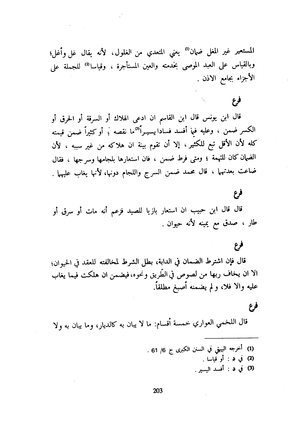 فَرْعٌ - قَالَ اللَّخْمِيُّ الْعَوَارِيُّ خَمْسَةُ أَقْسَامٍ مَا لَا يُبَانُ بِهِ كَالدِّيَارِ وَمَا يُبَانُ بِهِ وَلَا