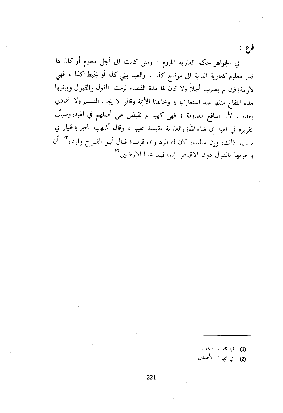 فَرْعٌ - فِي الْجَوَاهِرِ حُكْمُ الْعَارِيَّةِ اللُّزُومُ وَمَتَّى كَانَتْ إِلَى أَجَلٍ مَعْلُومٍ أَوْ كَانَ لَهَا قَدْرٌ مَعْلُومٌ كَعَارِيَّةِ الدَّابَّةِ إِلَى مَوْضِعِ كَذَا وَالْعَبْد يَبْنِي كَذَا أَوْ يَخِيطُ كَذَا فَهِيَ لَازِمَةٌ فَإِنْ لَمْ يَضْرِبْ أَجَلًا وَلَا كَانَ لَهَا مُدَّة الْقَضَاء لَزِمَتْ بِالْقَوْلِ وَالْقَبُولِ وَيُبْقِيهَا مُدَّةَ انْتِفَاعٍ مَثَلَهَا عِنْد استعارتها وَخَالَفنَا الأيمة وَقَالُوا لَا يَجِبُ التَّسْلِيمُ وَلَا التَّمَادِي بَعْدَهُ لِأَنَّ الْمَنَافِعَ مَعْدُومَةٌ فَهِيَ كَهِبَةٍ لَمْ تُقْبَضْ عَلَى أَصْلِهِمْ فِي الْهِبَةِ وَسَيَأْتِي تَقْرِيرُهُ فِي الْهِبَةِ إِنْ شَاءَ اللَّهُ وَالْعَارِيَّةُ مَقِيسَةٌ عَلَيْهَا وَقَالَ أَشْهَبُ الْمُعِيرُ بِالْخِيَارِ فِي تَسْلِيمِ ذَلِكَ وَإِنْ سَلَّمَهُ كَانَ لَهُ الرَّدُّ وَإِنْ قَرُبَ قَالَ أَبُو الْفَرَجِ وَأَرَى أَنَّ وَجُوبَهَا بِالْقَوْلِ دون الاقباض إِنَّمَا فِيمَا عدا الْأَرْضين