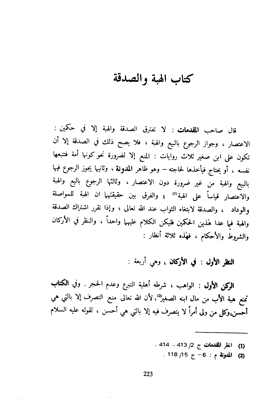 قَالَ صَاحب الْمُقدمَات لَا تفترق الصَّدَقَة وَالْهِبَة إِلَّا فِي حُكْمَيْنِ الِاعْتِصَارِ وَجَوَازِ الرُّجُوعِ بِالْبَيْعِ وَالْهِبَةِ فَلَا يَصِحُّ ذَلِكَ فِي الصَّدَقَةِ إِلَّا أَنْ تَكُونَ عَلَى ابْنٍ صَغِيرٍ ثَلَاثُ رِوَايَاتٍ الْمَنْعُ إِلَّا لِضَرُورَةٍ نَحْوِ كَوْنِهَا أَمَةً فَتَتْبَعُهَا نَفْسُهُ أَوْ يَحْتَاجُ فَيَأْخُذُهَا لِحَاجَتِهِ - وَهُوَ ظَاهِرُ الْمُدَوَّنَةِ وَثَانِيهَا يَجُوزُ الرُّجُوعُ فِيهَا بِالْبَيْعِ وَالْهِبَةِ مِنْ غَيْرِ ضَرُورَةٍ دُونَ الِاعْتِصَارِ وَثَالِثُهَا الرُّجُوعُ بِالْبَيْعِ وَالْهِبَةِ وَالِاعْتِصَارِ قِيَاسًا عَلَى الْهِبَةِ وَالْفَرْقُ بَيْنَ حَقِيقَتِهِمَا أَنَّ الْهِبَةَ لِلْمُوَاصَلَةِ وَالْوِدَادِ وَالصَّدَقَةَ لابتغاء االثواب عِنْدَ اللَّهِ تَعَالَى وَإِذَا تَقَرَّرَ اشْتِرَاكُ الصَّدَقَةِ وَالْهِبَةِ فِيمَا عَدَا هَذَيْنِ الْحُكْمَيْنِ فَلْيَكُنِ الْكَلَامُ عَلَيْهِمَا وَاحِدًا وَالنَّظَرُ فِي الْأَرْكَانِ وَالشُّرُوطِ وَالْأَحْكَامِ فَهَذِهِ ثَلَاثَة أنظار النَّظَرُ الْأَوَّلُ فِي الْأَرْكَانِ وَهِيَ أَرْبَعَةٌ الرُّكْنُ الْأَوَّلُ الْوَاهِب شَرطه أَهْلِيَّةُ التَّبَرُّعِ وَعَدَمُ الْحَجْرِ وَفِي الْكِتَابِ تُمْنَعُ هِبَةُ الْأَبِ مِنْ مَالِ ابْنِهِ الصَّغِيرِ لِأَنَّ اللَّهَ تَعَالَى مَنَعَ التَّصَرُّفَ إِلَّا بِالَّتِي هِيَ أَحْسَنُ وَكُلُّ مَنْ وَلِيَ أَمْرًا لَا يَتَصَرَّفُ فِيهِ إِلَّا بِالَّتِي هِيَ أحسن لقَوْله - صَلَّى اللَّهُ عَلَيْهِ وَسَلَّم َ -