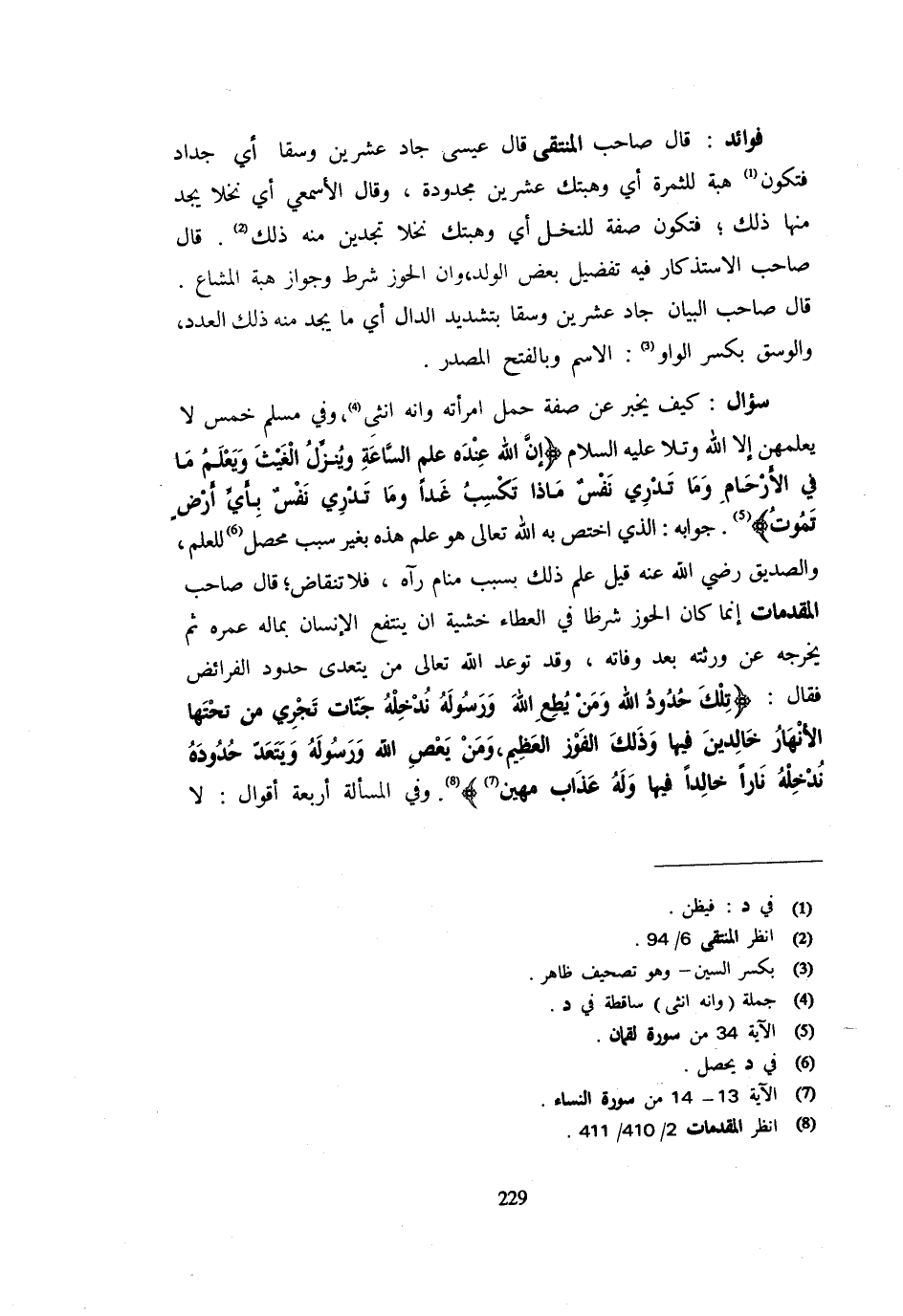 فَوَائِدُ - قَالَ صَاحِبُ الْمُنْتَقَى قَالَ عِيسَى جَادَّ عشْرين وسْقا أَي جدَاد فَتكون هبة للثمرة أَي وَهبتك عشْرين مجدودة وَقَالَ الأسمعي أَيْ نَخَلًا يَجِدُّ مِنْهَا ذَلِكَ فَتَكُونُ صِفَةً للنخل أَي وَهبتك نخلا تجدين مِنْهُ ذَلِكَ قَالَ صَاحِبُ الِاسْتِذْكَارِ فِيهِ تَفْضِيلُ بَعْضِ الْوَلَدِ وَأَنَّ الْحَوْزَ شَرْطٌ وَجَوَازُ هِبَةِ الْمَشَاعِ قَالَ صَاحب الْبَيَان جَادَّ عِشْرِينَ وَسْقًا بِتَشْدِيدِ الدَّالِّ أَيْ مَا يَجِدُ مِنْهُ ذَلِكَ الْعَدَدَ وَالْوَسْقُ بِكَسْرِ الْوَاوِ الِاسْمُ وَبِالْفَتْحِ الْمَصْدَرُ سُؤَالٌ كَيْفَ يُخْبِرُ عَنْ صِفَةِ حَمْلِ امْرَأَتِهِ وَأَنَّهُ أُنْثَى وَفِي مُسْلِمٍ خمس لَا يعلمهُنَّ إِلَّا الله وتلا - صَلَّى اللَّهُ عَلَيْهِ وَسَلَّم َ - {إِنَّ اللَّهَ عِنْدَهُ عِلْمُ السَّاعَةِ وَيُنَزِّلُ الْغَيْثَ وَيَعْلَمُ مَا فِي الأَرْحَامِ وَمَا تَدْرِي نَفْسٌ مَاذَا تَكْسِبُ غَدًا وَمَا تَدْرِي نَفْسٌ بِأَيِّ أَرض تَمُوت} جَوَابُهُ الَّذِي اخْتَصَّ بِهِ اللَّهُ تَعَالَى هُوَ عِلْمُ هَذِهِ بِغَيْرِ سَبَبِ مُحَصِّلٍ لِلْعِلْمِ وَالصِّدِيقُ رَضِيَ اللَّهُ عَنْهُ قِيلَ عَلِمَ ذَلِكَ بِسَبَبِ مَنَامٍ رَآهُ فَلَا تَنَاقُضَ قَالَ صَاحِبُ الْمُقَدِّمَاتِ إِنَّمَا كَانَ الْحَوْزُ شَرْطًا فِي الْعَطَاءِ خَشْيَةَ أَنْ يَنْتَفِعَ الْإِنْسَانُ بِمَالِهِ عُمْرَهُ ثُمَّ يُخْرِجَهُ عَنْ وَرَثَتِهِ بَعْدَ وَفَاتِهِ وَقَدْ تَوَعَّدَ اللَّهُ تَعَالَى مَنْ يَتَعَدَّى حُدُودَ الْفَرَائِضِ فَقَالَ {تِلْكَ حُدُود الله وَمن يطع الله وَرَسُوله ندخله جَنَّاتٍ تَجْرِي مِنْ تَحْتِهَا الأَنْهَارُ خَالِدِينَ فِيهَا وَذَلِكَ الْفَوْز الْعَظِيم وَمن يعْص الله وَرَسُوله ويتعد حُدُوده ندخله نَارا خَالِدا فِيهَا وَله عَذَاب مهين} وَفِي الْمَسْأَلَة أَرْبَعَة أَقْوَال لَا