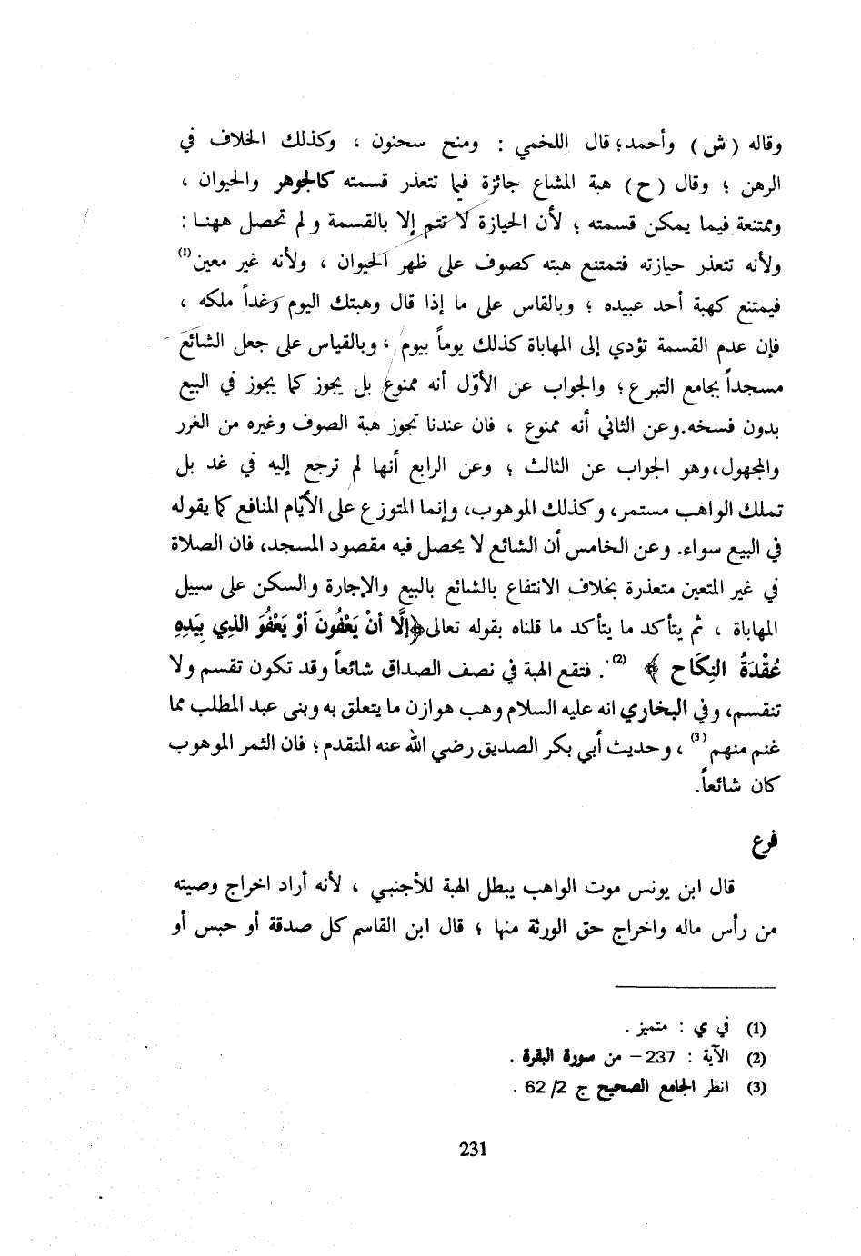 وَقَالَهُ (ش) وَأحمد قَالَ اللَّخْمِيّ ومنح سَحْنُونٌ وَكَذَلِكَ الْخِلَافُ فِي الرَّهْنِ وَقَالَ (ح) هِبَةُ الْمَشَاعِ جَائِزَةٌ فِيمَا تَتَعَذَّرُ قِسْمَتُهُ كَالْجَوْهَرِ وَالْحَيَوَانِ وَمُمْتَنِعَةٌ فِيمَا يُمْكِنُ قِسْمَتُهُ لِأَنَّ الْحِيَازَةَ لَا تتمّ إِلَّا بِالْقِسْمَةِ وَلم تحصل هَهُنَا وَلِأَنَّهُ تَتَعَذَّرُ حِيَازَتُهُ فَتَمْتَنِعُ هِبَتُهُ كَصُوفٍ عَلَى ظهر الْحَيَوَان وَلِأَنَّهُ غير معِين فَيمْتَنع كَهِبَة أحد عبيده وبالقاس عَلَى مَا إِذَا قَالَ وَهَبْتُكَ الْيَوْمَ وَغَدًا ملكه فَإِن عدم الْقِسْمَة تُؤدِّي إِلَى المهاباة كَذَلِكَ يَوْمًا بِيَوْمٍ وَبِالْقِيَاسِ عَلَى جَعْلِ الشَّائِعِ مَسْجِدًا بِجَامِعِ التَّبَرُّعِ وَالْجَوَابِ عَنِ الْأَوَّلِ أَنَّهُ مَمْنُوعٌ بَلْ يَجُوزُ كَمَا يَجُوزُ فِي الْبَيْعِ بِدُونِ فَسْخِهِ وَعَنِ الثَّانِي أَنَّهُ مَمْنُوعٌ فَإِنَّ عِنْدَنَا تَجُوزُ هِبَةُ الصُّوفِ وَغَيْرِهِ مِنَ الْغَرَرِ وَالْمَجْهُولِ وَهُوَ الْجَوَابُ عَنِ الثَّالِثِ وَعَنِ الرَّابِعِ أَنَّهَا لَمْ تَرْجِعْ إِلَيْهِ فِي غَدٍ بَلْ تملك الْوَاهِبِ مُسْتَمِرٌّ وَكَذَلِكَ الْمَوْهُوبِ وَإِنَّمَا الْمُتَوَزِّعُ عَلَى الْأَيَّام الْمَنَافِع كَمَا يَقُوله فِي الْبَيْعِ سَوَاءً وَعَنِ الْخَامِسِ أَنَّ الشَّائِعَ لَا يَحْصُلُ فِيهِ مَقْصُودُ الْمَسْجِدِ فَإِنَّ الصَّلَاةَ فِي غَيْرِ الْمُتَعَيَّنِ مُتَعَذِّرَةٌ بِخِلَافِ الِانْتِفَاعِ بِالشَّائِعِ بِالْبيعِ وَالْإِجَارَة والسكن على سَبِيل المهاباة ثمَّ يتَأَكَّد مَا يتَأَكَّد قُلْنَاهُ بِقَوْلِهِ تَعَالَى {إِلا أَنْ يَعْفُونَ أَوْ يعْفُو الَّذِي بِيَدِهِ عقدَة النِّكَاح} فَتَقَعُ الْهِبَةُ فِي نِصْفِ الصَّدَاقِ شَائِعًا وَقَدْ تَكُونُ تُقَسَّمُ وَلَا تَنْقَسِمُ وَفِي الْبُخَارِيِّ أَنَّهُ - صَلَّى اللَّهُ عَلَيْهِ وَسَلَّم َ - وَهَبَ هَوَازِنَ مَا يَتَعَلَّقُ بِهِ وَبَنِي عَبْدِ الْمُطَّلِبِ مِمَّا غَنِمَ مِنْهُمْ وَحَدِيثُ أَبِي بَكْرٍ الصِّدِّيقِ رَضِيَ اللَّهُ عَنْهُ الْمُتَقَدِّمُ فَإِنَّ الثَّمَرَ الْمَوْهُوبَ كَانَ شَائِعًا
