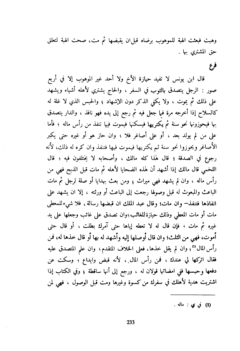 فَرْعٌ - قَالَ ابْنُ يُونُسَ لَا تُفِيدُ حِيَازَةُ الْأَخِ وَلَا أَحَدٍ غَيْرِ الْمَوْهُوبِ إِلَّا فِي أَرْبَعِ صُوَرٍ الرَّجُلُ يَتَصَدَّقُ بِالثَّوْبِ فِي السَّفَرِ وَالْحَاجُّ يَشْتَرِي لِأَهْلِهِ أَشْيَاءَ وَيُشْهِدُ عَلَى ذَلِكَ ثُمَّ يَمُوتُ وَلَا يَكْفِي الذِّكْرُ دُونَ الْإِشْهَادِ وَالْحَبْسُ الَّذِي لَا غَلَّةَ لَهُ كَالسِّلَاحِ إِذَا أَخْرَجَهُ مَرَّةً فِيمَا جُعِلَ فِيهِ ثُمَّ رَجَعَ إِلَى يَدِهِ فَهُوَ نَافِذٌ وَالدَّارُ يَتَصَدَّقُ بِهَا فَيَحُوزُونَهَا نَحْوَ سَنَةٍ ثُمَّ يَكْتَرِيهَا فَيَسْكُنُهَا فَيَمُوتُ فِيهَا تَنْفُذُ مِنْ رَأْسِ مَالِهِ فَأَمَّا عَلَى مَنْ لَمْ يُولَدْ بَعْدُ أَوْ عَلَى أَصَاغِرَ فَلَا وَإِنْ حَازَ هُوَ أَوْ غَيْرُهُ حَتَّى يَكْبُرَ الْأَصَاغِرُ وَيَحُوزُوا نَحْوَ سَنَةٍ ثُمَّ يَكْتَرِيهَا فَيَمُوتُ فِيهَا فَتَنْفُذُ وَإِنْ كُرِهَ لَهُ ذَلِكَ لِأَنَّهُ رُجُوعٌ فِي الصَّدَقَةِ قَالَ هَذَا كُلَّهُ مَالِكٌ وَأَصْحَابُهُ لَا يَخْتَلِفُونَ فِيهِ قَالَ اللَّخْمِيُّ قَالَ مَالِكٌ إِذَا أَشْهَدَ أَنَّ هَذِهِ الضَّحَايَا لِأَهْلِهِ ثُمَّ مَاتَ قَبْلَ الذَّبْحِ فَهِيَ مِنْ رَأْسِ مَالِهِ وَإِنْ لَمْ يُشْهِدْ فَهِيَ مِيرَاثٌ وَمَنْ بَعَثَ بِهَدَايَا أَوْ صِلَةٍ لِرَجُلٍ ثُمَّ مَاتَ الْبَاعِثُ وَالْمَبْعُوثُ لَهُ قَبْلَ وُصُولِهَا رَجَعَتْ إِلَى الْبَاعِثِ أَوْ وَرَثَتِهِ إِلَّا أَن يشْهد على انفاذها فتنفذ - وان مَاتَ وَقَالَ عَبْدُ الْمَلِكِ إِنْ قَبَضَهَا رِسَالَةً فَلَا شَيْءَ لِلْمُعْطَى مَاتَ أَوْ مَاتَ الْمُعْطِي وَذَلِكَ حِيَازَةٌ لِلْغَائِبِ وَإِنْ تَصَدَّقَ عَلَى غَائِبٍ وَجَعَلَهَا عَلَى يَدِ غَيْرِهِ ثُمَّ مَاتَ فَإِنْ قَالَ لَهُ لَا تعطه إِيَّاهَا حَتَّى آمُرَكَ بَطَلَتْ أَوْ قَالَ حَتَّى أَمُوتَ فَهِيَ مِنَ الثُّلُثِ وَإِنْ قَالَ أُوْصِلْهَا إِلَيْهِ وَأَشْهَدُ لَهُ بِهَا أَوْ قَالَ خُذْهَا لَهُ فَمِنْ رَأْسِ الْمَالِ وَإِنْ لَمْ يَقُلْ خُذْهَا فَعَلَى الْخِلَافِ الْمُتَقَدَّمِ وَإِنْ عَلِمَ الْمُتَصَدَّقُ عَلَيْهِ فَقَالَ اتْرُكْهَا لِي عِنْدَكَ فَمِنْ رَأْسِ المَال لِأَنَّهُ قبض وايداع وَسكت عَنْ دَفْعِهَا وَحَبْسِهَا فَفِي إِمْضَائِهَا قَوْلَانِ لَهُ وَرَجَعَ إِلَى أَنَّهَا سَاقِطَةٌ وَفِي الْكِتَابِ إِذَا اشْتَرَيْتَ هَدِيَّةً لِأَهْلِكَ فِي سَفَرِكَ مِنْ كِسْوَةٍ وَغَيْرِهَا وَمُتَّ قَبْلَ الْوُصُولِ فَهِيَ لِمَنِ