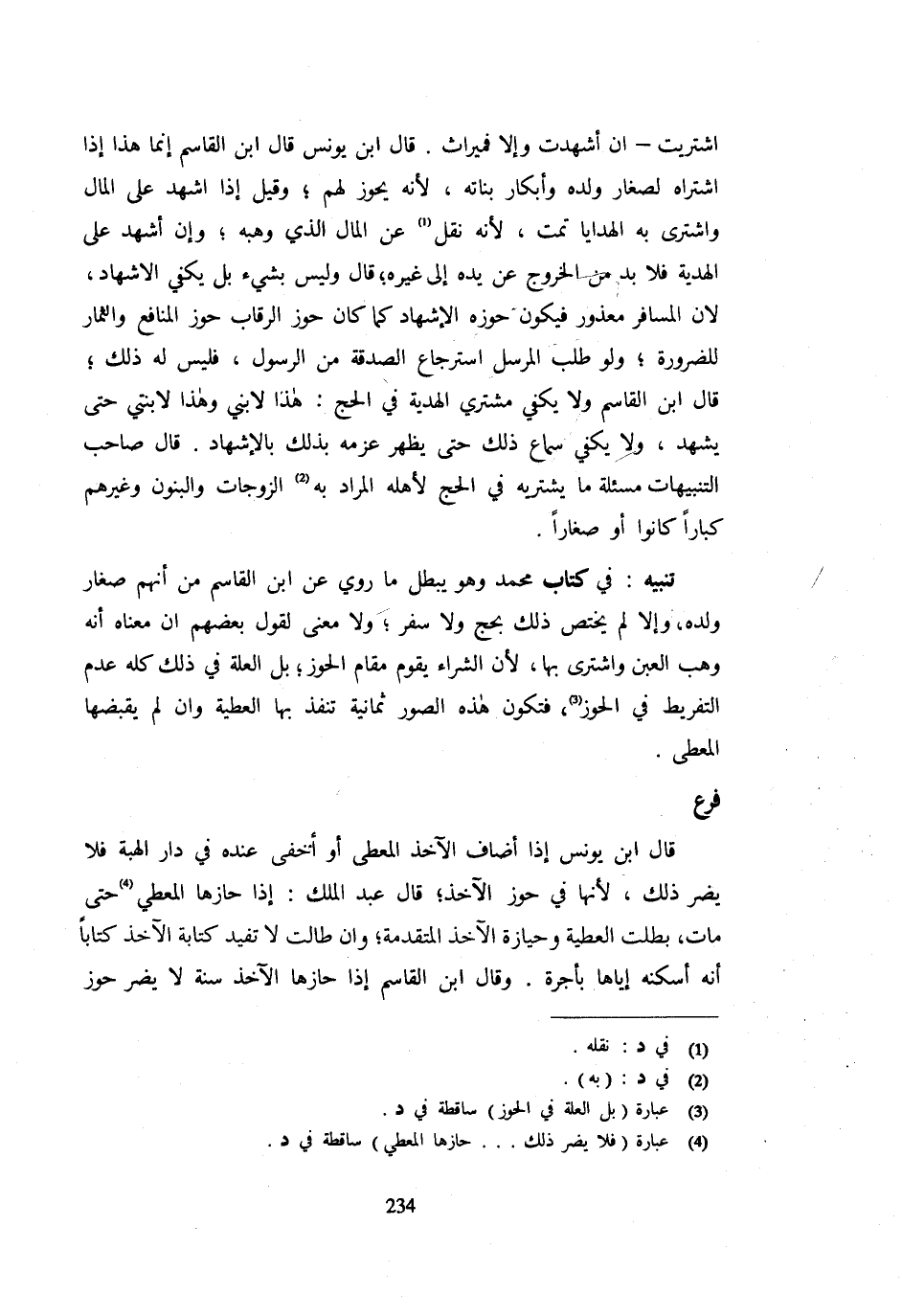 اشْتَرَيْتَ - إِنْ أَشْهَدْتَ وَإِلَّا فَمِيرَاثٌ قَالَ ابْنُ يُونُسَ قَالَ ابْنُ الْقَاسِمِ إِنَّمَا هَذَا إِذَا اشْتَرَاهُ لِصِغَارِ وَلَدِهِ وَأَبْكَارِ بَنَاتِهِ لِأَنَّهُ يَحُوزُ لَهُم وَقيل إِذا أَشْهَدَ عَلَى الْمَالِ وَاشْتَرَى بِهِ الْهَدَايَا تَمَّتْ لِأَنَّهُ نقل عَنِ الْمَالِ الَّذِي وَهَبَهُ وَإِنْ أَشْهَدَ عَلَى الْهَدِيَّةِ فَلَا بُدَّ مِنَ الْخُرُوجِ عَنْ يَدِهِ إِلَى غَيْرِهِ قَالَ وَلَيْسَ بِشَيْءٍ بَلْ يَكْفِي الْإِشْهَادُ لِأَنَّ الْمُسَافِرَ مَعْذُورٌ فَيَكُونُ حَوْزَهُ الْإِشْهَادُ كَمَا كَانَ حَوْزُ الرِّقَابِ حَوْزَ الْمَنَافِعِ وَالثِّمَارِ لِلضَّرُورَةِ وَلَوْ طَلَبَ الْمُرْسَلُ اسْتِرْجَاعَ الصَّدَقَةِ مِنَ الرَّسُولِ فَلَيْسَ لَهُ ذَلِكَ قَالَ ابْنُ الْقَاسِمِ وَلَا يَكْفِي مُشْتَرِيَ الْهَدِيَّةِ فِي الْحَجِّ هَذَا لِابْنِي وَهَذَا لِابْنَتِي حَتَّى يُشْهِدَ وَلَا يَكْفِيَ سَماع ذَلِك حَتَّى يَظْهَرَ عَزْمُهُ بِذَلِكَ بِالْإِشْهَادِ قَالَ صَاحِبُ التَّنْبِيهَات مسئلة مَا يَشْتَرِيهِ فِي الْحَجِّ لِأَهْلِهِ الْمُرَادُ بِهِ الزَّوْجَاتُ وَالْبَنُونَ وَغَيْرُهُمْ كِبَارًا كَانُوا أَوْ صِغَارًا