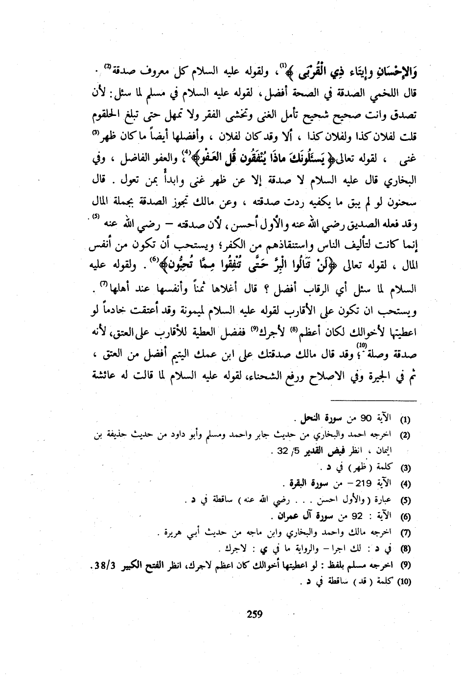 والإحْسَانِ وإِيتَاء دِي القُرْبَى} وَلقَوْله - صَلَّى اللَّهُ عَلَيْهِ وَسَلَّم َ - كُلُّ مَعْرُوفٍ صَدَقَةٌ قَالَ اللَّخْمِيُّ الصَّدَقَةُ فِي الصِّحَّة أفضل لقَوْله - صَلَّى اللَّهُ عَلَيْهِ وَسَلَّم َ - فِي مُسلم لما سُئِلَ لِأَن تصدق وَأَنْتَ صَحِيحٌ شَحِيحٌ تَأْمَلُ الْغِنَى وَتَخْشَى الْفَقْرَ وَلَا تُمْهِلُ حَتَّى تَبْلُغَ الْحُلْقُومَ قَلْتَ لِفُلَانٍ كَذَا وَلِفُلَانٍ كَذَا أَلَا وَقَدْ كَانَ لِفُلَانٍ وأفضلها أَيْضا مَا كَانَ ظهر غنى لقَوْله تَعَالَى {يَسئَلُونَك ماذَا يُنْفِقُون قُل العَفْو} وَالْعَفو الْفَاضِل وَفِي الْبُخَارِيِّ قَالَ - صَلَّى اللَّهُ عَلَيْهِ وَسَلَّم َ - لَا صَدَقَةَ إِلَّا عَنْ ظَهْرِ غِنًى وَابْدَأْ بِمَنْ تَعُولُ قَالَ سَحْنُونٌ لَوْ لَمْ يُبْقِ مَا يَكْفِيهِ رُدَّتِ الصَّدَقَةُ وَعَنْ مَالِكٍ تَجُوزُ الصَّدَقَةُ بِجُمْلَةِ الْمَالِ وَقَدْ فَعَلَ الصِّدِّيقُ رَضِيَ اللَّهُ عَنْهُ وَالْأَوَّلُ أَحْسَنُ لِأَنَّ صَدَقَتَهُ - رَضِيَ الله عَنهُ - إِنَّمَا كَانَت لتأليف النَّاس واستنفاذهم مِنَ الْكُفْرِ وَيُسْتَحَبُّ أَنْ تَكُونَ مِنْ أَنْفَسِ الْمَالِ لِقَوْلِهِ تَعَالَى {لنْ تَنَالوا الْبِرَّ حَتَّى تُنْفِقُوا مِمَّا تُحِبُّون} وَلقَوْله - صَلَّى اللَّهُ عَلَيْهِ وَسَلَّم َ - لماسئل أَيُّ الرِّقَابِ أَفْضَلُ قَالَ أَغْلَاهَا ثَمَنًا وَأَنْفَسُهَا عِنْدَ أَهْلِهَا وَيُسْتَحَبُّ أَنْ تَكُونَ عَلَى الْأَقَارِبِ لقَوْله - صَلَّى اللَّهُ عَلَيْهِ وَسَلَّم َ - لميمونة وَقد أَعْتَقَتْ خَادِمًا لَوْ أَعْطَيْتِهَا لِأَخْوَالِكِ لَكَانَ أَعْظَمَ لأجرك ففضل الْعَطِيَّة للأقارب على الْعتْق لِأَنَّهُ صَدَقَة وصلَة وَقد قَالَ مَالك صدقتك على ابْن عَمَّتك الْيَتِيمِ أَفْضَلُ مِنَ الْعِتْقِ ثُمَّ فِي الْجِيرَةِ وَفِي الاصلاح وَرفع الشحناء لقَوْله - صَلَّى اللَّهُ عَلَيْهِ وَسَلَّم َ - لَمَّا قَالَتْ لَهُ عَائِشَةُ