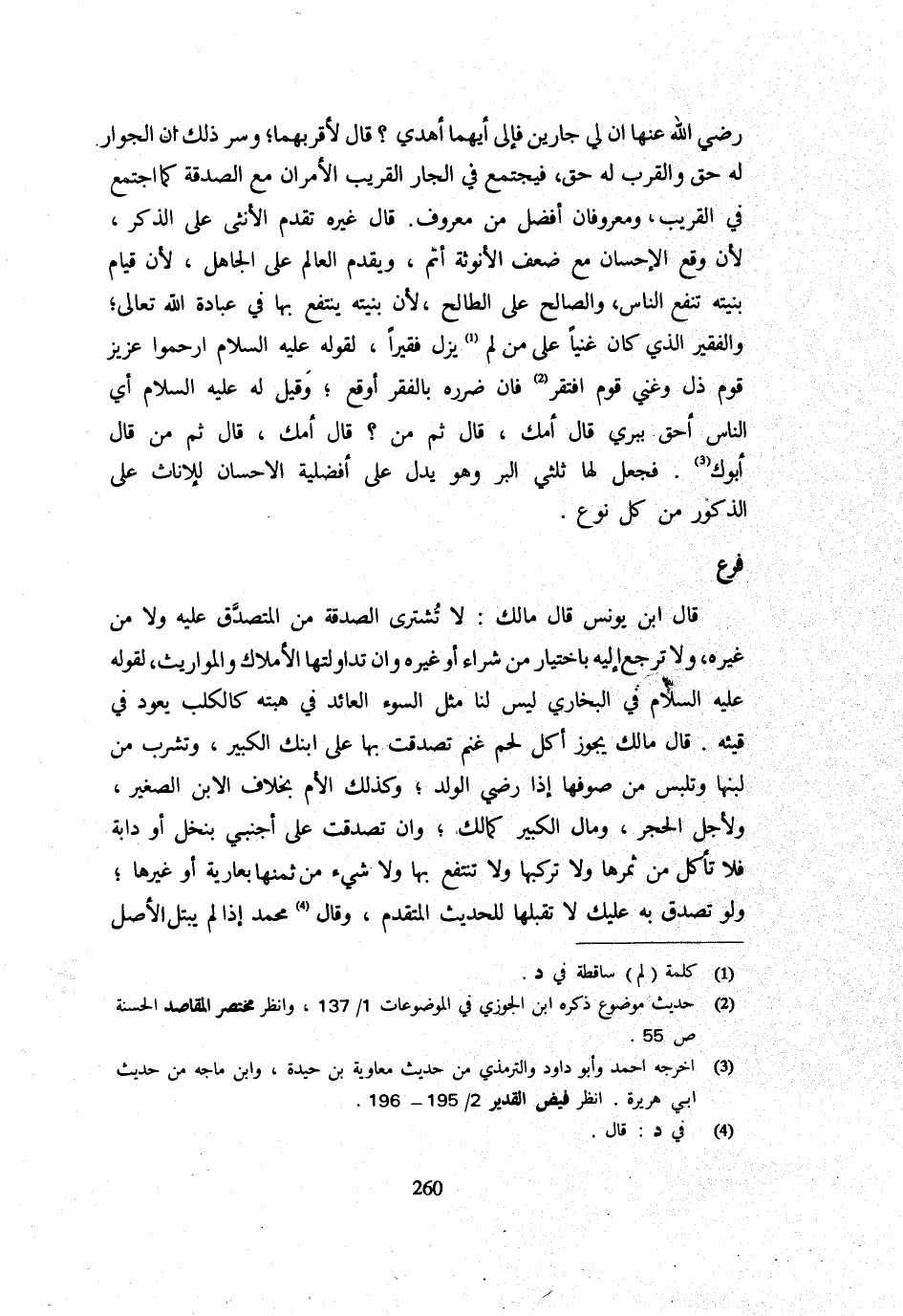 رَضِيَ اللَّهُ عَنْهَا إِنَّ لِي جَارَيْنِ فَإِلَى أَيِّهِمَا أُهْدِي قَالَ لِأَقْرَبِهِمَا وَسِرُّ ذَلِكَ أَنَّ الْجِوَارَ لَهُ حَقٌّ وَالْقُرْبَ لَهُ حَقٌّ فَيَجْتَمِعُ فِي الْجَارِ الْقَرِيبِ الْأَمْرَانِ مَعَ الصَّدَقَةِ كَمَا اجْتمع فِي الْقَرِيبِ وَمَعْرُوفَانِ أَفْضَلُ مِنْ مَعْرُوفٍ قَالَ غَيْرُهُ تُقَدَّمُ الْأُنْثَى عَلَى الذَّكَرِ لِأَنَّ وَقْعَ الْإِحْسَانِ مَعَ ضَعْفِ الْأُنُوثَةِ أَتَمُّ وَيُقَدَّمُ الْعَالِمُ عَلَى الْجَاهِلِ لِأَنَّ قِيَامَ بِنْيَتِهِ تَنْفَعُ النَّاسَ وَالصَّالِحُ عَلَى الطَّالِحِ لِأَنَّ بِنْيَتَهُ يَنْتَفِعُ بِهَا فِي عِبَادَةِ اللَّهِ تَعَالَى وَالْفَقِيرُ الَّذِي كَانَ غَنِيًّا عَلَى مَنْ لَمْ يَزَلْ فَقِيرًا لِقَوْلِهِ - صَلَّى اللَّهُ عَلَيْهِ وَسَلَّم َ - ارْحَمُوا عَزِيزَ قَوْمٍ ذَلَّ وَغَنِيَّ قَوْمٍ افْتَقَرَ فان ضَرَره بالفقر أوقع وَقيل لَهُ - صَلَّى اللَّهُ عَلَيْهِ وَسَلَّم َ - أَيُّ النَّاسِ أَحَقُّ بِبِرِّي قَالَ أُمُّكَ قَالَ ثُمَّ مَنْ قَالَ أُمُّكَ قَالَ ثُمَّ مَنْ قَالَ أَبُوكَ فَجَعَلَ لَهَا ثُلُثَيِ الْبِرِّ وَهُوَ يَدُلُّ عَلَى أَفْضَلِيَّةِ الْإِحْسَانِ لِلْإِنَاثِ عَلَى الذُّكُورِ مِنْ كُلِّ نَوْعٍ
