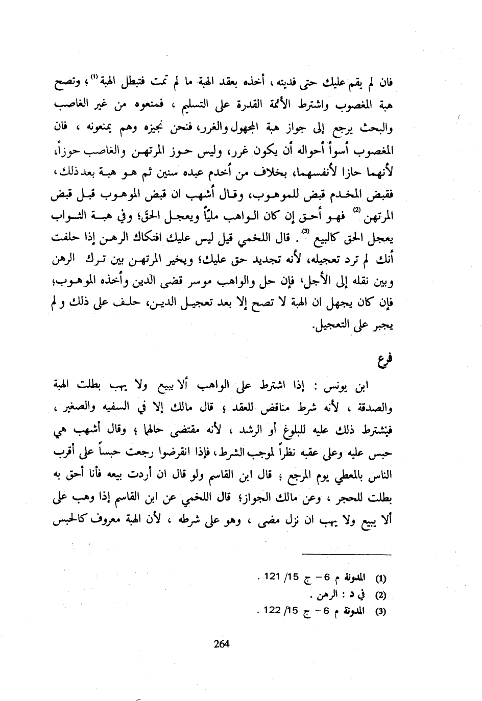 فَإِنْ لَمْ يَقُمْ عَلَيْكَ حَتَّى فَدَيْتَهُ أَخَذَهُ بِعَقْدِ الْهِبَةِ مَا لَمْ تَمُتْ فَتَبْطُلُ الْهِبَةُ وَتَصِحُّ هِبَةُ الْمَغْصُوبِ وَاشْتَرَطَ الْأَئِمَّةُ الْقُدْرَةَ عَلَى التَّسْلِيمِ فَمَنَعُوهُ مِنْ غَيْرِ الْغَاصِبِ وَالْبَحْثُ يَرْجِعُ إِلَى جَوَازِ هِبَةِ الْمَجْهُولِ وَالْغَرَرِ فَنَحْنُ نُجِيزُهُ وَهُمْ يَمْنَعُونَهُ فَإِنَّ الْمَغْصُوبَ أَسْوَأُ أَحْوَالِهِ أَنْ يَكُونَ غَرَّرَ وَلَيْسَ حَوْزُ الْمُرْتَهِنِ وَالْغَاصِبِ حَوْزًا لِأَنَّهُمَا حَازَا لِأَنْفُسِهِمَا بِخِلَافِ مَنْ أَخْدَمَ عَبْدَهُ سِنِينَ ثُمَّ هُوَ هِبَةٌ بَعْدَ ذَلِكَ فَقَبْضُ الْمُخْدَمِ قَبْضٌ لِلْمَوْهُوبِ وَقَالَ أَشْهَبُ إِنْ قَبَضَ الْمَوْهُوب قَبْلَ قَبْضِ الْمُرْتَهِنِ فَهُوَ أَحَقُّ إِنْ كَانَ الْوَاهِبُ مَلِيًّا وَيُعَجِّلُ الْحَقَّ وَفِي هِبَةِ الثَّوَابِ يُعَجِّلُ الْحَقَّ كَالْبَيْعِ قَالَ اللَّخْمِيُّ قِيلَ لَيْسَ عَلَيْكَ افْتِكَاكُ الرَّهْنِ إِذَا حَلَفْتَ أَنَّكَ لَمْ تُرِدْ تَعْجِيلَهُ لِأَنَّهُ تَجْدِيدُ حَقٍّ عَلَيْكَ وَيُخَيَّرُ الْمُرْتَهِنُ بَيْنَ تَرْكِ الرَّهْنِ وَبَيْنَ نَقْلِهِ إِلَى الْأَجَلِ فَإِنْ حَلَّ وَالْوَاهِبُ مُوسِرٌ قَضَى الدَّيْنَ وَأَخْذَهُ الْمَوْهُوبُ فَإِنْ كَانَ يَجْهَلُ أَنَّ الْهِبَةَ لَا تَصِحُّ إِلَّا بَعْدَ تَعْجِيلِ الدَّيْنِ حَلَفَ عَلَى ذَلِكَ وَلَمْ يُجْبَرْ عَلَى التَّعْجِيلِ