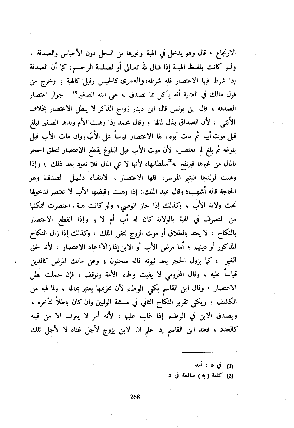 الِارْتِجَاعُ قَالَ وَهُوَ يَدْخُلُ فِي الْهِبَةِ وَغَيْرِهَا مِنَ النِّحَلِ دُونَ الْأَحْبَاسِ وَالصَّدَقَةِ وَلَوْ كَانَتْ بِلَفْظ الْهِبَةِ إِذَا قَالَ لِلَّهِ تَعَالَى أَوْ لِصِلَةِ الرَّحِمِ كَمَا أَنَّ الصَّدَقَةَ إِذَا شَرَطَ فِيهَا الِاعْتِصَارَ فَلَهُ شَرْطُهُ وَالْعُمْرَى كَالْحَبْسِ وَقِيلَ كَالْهِبَةِ وَخَرَجَ مِنْ قَوْلِ مَالِكٍ فِي الْعُتْبِيَّةِ أَنَّهُ يَأْكُلُ مِمَّا تَصَدَّقَ بِهِ عَلَى ابْنِهِ الصَّغِيرِ - جَوَازُ اعْتِصَارِ الصَّدَقَةِ قَالَ ابْنُ يُونُسَ قَالَ ابْنُ دِينَارٍ زَوَاجُ الذَّكَرِ لَا يُبْطِلُ الِاعْتِصَارَ بِخِلَافِ الْأُنْثَى لِأَنَّ الصَّدَاقَ بَذْلٌ لِمَالِهَا وَقَالَ مُحَمَّدٌ إِذَا وَهَبَتِ الْأُمُّ وَلَدَهَا الصَّغِيرَ فَبَلَغَ قبل موت أَبِيه ثمَّ مَاتَ أَبوهُ لَهَا الِاعْتِصَارُ قِيَاسًا عَلَى الْأَبِ وَإِنْ مَاتَ الْأَبُ قَبْلَ بُلُوغِهِ ثُمَّ بَلَغَ لَمْ تَعْتَصِرْ لِأَنَّ مَوْتَ الْأَبِ قَبْلَ الْبُلُوغِ يَقْطَعُ الِاعْتِصَارَ لِتَعَلُّقِ الْحَجْرِ بِالْمَالِ مِنْ غَيْرِهَا فَيَرْتَفِعُ بِهِ سُلْطَانُهَا لِأَنَّهَا لَا تَلِي الْمَالَ فَلَا تَعُودُ بَعْدَ ذَلِكَ وَإِذَا وَهَبَتْ لِوَلَدِهَا الْيَتِيمِ الْمُوسِرِ فَلَهَا الِاعْتِصَارُ لِانْتِفَاءِ دَلِيلِ الصَّدَقَةِ وَهُوَ الْحَاجَةُ قَالَهُ أَشْهَبُ وَقَالَ عَبْدُ الْمَلِكِ إِذَا وَهَبَتْ وَقَبَضَهَا الْأَبُ لَا تَعْتَصِرُ لِدُخُولِهَا تَحْتَ وِلَايَةِ الْأَبِ وَكَذَلِكَ إِذَا حَازَ الْوَصِيُّ وَلَوْ كَانَتْ هِبَةً اعْتَصَرَتْ لِتَمَكُّنِهَا مِنَ التَّصَرُّفِ فِي الْهِبَةِ بِالْوِلَايَةِ كَانَ لَهُ أَبٌ أَمْ لَا وَإِذَا انْقَطَعَ الاعتصار بِالنِّكَاحِ لَا يعْتد بِالطَّلَاق أَو موت الزَّوْج لتقرر ذَلِك وَكَذَلِكَ إِذا زَالَ النِّكَاح الْمَذْكُور أَوْ دَيْنُهُمْ أَمَّا مَرَضُ الْأَبِ أَوِ الِابْنِ إِذَا زَالَا عَادَ الِاعْتِصَارُ لِأَنَّهُ لِحَقِّ الْغَيْرِ كَمَا يَزُولُ الْحَجْرُ بَعْدَ ثُبُوتِهِ قَالَهُ سَحْنُونٌ وَعَنْ مَالِكٍ الْمَرَضُ كَالدَّيْنِ قِيَاسًا عَلَيْهِ وَقَالَ الْمَخْزُومِيُّ لَا يُفِيتُ وَطْءُ الْأَمَةِ وَتُوقَفُ فَإِنْ حَمَلَتْ بَطَلَ الِاعْتِصَارُ وَقَالَ ابْنُ الْقَاسِمِ يَكْفِي الْوَطْءُ لِأَنَّ تَحْرِيمَهَا يُعْتَبَرُ بِحَالِهَا وَلِمَا فِيهِ مِنَ الْكَشْفِ وَيَكْفِي تَقْرِيرُ النِّكَاحِ الثَّانِي فِي مسئلة الْوَلِيَّيْنِ وَإِنْ كَانَ بَاطِلًا لِتَأَخُّرِهِ وَيُصَدَّقُ الِابْنُ فِي الْوَطْءِ إِذَا غَابَ عَلَيْهَا لِأَنَّهُ أَمْرٌ لَا يُعْرَفُ إِلَّا مِنْ قِبَلِهِ كَالْعَدَدِ فَعِنْدَ ابْنِ الْقَاسِمِ إِذَا عَلِمَ أَنَّ الِابْنَ يُزَوَّجُ لأجل غناهُ لَا لأجل تِلْكَ