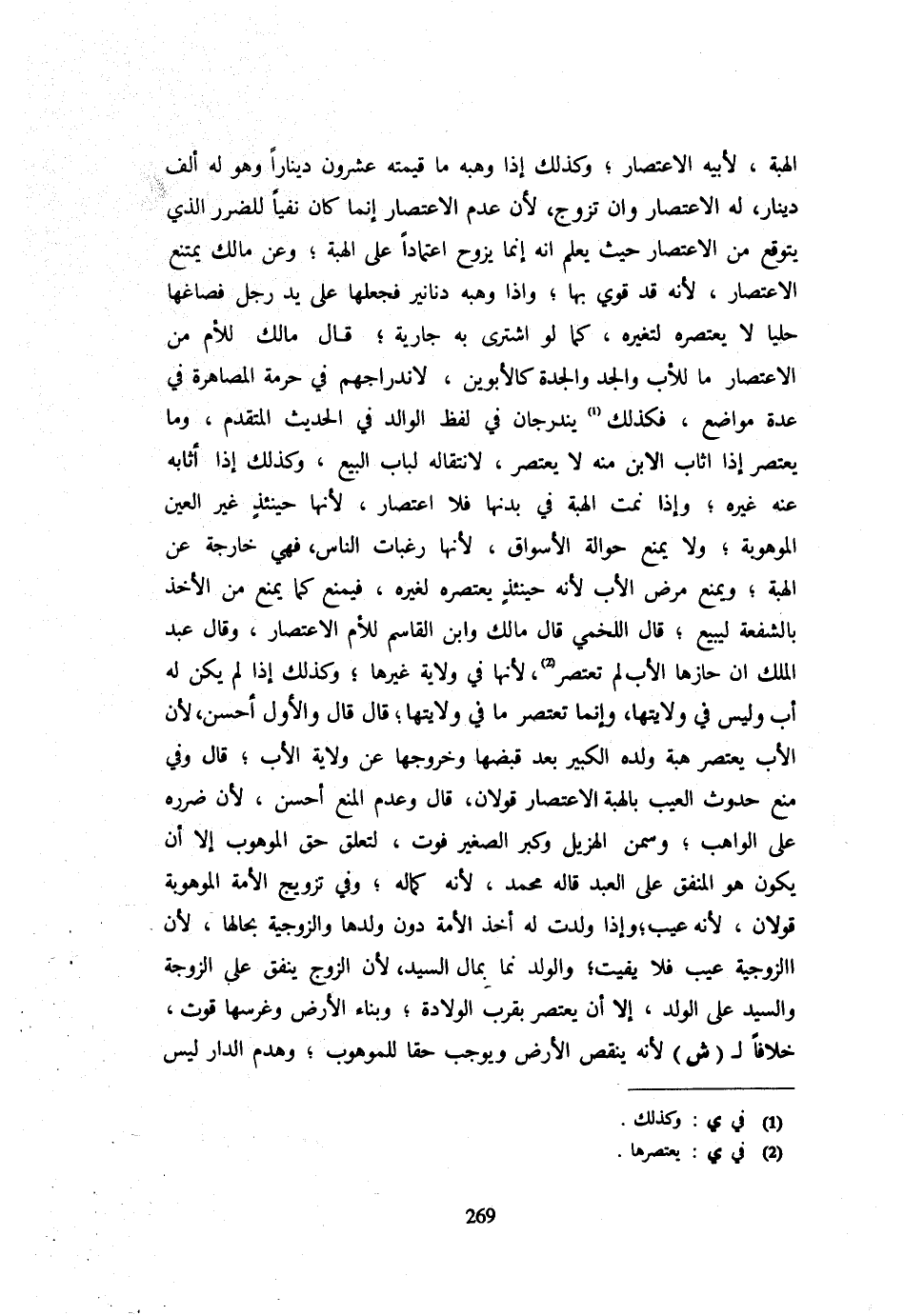الْهِبَة لِأَبِيهِ الِاعْتِصَارُ وَكَذَلِكَ إِذَا وَهَبَهُ مَا قِيمَتُهُ عِشْرُونَ دِينَارًا وَهُوَ لَهُ أَلْفُ دِينَارٍ لَهُ الِاعْتِصَارُ وَإِنْ تَزَوَّجَ لِأَنَّ عَدَمَ الِاعْتِصَارِ إِنَّمَا كَانَ نَفْيًا لِلضَّرَرِ الَّذِي يُتَوَقَّعُ مِنَ الِاعْتِصَارِ حَيْثُ يَعْلَمُ أَنَّهُ إِنَّمَا يُزَوَّجُ اعْتِمَادًا عَلَى الْهِبَةِ وَعَنْ مَالِكٍ يَمْتَنِعُ الِاعْتِصَارُ لِأَنَّهُ قَدْ قَوِيَ بِهَا وَإِذَا وَهَبَهُ دَنَانِيرَ فَجَعَلَهَا عَلَى يَدِ رَجُلٍ فَصَاغَهَا حُلِيًّا لَا يَعْتَصِرُهُ لِتَغَيُّرِهِ كَمَا لَوِ اشْتَرَى بِهِ جَارِيَةً قَالَ مَالِكٌ لِلْأُمِّ مِنَ الِاعْتِصَارِ مَا لِلْأَبِ وَالْجَدِّ وَالْجَدَّةِ كَالْأَبَوَيْنِ لِانْدِرَاجِهِمْ فِي حُرْمَةِ الْمُصَاهَرَةِ فِي عِدَّةِ مَوَاضِعَ فَكَذَلِكَ يَنْدَرِجَانِ فِي لَفْظِ الْوَالِدِ فِي الْحَدِيثِ الْمُتَقَدَّمِ وَمَا يَعْتَصِرُ إِذَا أَثَابَ الِابْنُ مِنْهُ لَا يَعْتَصِرُ لِانْتِقَالِهِ لِبَابِ الْبَيْعِ وَكَذَلِكَ إِذَا أَثَابَهُ عَنْهُ غَيْرُهُ وَإِذَا نَمَتِ الْهِبَةُ فِي بَدَنِهَا فَلَا اعْتِصَارَ لِأَنَّهَا حِينَئِذٍ غَيْرُ الْعَيْنِ الْمَوْهُوبَةِ وَلَا يَمْنَعُ حَوَالَةُ الْأَسْوَاقِ لِأَنَّهَا رَغَبَاتُ النَّاسِ فَهِيَ خَارِجَةٌ عَنِ الْهِبَةِ وَيَمْنَعُ مَرَضُ الْأَبِ لِأَنَّهُ حِينَئِذٍ يَعْتَصِرُهُ لِغَيْرِهِ فَيُمْنَعُ كَمَا يُمْنَعُ مِنَ الْأَخْذِ بِالشُّفْعَةِ لِيَبِيعَ قَالَ اللَّخْمِيُّ قَالَ مَالِكٌ وَابْنُ الْقَاسِمِ لِلْأُمِّ الِاعْتِصَارُ وَقَالَ عَبْدُ الْمَلِكِ إِنْ حَازَهَا الْأَبُ لَمْ تَعْتَصِرْ لِأَنَّهَا فِي وِلَايَةِ غَيْرِهَا وَكَذَلِكَ إِذَا لَمْ يَكُنْ لَهُ أَبٌ وَلَيْسَ فِي وِلَايَتِهَا وَإِنَّمَا تَعْتَصِرُ مَا فِي وِلَايَتِهَا قَالَ قَالَ وَالْأَوَّلُ أَحْسَنُ لِأَنَّ الْأَبَ يَعْتَصِرُ هِبَةَ وَلَدِهِ الْكَبِيرِ بَعْدَ قَبْضِهَا وَخُرُوجِهَا عَنْ وِلَايَةِ الْأَبِ قَالَ وَفِي مَنْعِ حُدُوثِ الْعَيْبِ بِالْهِبَةِ الِاعْتِصَارَ قَوْلَانِ قَالَ وَعَدَمُ الْمَنْعِ أَحْسَنُ لِأَنَّ ضَرَرَهُ عَلَى الْوَاهِبِ وَسِمَنُ الْهَزِيلِ وَكِبَرُ الصَّغِيرِ فَوْتٌ لِتَعَلُّقِ حَقِّ الْمَوْهُوبِ إِلَّا أَنْ يَكُونَ هُوَ الْمُنْفِقَ عَلَى الْعَبْدِ قَالَهُ مُحَمَّدٌ لِأَنَّهُ كَمَالُهُ وَفِي تَزْوِيجِ الْأَمَةِ الْمَوْهُوبَةِ قَوْلَانِ لِأَنَّهُ عَيْبٌ وَإِذَا ولدت لَهُ أَخَذَ الْأَمَةَ دُونَ وَلَدِهَا وَالزَّوْجِيَّةُ بِحَالِهَا لِأَنَّ الزَّوْجِيَّةَ عَيْبٌ فَلَا يُفِيتُ وَالْوَلَدُ نَمَا بِمَالِ السَّيِّدِ لِأَنَّ الزَّوْجَ يُنْفِقُ عَلَى الزَّوْجَةِ وَالسَّيِّدَ عَلَى الْوَلَدِ إِلَّا أَنْ يَعْتَصِرَ بِقُرْبِ الْوِلَادَةِ وَبِنَاء الأَرْض وغرسها قوت خِلَافًا لِ (ش) لِأَنَّهُ يَنْقُصُ الْأَرْضَ وَيُوجِبُ حَقًا للْمَوْهُوب وَهدم الدَّار لَيْسَ
