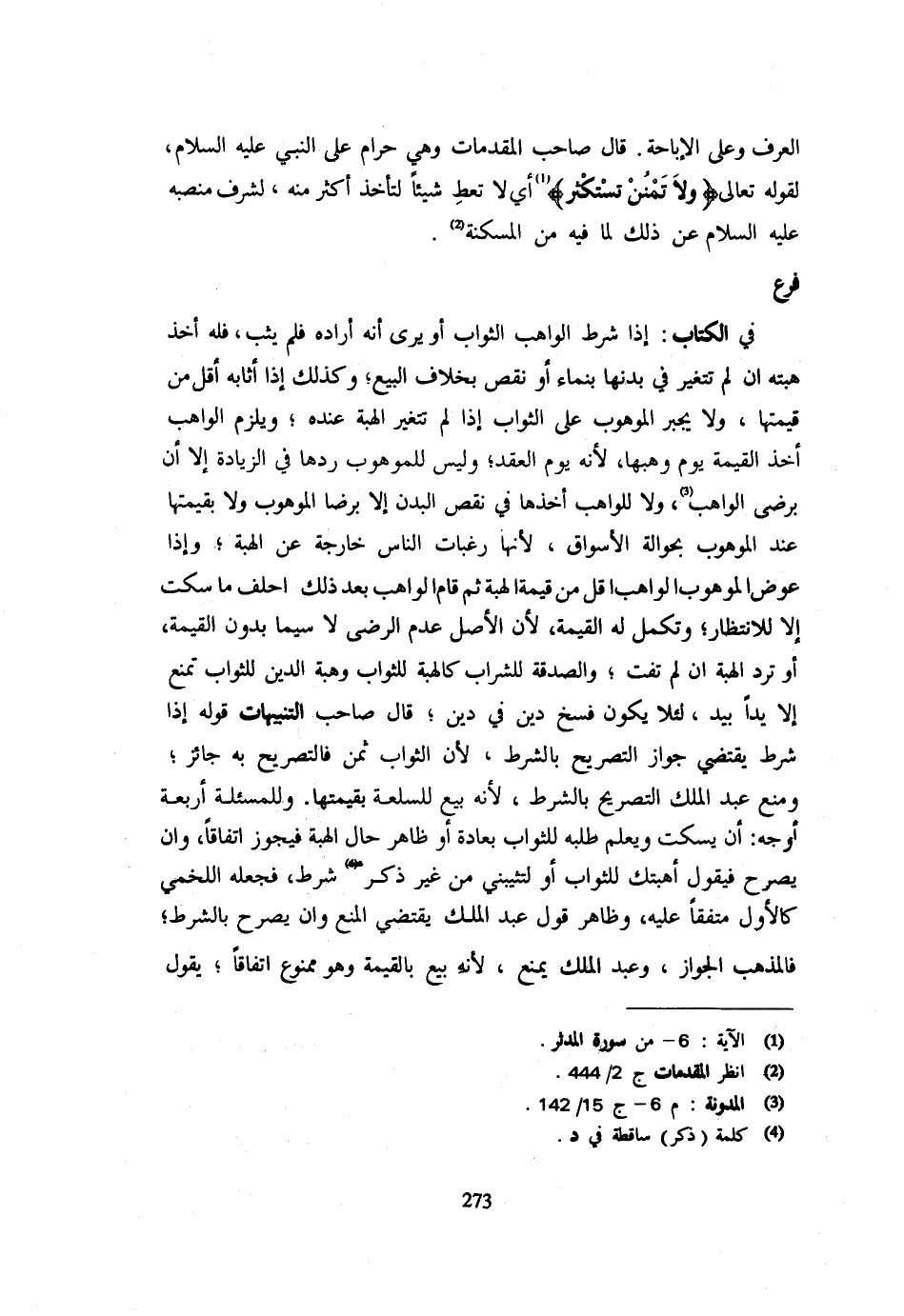 الْعُرْفِ وَعَلَى الْإِبَاحَةِ قَالَ صَاحِبُ الْمُقَدِّمَاتِ وَهِيَ حَرَامٌ عَلَى النَّبِيِّ - صَلَّى اللَّهُ عَلَيْهِ وَسَلَّم َ - لقَوْله تَعَالَى {وَلَا تمنن تستكثر} أَي لَا تعط شَيْئا لتأْخذ أَكثر مِنْهُ لشرف منصبه - صَلَّى اللَّهُ عَلَيْهِ وَسَلَّم َ - عَنْ ذَلِكَ لِمَا فِيهِ مِنَ الْمَسْكَنَةِ