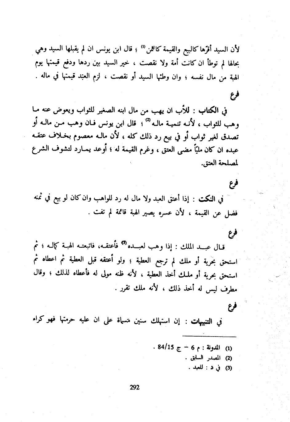 فَرْعٌ - فِي الْكِتَابِ لِلْأَبِ أَنْ يَهَبَ مِنْ مَالِ ابْنِهِ الصَّغِيرِ لِلثَّوَابِ وَيُعَوِّضُ عَنْهُ مَا وُهِبَ لِلثَّوَابِ لِأَنَّهُ تَنْمِيَةُ مَالِهِ قَالَ ابْنُ يُونُسَ فَإِنْ وَهَبَ مِنْ مَالِهِ أَوْ تَصَدَّقَ لِغَيْرِ ثَوَابٍ أَوْ فِي بَيْعٍ رُدَّ ذَلِكَ كُلُّهُ لِأَنَّ مَالَهُ مَعْصُومٌ بِخِلَافِ عِتْقِهِ عَبده ان كَانَ مَلِيًّا مضى الْعتْق وَغرم الْقيمَة لَهُ أوعد يمارد لِتَشَوُّفِ الشَّرْعِ لِمَصْلَحَةِ الْعِتْقِ