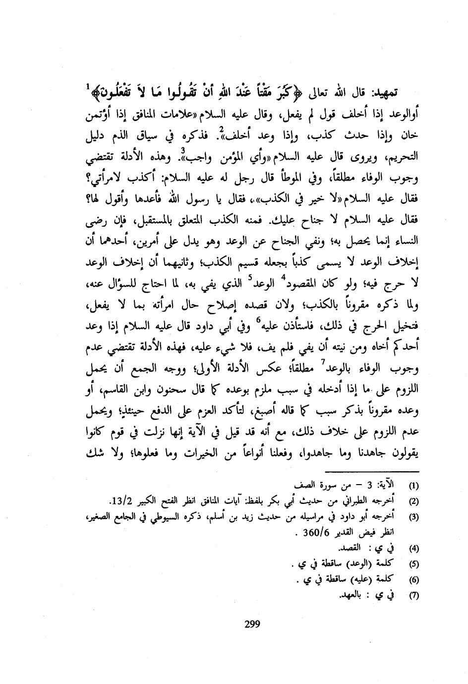 تَمْهِيدٌ - قَالَ اللَّهُ تَعَالَى {كَبُرَ مَقْتًا عِنْدَ الله أَن تَقولُوا مَا لَا تَفْعَلُونَ} أَو الْوَعْد إِذا أخلف قَول لم يفعل وَقَالَ - صَلَّى اللَّهُ عَلَيْهِ وَسَلَّم َ - " عَلَامَاتُ الْمُنَافِقِ إِذَا اؤْتُمِنُ خَانَ وَإِذَا حَدَّثَ كَذَبَ وَإِذَا وَعَدَ أَخْلَفَ " فَذِكْرُهُ فِي سِيَاقِ الذَّم دَلِيل التَّحْرِيم ويروى قَالَ - صَلَّى اللَّهُ عَلَيْهِ وَسَلَّم َ - " وَأَيُّ الْمُؤْمِنِ وَاجِبٌ " وَهَذِهِ الْأَدِلَّةُ تَقْتَضِي وُجُوبَ الْوَفَاءِ مُطْلَقًا وَفِي الْمُوَطَّأِ قَالَ رَجُلٌ لَهُ - صَلَّى اللَّهُ عَلَيْهِ وَسَلَّم َ - أكذب لامرأتي فَقَالَ - صَلَّى اللَّهُ عَلَيْهِ وَسَلَّم َ - " لَا خَيْرَ فِي الْكَذِبِ " فَقَالَ يَا رَسُولَ الله فأعدها وَأَقُول لَهَا فَقَالَ - صَلَّى اللَّهُ عَلَيْهِ وَسَلَّم َ - لَا جنَاح عَلَيْك فَمِنْهُ الْكَذِب الْمُتَعَلّق بالمستقبل فَإِن رَضِي النِّسَاءِ إِنَّمَا يَحْصُلُ بِهِ وَنَفَى الْجُنَاحَ عَنِ الْوَعْدِ وَهُوَ يَدُلُّ عَلَى أَمْرَيْنِ أَحَدُهُمَا أَنَّ إِخْلَافَ الْوَعْدِ لَا يُسَمَّى كَذِبًا بِجَعْلِهِ قَسِيمَ الْكَذِبِ وَثَانِيهُمَا أَنَّ إِخْلَافَ الْوَعْدِ لَا حَرَجَ فِيهِ وَلَوْ كَانَ الْمَقْصُودُ الْوَعْدَ الَّذِي يَفِي بِهِ لَمَا احْتَاجَ لِلسُّؤَالِ عَنْهُ وَلَمَا ذَكَرَهُ مَقْرُونًا بِالْكَذِبِ وَلِأَنَّ قَصْدَهُ إِصْلَاحُ حَالِ امْرَأَتِهِ بِمَا لَا يَفْعَلُ فَتَخَيَّلَ الْحَرَجَ فِي ذَلِكَ فَاسْتَأْذن عَلَيْهِ وَفِي أَبِي دَاوُدَ قَالَ - صَلَّى اللَّهُ عَلَيْهِ وَسَلَّم َ - إِذَا وَعَدَ أَحَدُكُمْ أَخَاهُ وَمِنْ نِيَّتِهِ أَنْ يَفِيَ فَلَمْ يَفِ فَلَا شَيْءَ عَلَيْهِ فَهَذِهِ الْأَدِلَّةُ تَقْتَضِي عَدَمَ وُجُوبِ الْوَفَاءِ بِالْوَعْدِ مُطْلَقًا عَكْسَ الْأَدِلَّةِ الْأُولَى وَوَجْهُ الْجَمْعِ أَنْ يُحْمَلَ اللُّزُومُ عَلَى مَا إِذَا أَدْخَلَهُ فِي سَبَبٍ مُلْزِمٍ بِوَعْدِهِ كَمَا قَالَ سَحْنُونٌ وَابْنُ الْقَاسِمِ أَوْ وَعْدُهُ مَقْرُونًا بِذِكْرِ سَبَبٍ كَمَا قَالَهُ أَصْبَغُ لِتَأَكُّدِ الْعَزْمِ عَلَى الدَّفْعِ حِينَئِذٍ وَيُحْمَلُ عَدَمُ اللُّزُومِ عَلَى خِلَافِ ذَلِكَ مَعَ أَنَّهُ قد قِيلَ فِي الْآيَةِ أَنَّهَا نَزَلَتْ فِي قَوْمٍ كَانُوا يَقُولُونَ جَاهَدْنَا وَمَا جَاهَدُوا وَفَعَلْنَا أَنْوَاعًا مِنَ الْخَيْرَاتِ وَمَا فَعَلُوهَا وَلَا شَكَّ