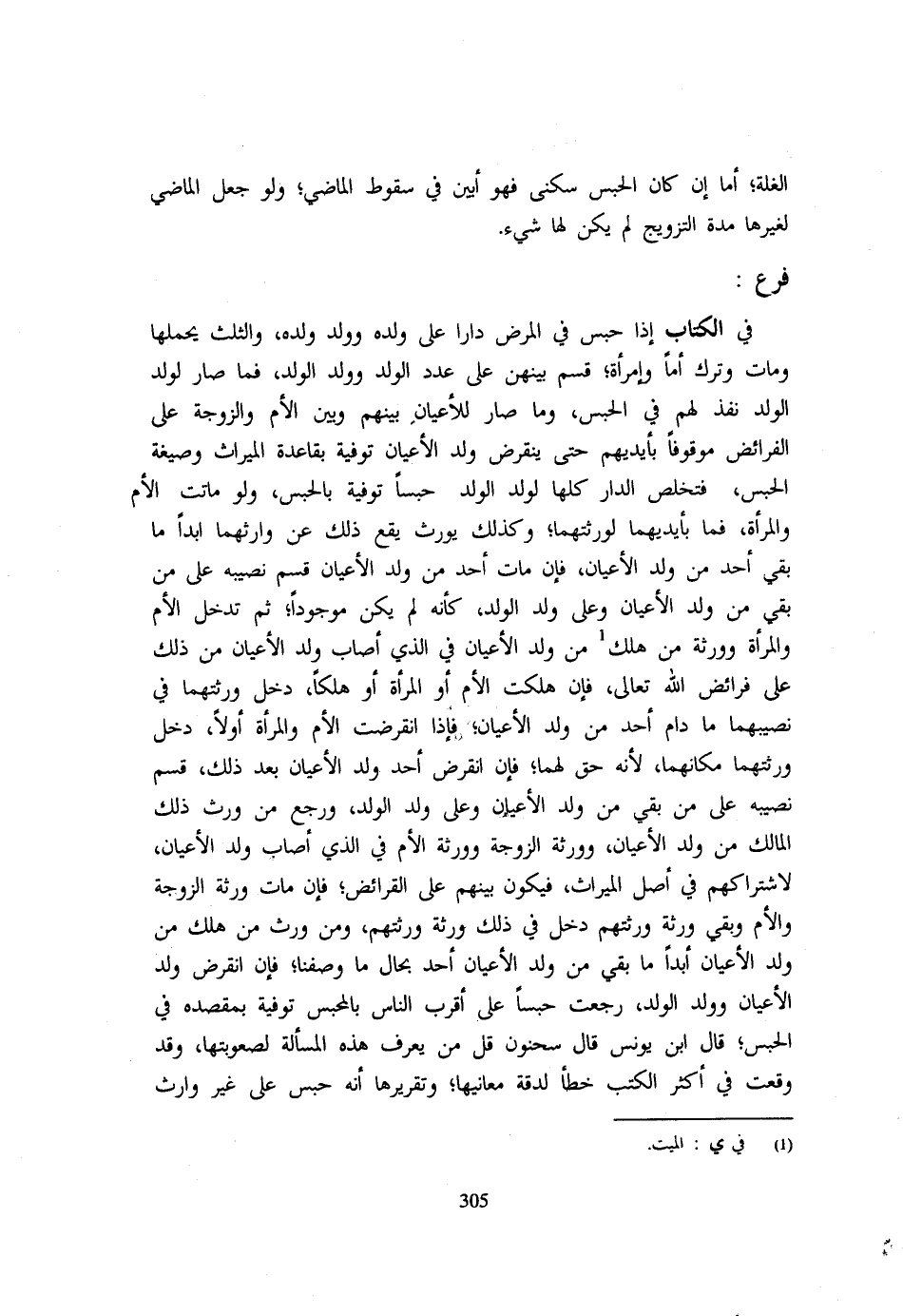 فَرْعٌ - فِي الْكِتَابِ إِذَا حَبَسَ فِي الْمَرَضِ دَارًا عَلَى وَلَدِهِ وَوَلَدِ وَلَدِهِ وَالثُّلُثُ يَحْمِلُهَا وَمَاتَ وَتَرَكَ أُمًّا وَامْرَأَةً قُسِّمَ بَيْنَهُنَّ عَلَى عَدَدِ الْوَلَدِ وَوَلَدِ الْوَلَدِ فَمَا صَارَ لِوَلَدِ الْوَلَدِ نَفَذَ لَهُمْ فِي الْحَبْسِ وَمَا صَارَ لِلْأَعْيَانِ بَيْنَهُمْ وَبَيْنَ الْأُمِّ وَالزَّوْجَةِ عَلَى الْفَرَائِضِ مَوْقُوفًا بِأَيْدِيهِمْ حَتَّى يَنْقَرِضَ وَلَدُ الْأَعْيَانِ تَوْفِيَةً بِقَاعِدَةِ الْمِيرَاثِ وَصِيغَةِ الْحَبْسِ فَتَخْلُصُ الدَّارُ كُلُّهَا لَوَلَدِ الْوَلَدِ حَبْسًا تَوْفِيَةً بِالْحَبْسِ وَلَوْ مَاتَتِ الْأُمُّ وَالْمَرْأَةُ فَمَا بِأَيْدِيهِمَا لِوَرَثَتِهِمَا وَكَذَلِكَ يُوَرَّثُ يَقَعُ ذَلِكَ عَنْ وَارِثِهِمَا أَبَدًا مَا بَقِيَ أَحَدٌ مِنْ وَلَدِ الْأَعْيَانِ فَإِنْ مَاتَ أَحَدٌ مِنْ وَلَدِ الْأَعْيَانِ قُسِّمَ نَصِيبُهُ عَلَى مَنْ بَقِيَ مِنْ وَلَدِ الْأَعْيَانِ وَعَلَى وَلَدِ الْوَلَدِ كَأَنَّهُ لَمْ يَكُنْ مَوْجُودًا ثُمَّ تَدْخُلُ الْأُمُّ وَالْمَرْأَةُ وَوَرَثَةُ مَنْ هَلَكَ مِنْ وَلَدِ الْأَعْيَانِ فِي الَّذِي أَصَابَ وَلَدُ الْأَعْيَانِ مِنْ ذَلِكَ عَلَى فَرَائِضِ اللَّهِ تَعَالَى فَإِنْ هَلَكَتِ الْأُمُّ أَوِ الْمَرْأَةُ أَوْ هَلَكَا دَخَلَ وَرَثَتُهُمَا فِي نَصِيبِهِمَا مَا دَامَ أَحَدٌ مِنْ وَلَدِ الْأَعْيَانِ فَإِذَا انْقَرَضَتِ الْأُمُّ وَالْمَرْأَةُ أَوَّلًا دَخَلَ وَرَثَتُهُمَا مَكَانَهُمَا لِأَنَّهُ حَقٌّ لَهُمَا فَإِنِ انْقَرَضَ أَحَدُ وَلَدِ الْأَعْيَانِ بَعْدَ ذَلِكَ قُسِّمَ نَصِيبُهُ عَلَى مَنْ بَقِيَ مِنْ وَلَدِ الْأَعْيَانِ وَعَلَى وَلَدِ الْوَلَدِ وَرَجَعَ مَنْ وَرِثَ ذَلِكَ الْمَالِكَ مِنْ وَلَدِ الْأَعْيَانِ وَوَرَثَةِ الزَّوْجَةِ وَوَرَثَةِ الْأُمِّ فِي الَّذِي أَصَابَ وَلَدُ الْأَعْيَانِ لِاشْتِرَاكِهِمْ فِي أَصْلِ الْمِيرَاث فَيكون بَينهم على القرائض فَإِنْ مَاتَ وَرَثَةُ الزَّوْجَةِ وَالْأُمِّ وَبَقِيَ وَرَثَةُ وَرَثَتِهِمْ دَخَلَ فِي ذَلِكَ وَرَثَةُ وَرَثَتِهِمْ وَمَنْ وَرِثَ مَنْ هَلَكَ مِنْ وَلَدِ الْأَعْيَانِ أَبَدًا مَا بَقِيَ مِنْ وَلَدِ الْأَعْيَانِ أَحَدٌ بِحَالِ مَا وَصَفْنَا فَإِنِ انْقَرَضَ وَلَدُ الْأَعْيَانِ وَوَلَدُ الْوَلَدِ رَجَعَتْ حَبْسًا عَلَى أَقْرَبِ النَّاسِ بِالْمُحْبِسِ تَوْفِيَةً بِمَقْصِدِهِ فِي الْحَبْسِ قَالَ ابْنُ يُونُسَ قَالَ سَحْنُونٌ قَلَّ مَنْ يَعْرِفُ هَذِهِ الْمَسْأَلَةَ لِصُعُوبَتِهَا وَقَدْ وَقَعَتْ فِي أَكْثَرِ الْكُتُبِ خَطَأٍ لِدِقَّةِ مَعَانِيهَا وَتَقْرِيرُهَا أَنَّهُ حَبْسٌ عَلَى غَيْرِ وَارِث