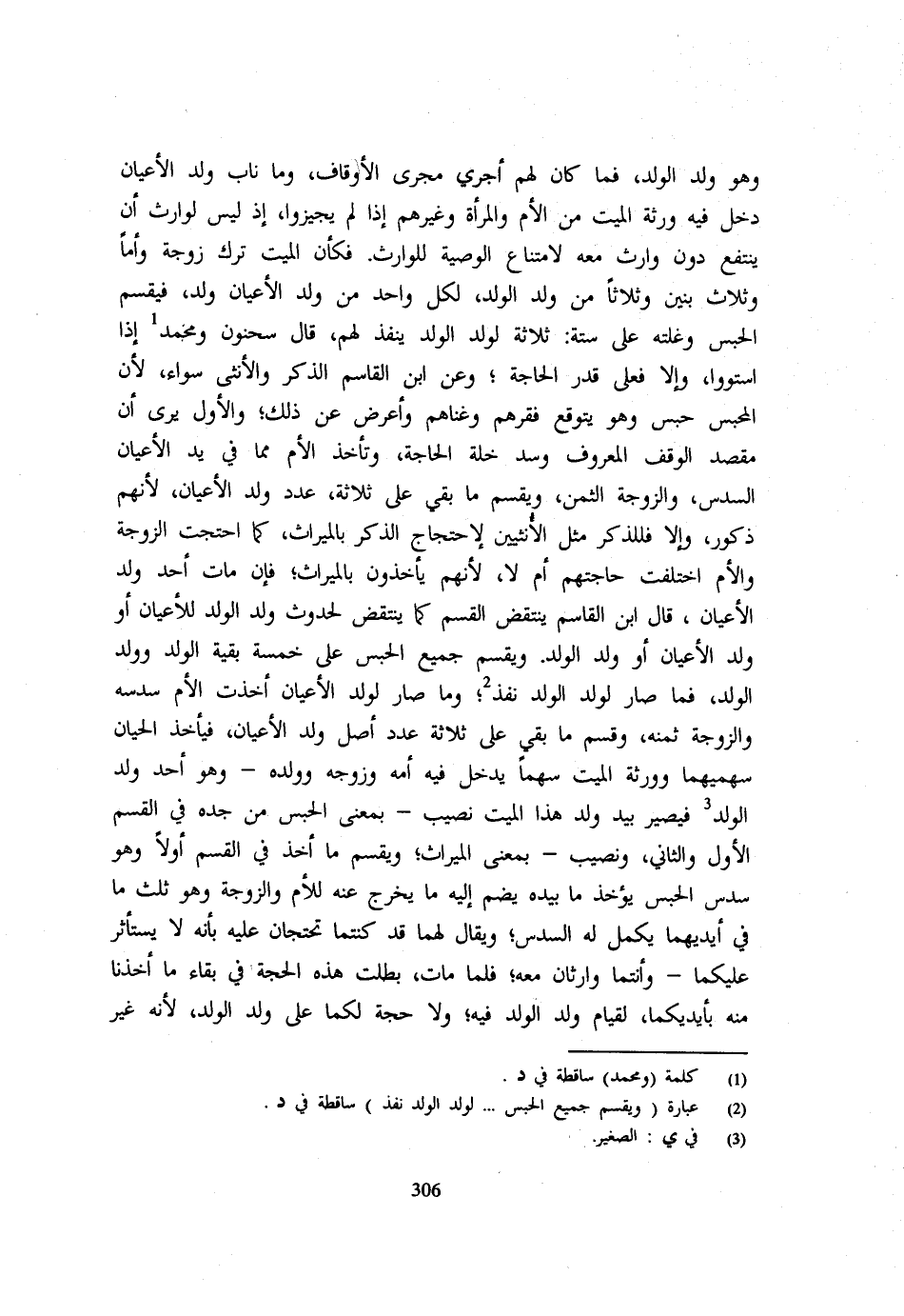 وَهُوَ وَلَدُ الْوَلَدِ فَمَا كَانَ لَهُمْ أُجْرِيَ مَجْرَى الْأَوْقَافِ وَمَا نَابَ وَلَدَ الْأَعْيَانِ دَخَلَ فِي وَرَثَة الْمَيِّت من الْأُم وَالْمَرْأَة وَغَيرهم إِذا لَمْ يُجِيزُوا إِذْ لَيْسَ لِوَارِثٍ أَنْ يَنْتَفِعَ دُونَ وَارِثٍ مَعَهُ لِامْتِنَاعِ الْوَصِيَّةِ لِلْوَارِثِ فَكَأَنَّ الْمَيِّتَ تَرَكَ زَوْجَةً وَأُمًّا وَثَلَاثَ بَنِينَ وَثَلَاثًا مَنْ وَلَدِ الْوَلَدِ لِكُلِّ وَاحِدٍ مِنْ وَلَدِ الْأَعْيَانِ وَلَدٌ فَيُقَسَّمُ الْحَبْسُ وَغَلَّتُهُ عَلَى سِتَّةٍ ثَلَاثَةٌ لَوَلَدِ الْوَلَدِ يَنْفُذُ لَهُمْ قَالَ سَحْنُونٌ وَمُحَمَّدٌ إِذَا اسْتَوَوْا وَإِلَّا فَعَلَى قَدْرِ الْحَاجَةِ وَعَنِ ابْنِ الْقَاسِمِ الذَّكَرُ وَالْأُنْثَى سَوَاءٌ لِأَنَّ الْمُحْبِسَ حَبَسَ وَهُوَ يَتَوَقَّعُ فَقْرَهُمْ وَغِنَاهُمْ وَأَعْرَضَ عَنْ ذَلِكَ وَالْأَوَّلُ يَرَى أَنَّ مَقْصِدَ الْوَقْفِ الْمَعْرُوفُ وَسَدُّ خَلَّةِ الْحَاجَةِ وَتَأْخُذُ الْأُمُّ مِمَّا فِي يَدِ الْأَعْيَانِ السُّدُسَ وَالزَّوْجَةُ الثُّمُنَ وَيُقَسَّمُ مَا بَقِيَ عَلَى ثَلَاثَةٍ عَدَدِ وَلَدِ الْأَعْيَانِ لِأَنَّهُمْ ذُكُورٌ وَإِلَّا فَلِلذَّكَرِ مِثْلُ الْأُنْثَيَيْنِ لِاحْتِجَاجِ الذَّكَرِ بِالْمِيرَاثِ كَمَا احْتَجَّتِ الزَّوْجَةُ وَالْأُمُّ اخْتَلَفَتْ حَاجَتُهُمْ أَمْ لَا لِأَنَّهُمْ يَأْخُذُونَ بِالْمِيرَاثِ فَإِنْ مَاتَ أَحَدُ وَلَدِ الْأَعْيَانِ قَالَ ابْنُ الْقَاسِمِ يَنْتَقِضُ الْقَسْمُ كَمَا يَنْتَقِضُ لِحُدُوثِ وَلَدِ الْوَلَدِ لِلْأَعْيَانِ أَوْ وَلَدِ الْأَعْيَانِ أَوْ وَلَدِ الْوَلَدِ وَيُقَسَّمُ جَمِيعُ الْحَبْسِ عَلَى خَمْسَةٍ بَقِيَّةِ الْوَلَدِ وَوَلَدِ الْوَلَدِ فَمَا صَارَ لِوَلَدِ الْوَلَدِ نَفَذَ وَمَا صَارَ لِوَلَدِ الْأَعْيَانِ أَخَذَتِ الْأُمُّ سُدُسَهُ وَالزَّوْجَة ثمنه وَقسم مَا بَقِي على ثَلَاثَة عدد أَصْلِ وَلَدِ الْأَعْيَانِ فَيَأْخُذُ الْحَيَّانِ سَهْمَيْهِمَا وَوَرَثَةُ الْمَيِّتِ سَهْمًا يَدْخُلُ فِيهِ أُمُّهُ وَزَوْجُهُ وَوَلَدُهُ - وَهُوَ أَحَدُ وَلَدِ الْوَلَدِ فَيَصِيرُ بِيَدِ وَلَدِ هَذَا الْمَيِّتِ نَصِيبٌ - بِمَعْنَى الْحَبْسِ مِنْ جَدِّهِ فِي الْقَسْمِ الْأَوَّلِ وَالثَّانِي وَنَصِيبٌ - بِمَعْنَى الْمِيرَاثِ وَيُقَسَّمُ مَا أُخِذَ فِي الْقَسْمِ أَوَّلًا وَهُوَ سُدُسُ الْحَبْسِ يُؤْخَذُ مَا بِيَدِهِ يُضَمُّ إِلَيْهِ مَا يَخْرُجُ عَنْهُ لِلْأُمِّ وَالزَّوْجَةِ وَهُوَ ثُلُثُ مَا فِي أَيْدِيهِمَا يُكْمَلُ لَهُ السُّدُسُ وَيُقَالُ لَهُمَا قَدْ كُنْتُمَا تَحْتَجَّانِ عَلَيْهِ بِأَنَّهُ لَا يَسْتَأْثِرُ عَلَيْكُمَا - وَأَنْتُمَا وَارِثَانِ مَعَهُ فَلَمَّا مَاتَ بَطَلَتْ هَذِهِ الْحُجَّةُ فِي بَقَاءِ مَا أَخَذْنَا مِنْهُ بِأَيْدِيكُمَا لِقِيَامِ وَلَدِ الْوَلَدِ فِيهِ وَلَا حُجَّةَ لَكُمَا عَلَى وَلَدِ الْوَلَدِ لِأَنَّهُ غَيْرُ