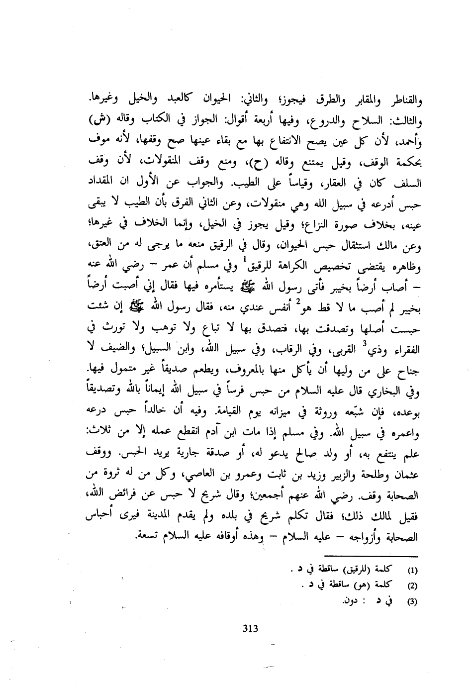والقناطر والمقابر والطرق فَيجوز وَالثَّانِي الْحَيَوَان كَالْعَبْدِ وَالْخَيْلِ وَغَيْرِهَا وَالثَّالِثُ السِّلَاحُ وَالدُّرُوعُ وَفِيهَا أَرْبَعَةُ أَقْوَالٍ الْجَوَازُ فِي الْكِتَابِ وَقَالَهُ (ش) وَأَحْمَدُ لِأَنَّ كُلَّ عَيْنٍ يَصِحُّ الِانْتِفَاعُ بِهَا مَعَ بَقَاءِ عَيْنِهَا صَحَّ وَقْفُهَا لِأَنَّهُ مُوفٍ بِحِكْمَةِ الْوَقْفِ وَقِيلَ يَمْتَنِعُ وَقَالَهُ (ح) وَمَنَعَ وَقْفَ الْمَنْقُولَاتِ لِأَنَّ وَقْفَ السَّلَفِ كَانَ فِي الْعَقَارِ وَقِيَاسًا عَلَى الطِّيبِ وَالْجَوَابُ عَنِ الْأَوَّلِ أَنَّ الْمِقْدَادَ حَبَسَ أَدْرُعَهُ فِي سَبِيلِ اللَّهِ وَهِيَ مَنْقُولَاتٌ وَعَنِ الثَّانِي الْفَرْقُ بِأَنَّ الطِّيبَ لَا يَبْقَى عَيْنُهُ بِخِلَافِ صُورَةِ النِّزَاعِ وَقِيلَ يَجُوزُ فِي الْخَيْلِ وَإِنَّمَا الْخِلَافُ فِي غَيْرِهَا وَعَنْ مَالِكٍ اسْتِثْقَالُ حَبْسِ الْحَيَوَانِ وَقَالَ فِي الرَّقِيقِ مَنْعَهُ مَا يُرْجَى لَهُ مِنِ الْعِتْقِ وَظَاهِرُهُ يَقْتَضِي تَخْصِيصَ الْكَرَاهَةِ لِلرَّقِيقِ وَفِي مُسْلِمٍ أَنَّ عُمَرَ - رَضِيَ اللَّهُ عَنْهُ - أَصَابَ أَرْضًا بِخَيْبَرَ فَأَتَى رَسُولَ اللَّهِ - صَلَّى اللَّهُ عَلَيْهِ وَسَلَّم َ - يَسْتَأْمِرُهُ فِيهَا فَقَالَ إِنِّي أَصَبْتُ أَرْضًا بِخَيْبَرَ لم أصب مَا لَا قَطُّ هُوَ أَنْفَسُ عِنْدِي مِنْهُ فَقَالَ رَسُولُ اللَّهِ - صَلَّى اللَّهُ عَلَيْهِ وَسَلَّم َ - إِنْ شِئْتَ حَبَسْتَ أَصْلَهَا وَتَصَدَّقْتَ بِهَا فَتَصَدَّقَ بِهَا لَا تُبَاعُ وَلَا تُوهَبُ وَلَا تُورَّثُ فِي الْفُقَرَاءِ وَذِي الْقُرْبَى وَفِي الرِّقَابِ وَفِي سَبِيلِ اللَّهِ وَابْنِ السَّبِيلِ وَالضَّيْفِ لَا جُنَاحَ عَلَى مَنْ وَلِيَهَا أَنْ يَأْكُلَ مِنْهَا بِالْمَعْرُوفِ وَيُطْعِمَ صَدِيقًا غَيْرَ مُتَمَوِّلٍ فِيهَا وَفِي الْبُخَارِيِّ قَالَ - صَلَّى اللَّهُ عَلَيْهِ وَسَلَّم َ - مَنْ حَبَسَ فَرَسًا فِي سَبِيلِ اللَّهِ إِيمَانًا بِاللَّهِ وَتَصْدِيقًا بِوَعْدِهِ فَإِنَّ شِبَعَهُ وَرَوَثَهُ فِي مِيزَانِهِ يَوْمَ الْقِيَامَةِ وَفِيهِ أَنَّ خَالِدًا حَبَسَ دِرْعَهُ وَأَعْمَرَهُ فِي سَبِيلِ اللَّهِ وَفِي مُسْلِمٍ إِذَا مَاتَ ابْنُ آدَمَ انْقَطَعَ عَمَلُهُ إِلَّا مِنْ ثَلَاثٍ عِلْمٍ يُنْتَفَعُ بِهِ أَوْ وَلَدٍ صَالِحٍ يَدْعُو لَهُ أَوْ صَدَقَةٍ جَارِيَةٍ يُرِيدُ الْحَبْسَ وَوَقَفَ عُثْمَانُ وَطَلْحَةُ وَالزُّبَيْرُ وَزَيْدُ بْنُ ثَابت وَعَمْرو بن العَاصِي وَكُلُّ مَنْ لَهُ ثَرْوَةٌ مِنَ الصَّحَابَةِ وَقَفَ رَضِي اللَّهُمَّ عَنْهُمْ أَجْمَعِينَ وَقَالَ شُرَيْحٌ لَا حَبْسَ عَنْ فَرَائِضِ اللَّهِ فَقِيلَ لِمَالِكٍ ذَلِكَ فَقَالَ تَكَلَّمَ شُرَيْحٌ فِي بَلَدِهِ وَلَمْ يَقْدُمِ الْمَدِينَةَ فَيَرَى أحباس الصَّحَابَة وأزواجه - صَلَّى اللَّهُ عَلَيْهِ وَسَلَّم َ - وَهَذِه أوقافه - صَلَّى اللَّهُ عَلَيْهِ وَسَلَّم َ - تِسْعَة