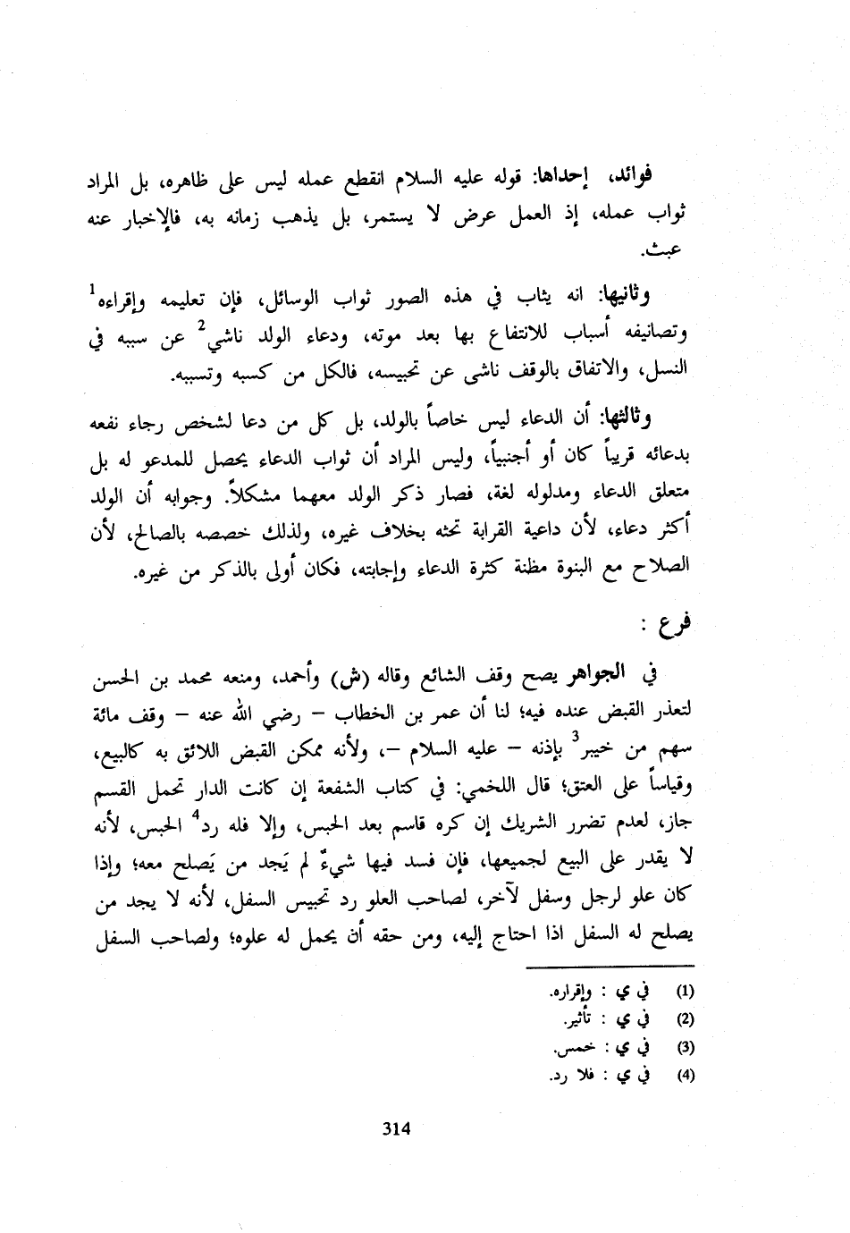 فَوَائِد - إِحْدَاهَا قَوْله - صَلَّى اللَّهُ عَلَيْهِ وَسَلَّم َ - انْقَطَعَ عَمَلُهُ لَيْسَ عَلَى ظَاهِرِهِ بَلِ الْمُرَادُ ثَوَابُ عَمَلِهِ إِذِ الْعَمَلُ عَرَضٌ لَا يَسْتَمِرُّ بَلْ يَذْهَبُ زَمَانُهُ بِهِ فَالْإِخْبَارُ عَنْهُ عَبَثٌ وَثَانِيهَا أَنَّهُ يُثَابُ فِي هَذِهِ الصُّوَرِ ثَوَابَ الْوَسَائِلِ فَإِنَّ تَعْلِيمَهُ وَإِقْرَاءَهُ وَتَصَانِيفَهُ أَسْبَابٌ لِلِانْتِفَاعِ بهَا بعد مَوته وَدُعَاء الْوَلَد ناشي عَن سَببه فِي النَّسْل والاتفاق بِالْوَقْفِ ناشى عَن تحبيسه فَالْكل فِي حَبسه وتسببه وَثَالِثهَا أَن الدُّعَاء لَيْسَ خَالِصا بِالْوَلَدِ بَلْ كُلُّ مَنْ دَعَا لِشَخْصٍ رَجَاءَ نَفْعِهِ بِدُعَائِهِ قَرِيبًا كَانَ أَوْ أَجْنَبِيًّا وَلَيْسَ الْمُرَادُ أَنَّ ثَوَابَ الدُّعَاءِ يَحْصُلُ لِلْمَدْعُوِّ لَهُ بَلْ مُتَعَلِّقُ الدُّعَاءِ وَمَدْلُولُهُ لُغَةً فَصَارَ ذِكْرُ الْوَلَدِ مَعَهُمَا مُشْكِلًا وَجَوَابُهُ أَنَّ الْوَلَدَ أَكْثَرُ دُعَاءً لِأَنَّ دَاعِيَةَ الْقَرَابَةِ تَحُثُّهُ بِخِلَافِ غَيْرِهِ وَلِذَلِكَ خَصَّصَهُ بِالصَّالِحِ لِأَنَّ الصَّلَاحَ مَعَ الْبُنُوَّةِ نظمة كَثْرَةِ الدُّعَاءِ وَإِجَابَتِهِ فَكَانَ أَوْلَى بِالذِّكْرِ مِنْ غَيْرِهِ